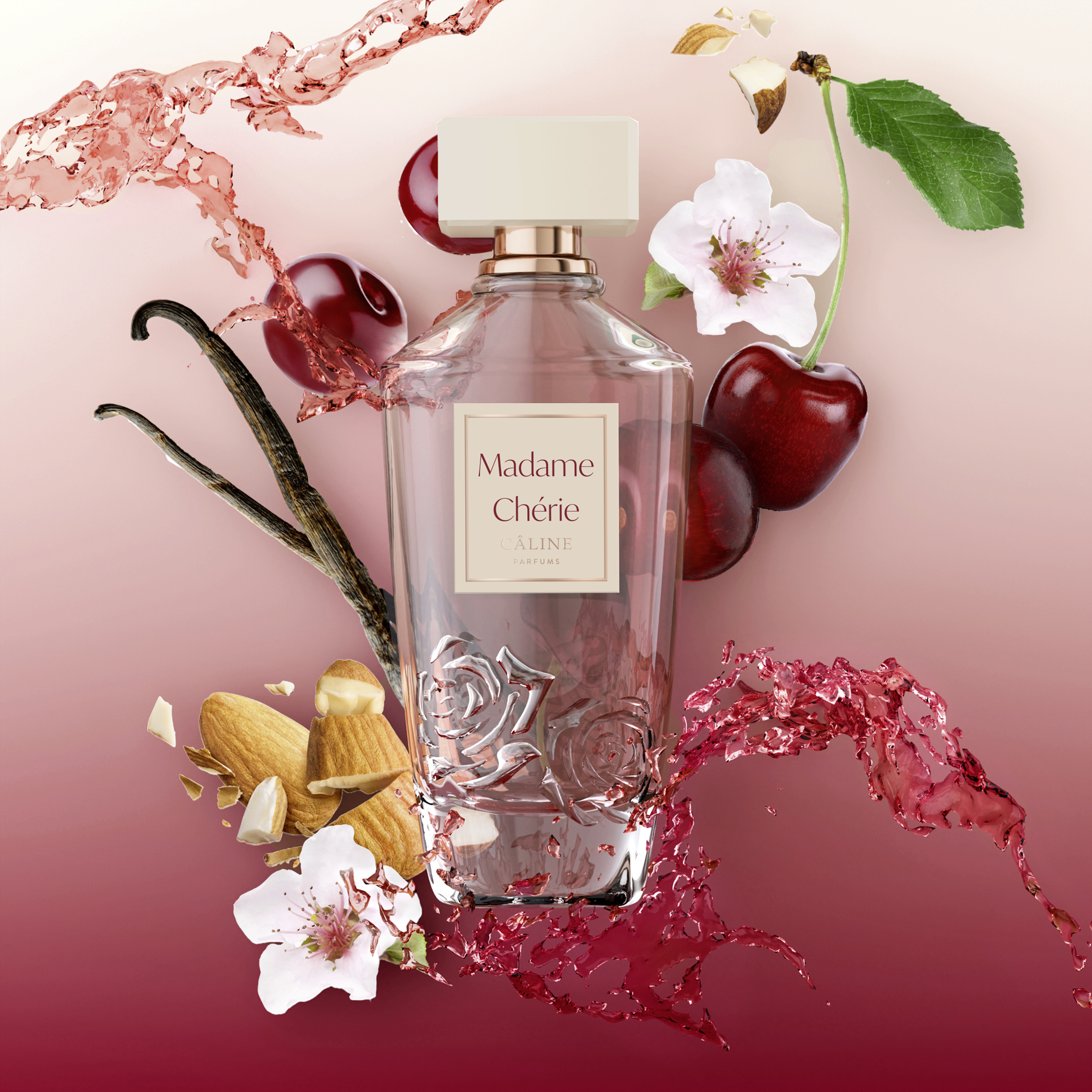 CÂLINE Madame Chérie Eau de Parfum je smyslná dámská vůně, ve které se snoubí jemné mandlové tóny s ovocnou sladkostí černé třešně a omamnou vůní jasmínu. Výsledkem je intenzivní a ženská vonná kompozice, která okouzlí hned při prvním přivonění a zanechá nezapomenutelný dojem.