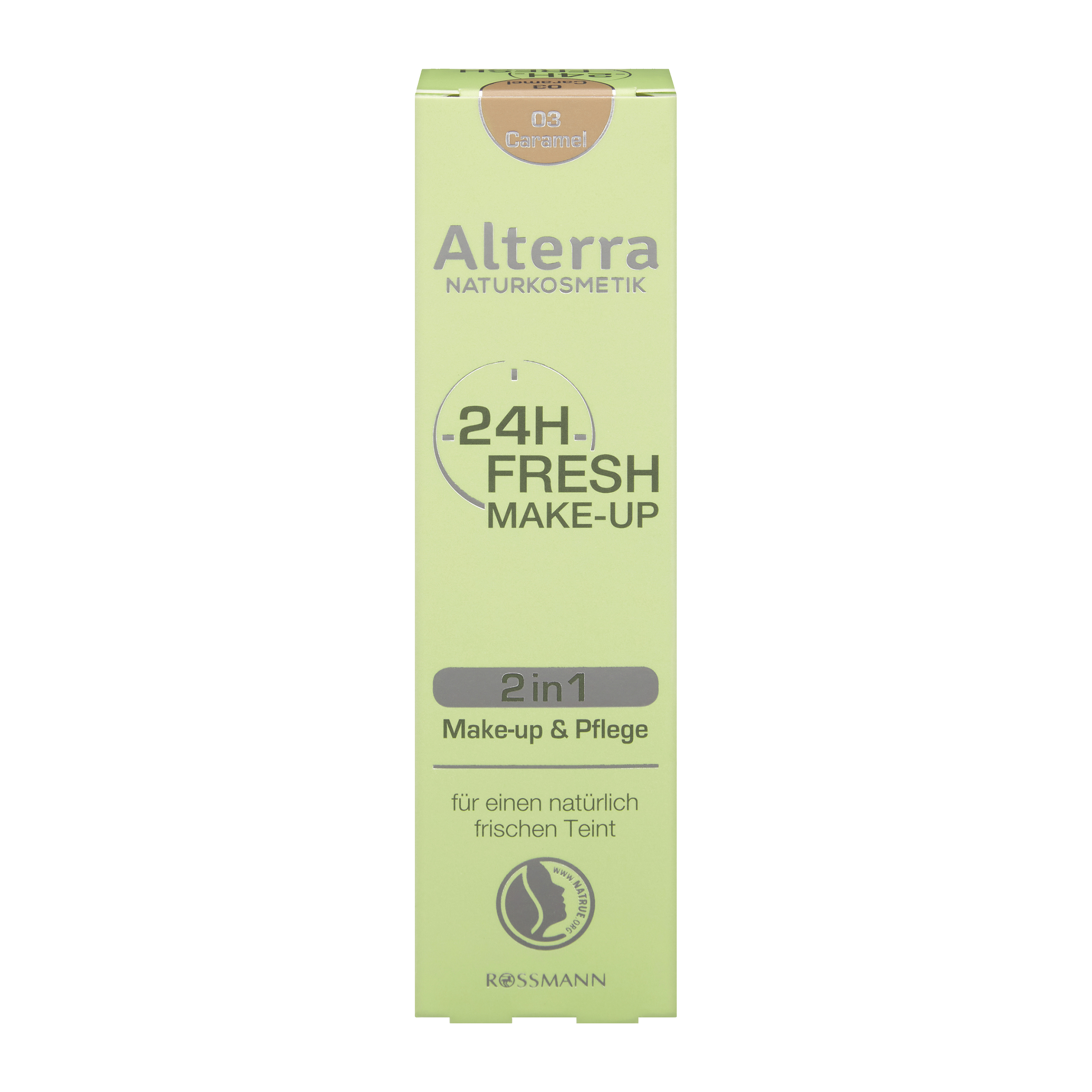 Alterra 24h Fresh Make-Up kryje mírné zarudnutí a hrbolky a nechá vaši pleť přirozeně zářivou. Kombinace cenných ingrediencí, jako je bio jojobový olej, bio sójový olej a bio máslo cupuacu posiluje přirozenou bariérovou funkci, zabraňuje vysoušení pokožky a poskytuje 24hodinovou vlhkost.