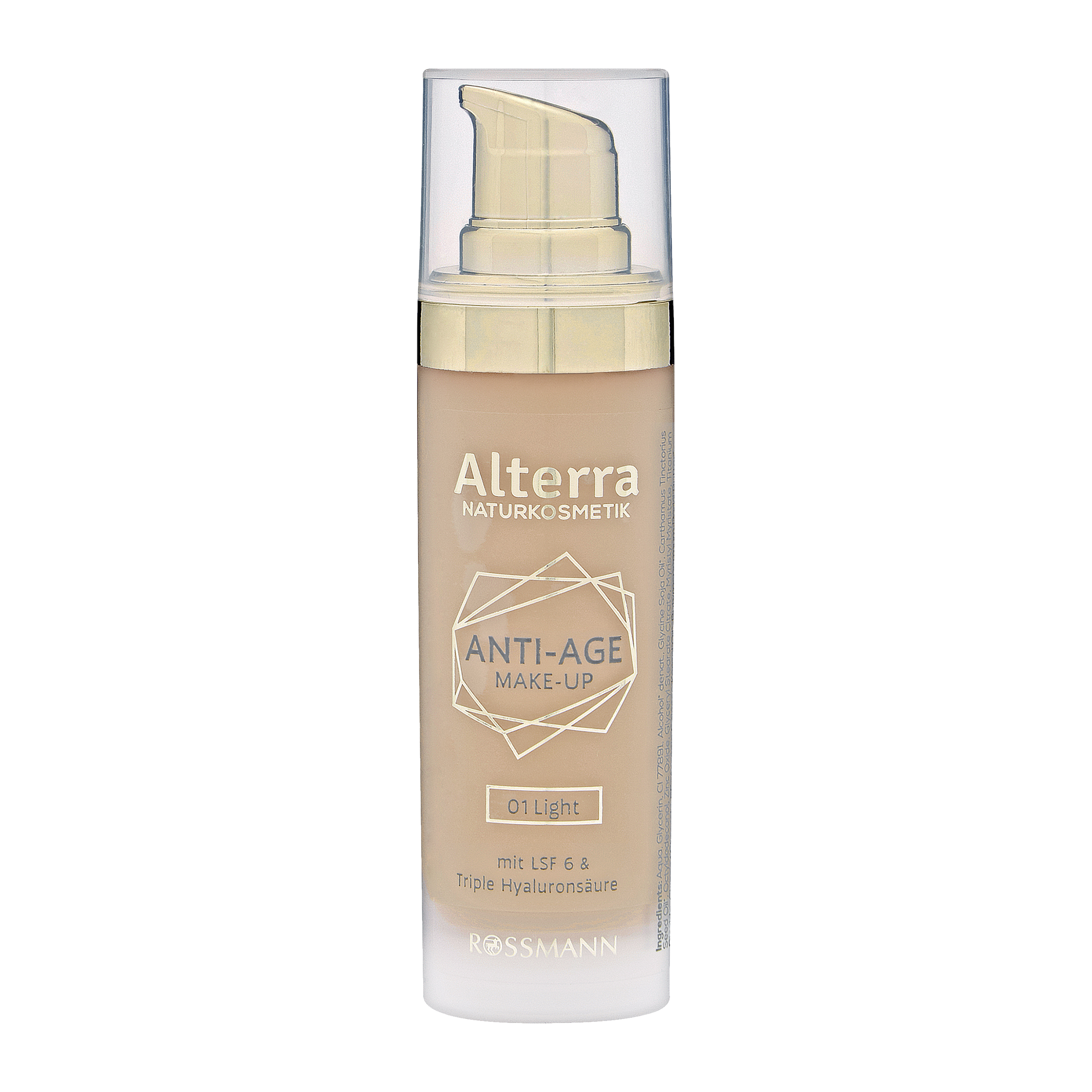 Přírodní kosmetika Alterra anti-age make-up s trojitou kyselinou hyaluronovou a SPF 6. Spolehlivě kryje nedokonalosti a chrání pleť před slunečním zářením díky ochrannému faktoru 6.