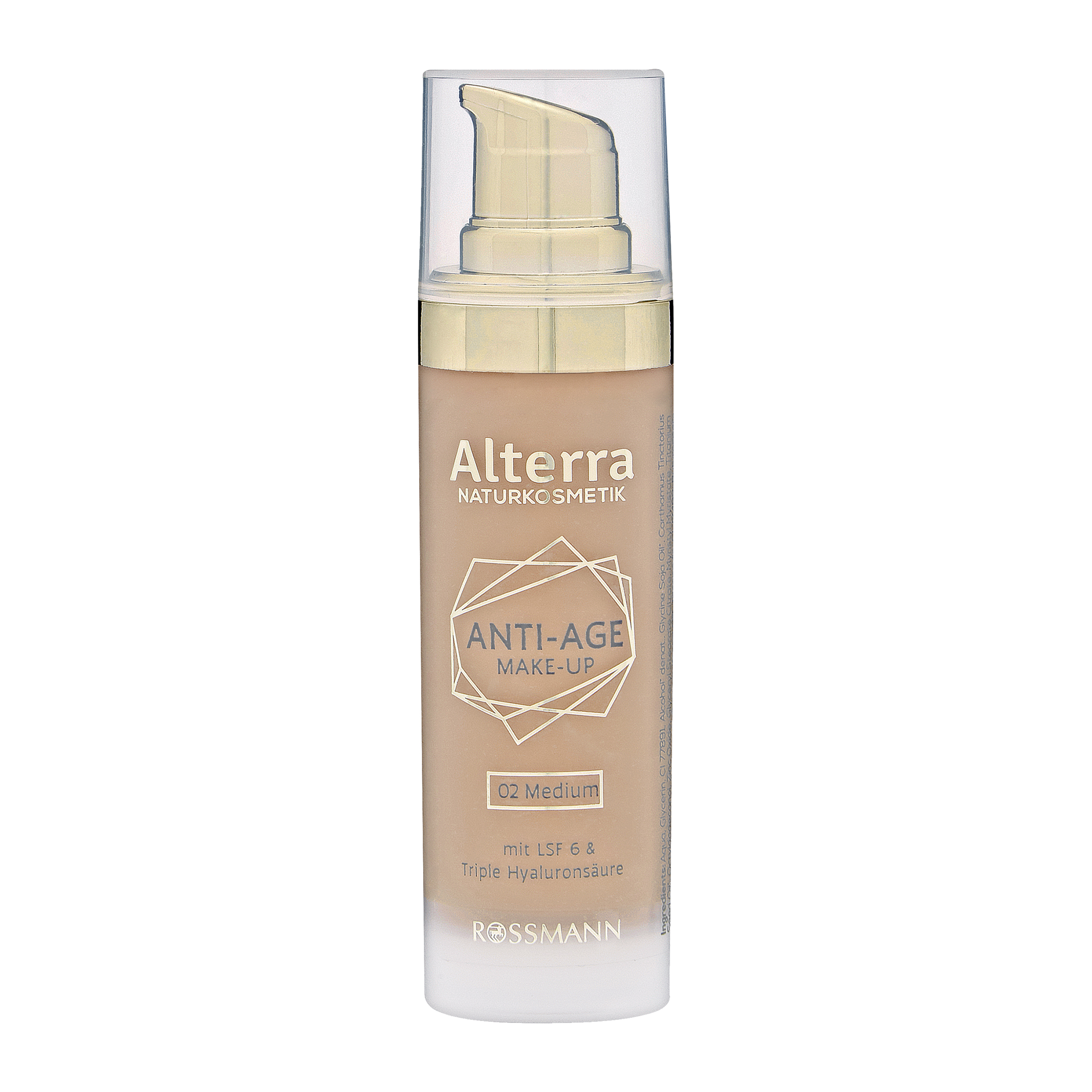 Přírodní kosmetika Alterra anti-age make-up s trojitou kyselinou hyaluronovou a SPF 6. Spolehlivě kryje nedokonalosti a chrání pleť před slunečním zářením díky ochrannému faktoru 6.