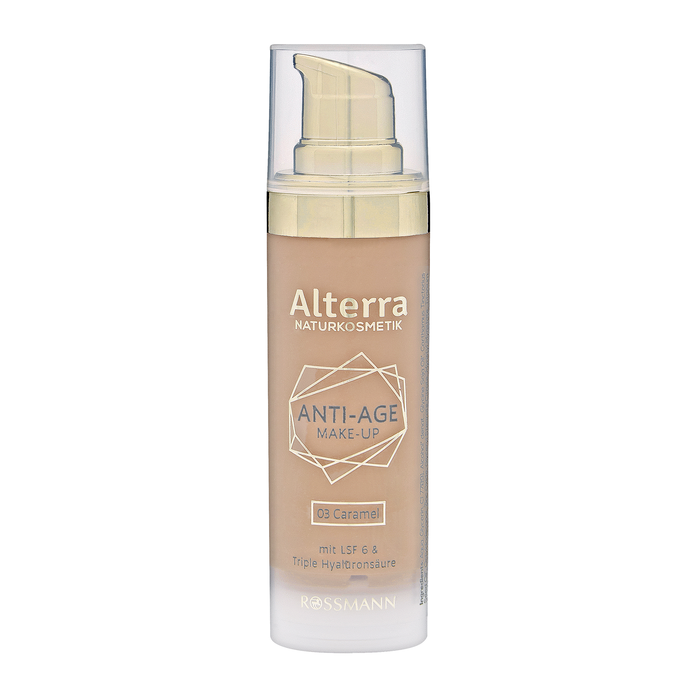 Přírodní kosmetika Alterra anti-age make-up s trojitou kyselinou hyaluronovou a SPF 6. Spolehlivě kryje nedokonalosti a chrání pleť před slunečním zářením díky ochrannému faktoru 6.