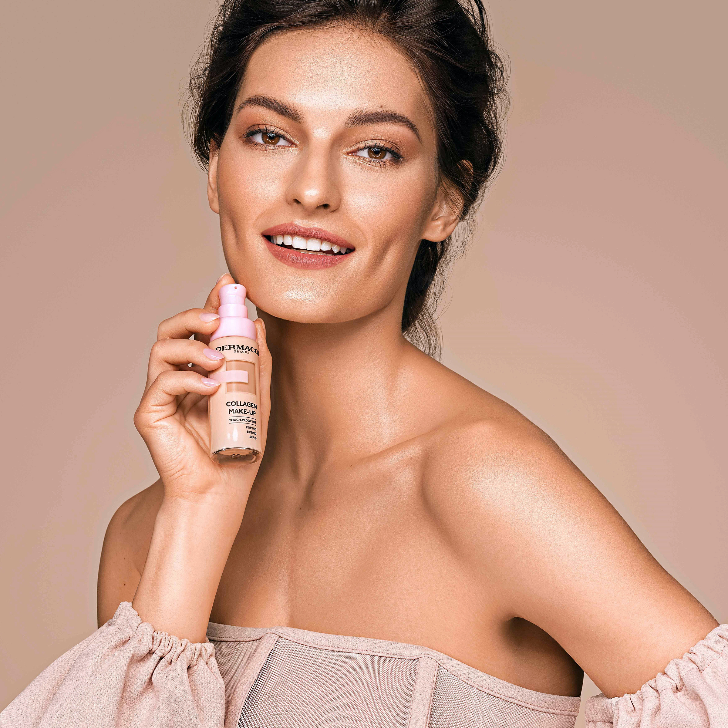 Příjemný velmi lehký make-up s obsahem kolagenu a středně krycí schopností se jednoduše aplikuje a roztírá. S praktickou pumpičkou. Zanechává sametový pocit, zmatní pleť a zahladí její nedostatky. Neucpává póry a zajišťuje pleti prodyšnost. S ochranným faktorem SPF 10. Je odolný proti otěru až 16 hodin po aplikaci. Vytvoří film, který silně přilne ke keratinové vrstvě pokožky. Má schopnost zadržovat vodu a tím pokožku hydratuje. Vyhlazuje suchou vrásčitou pokožku. Posiluje soudržnost buněk pokožky. Díky vysokému obsahu aminokyselin (zvláště hydroxyprolinu) výborně zvyšuje hydrataci kůže, elasticitu a tonus. S obsahem vitamínu E a Kalpariane.