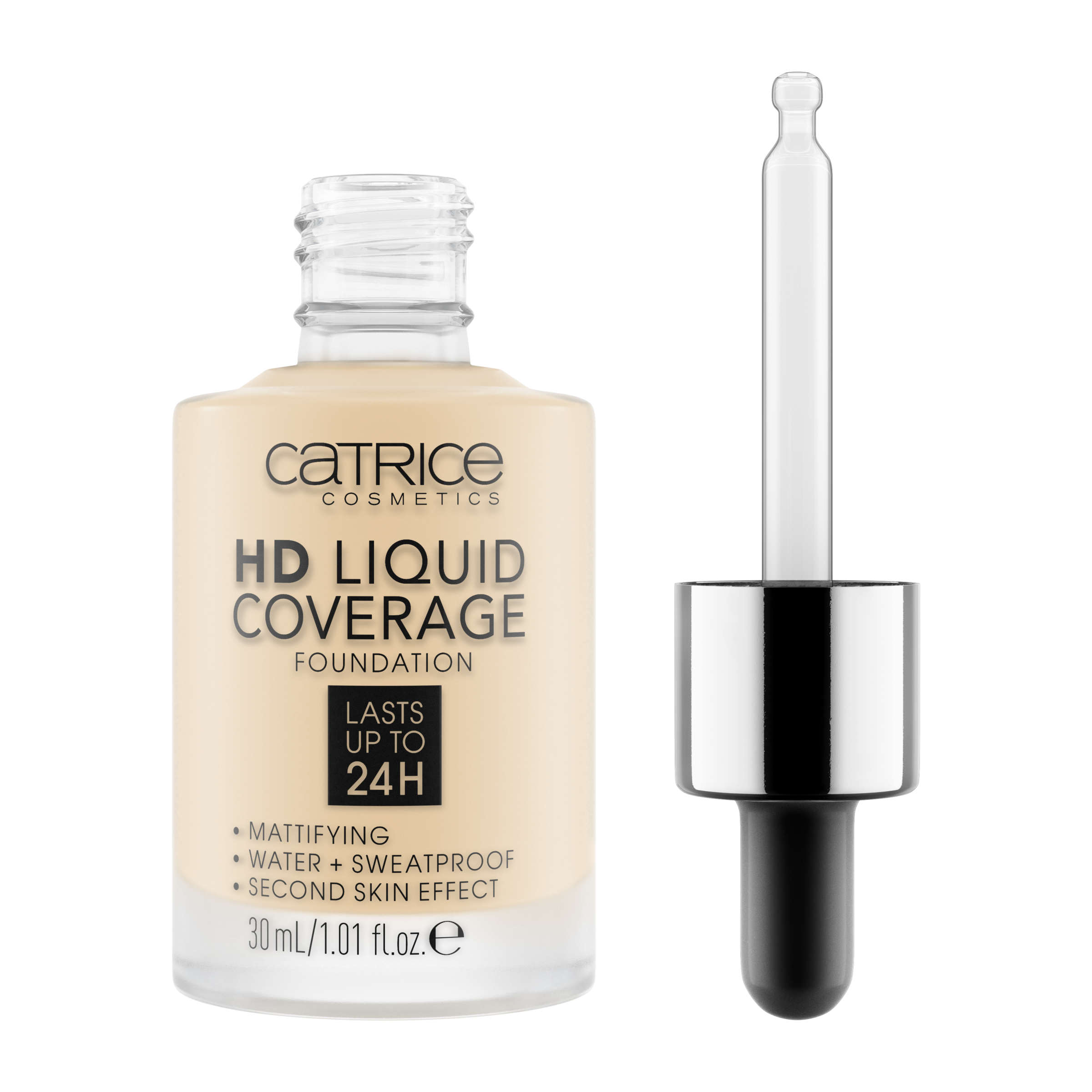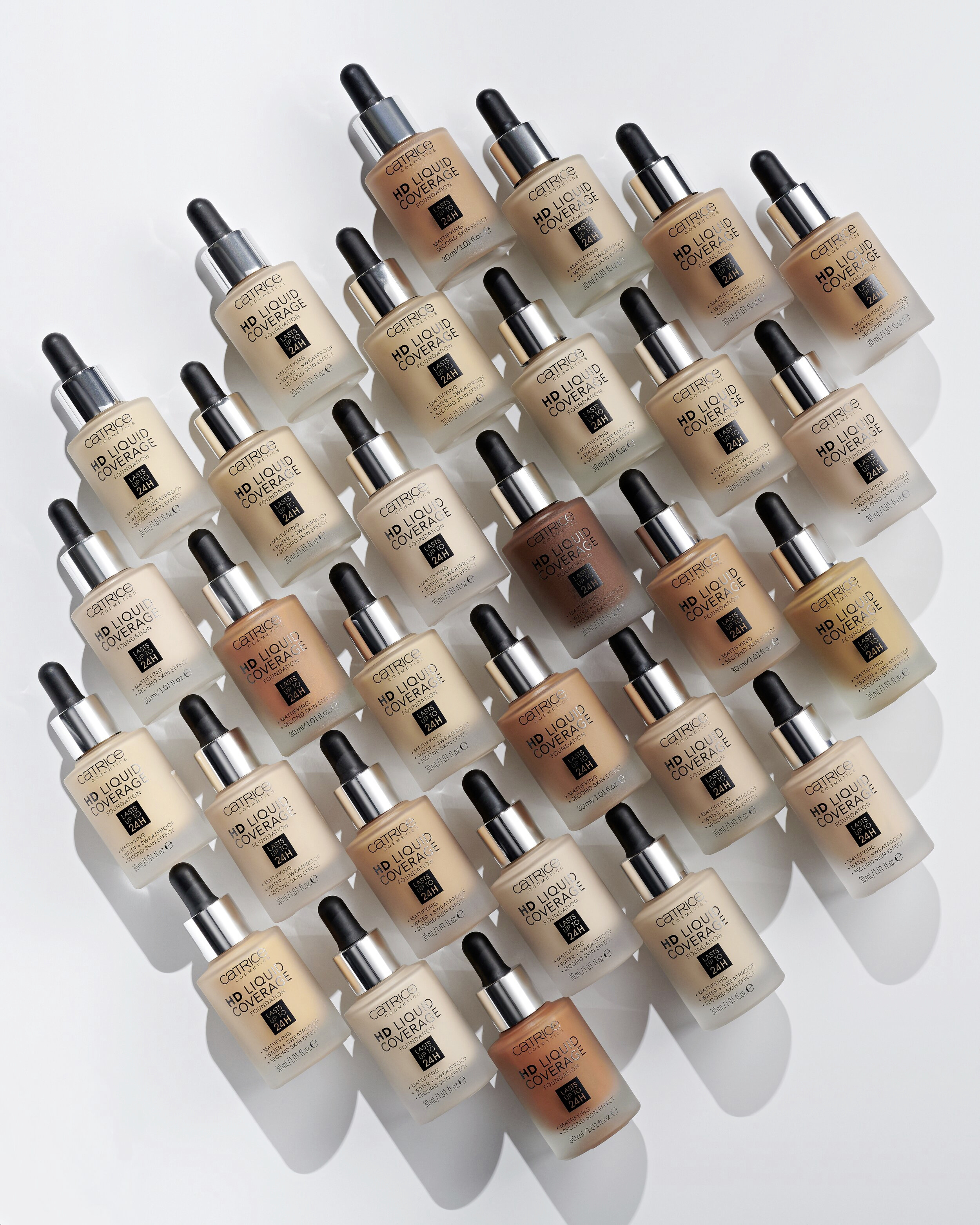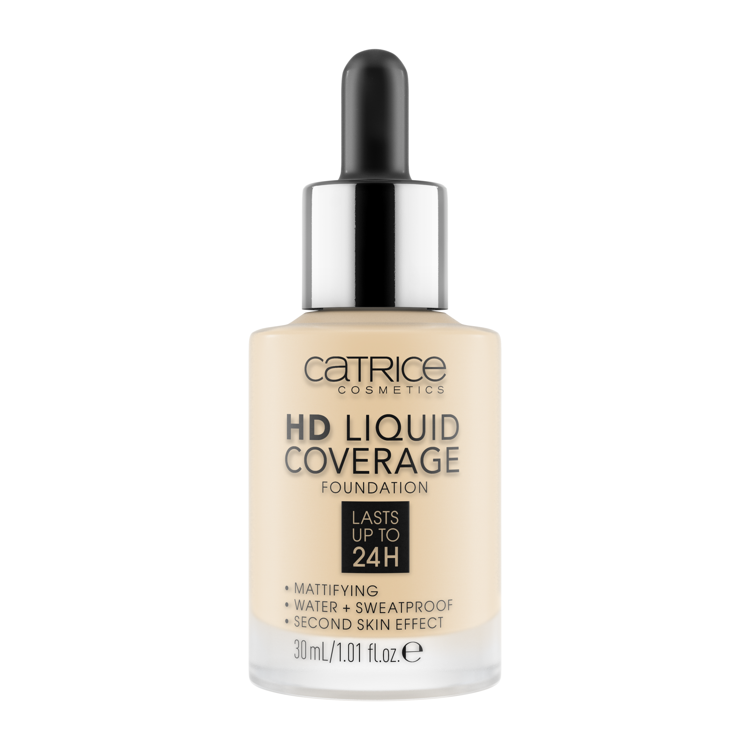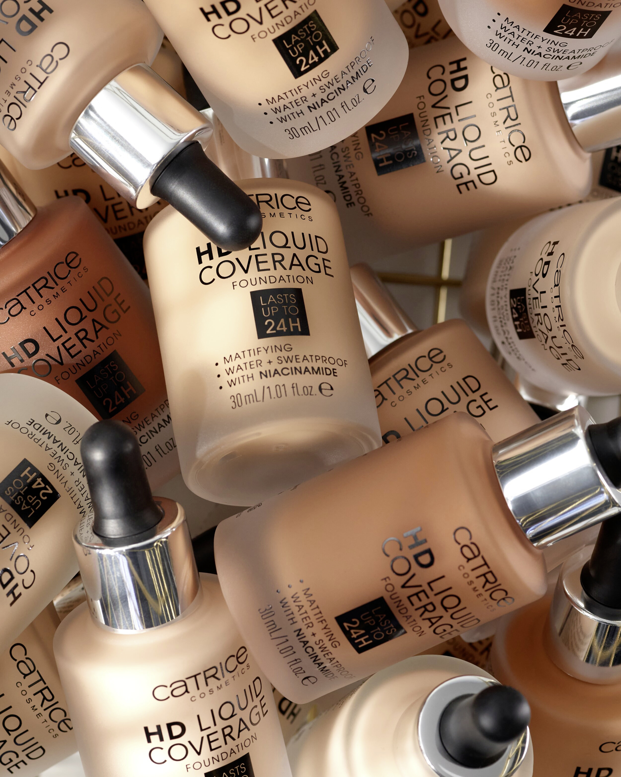 Efekt druhé pleti: Make-up HD Liquid Coverage působí jako druhá pleť, kterou nechává sametově matnou a sjednocenou – až na 24 hodin! Ultra lehká tekutá textura s vysokým a zároveň přirozeně působícím krytím zakrývá nedokonalosti, vyživuje pomocí niacinamidu a je odolná vůči vodě a potu a neobtiskává se. Složení neobsahuje parabeny ani mikroplasty.