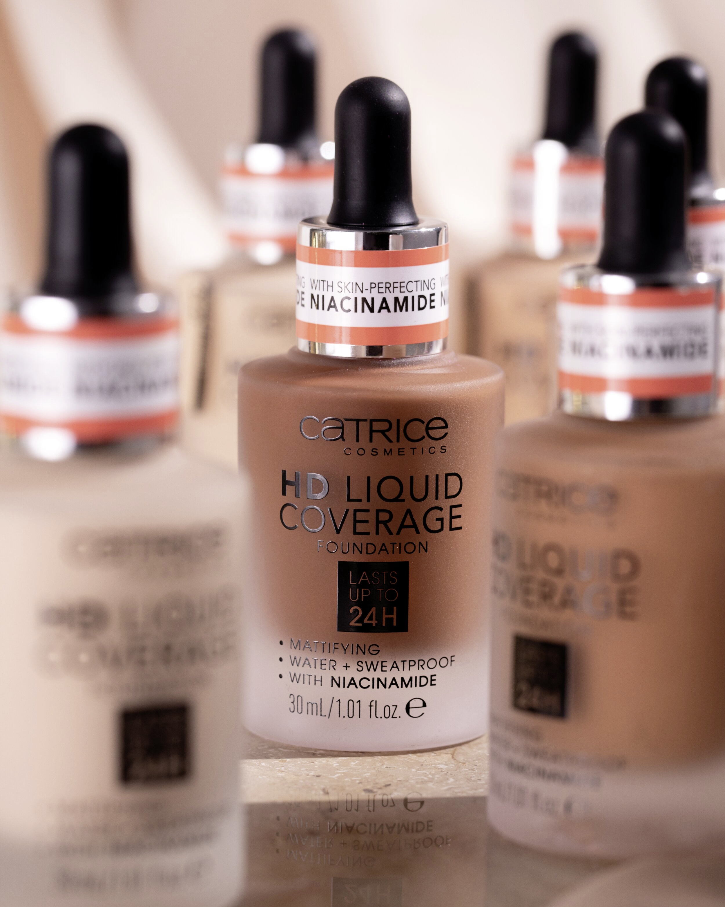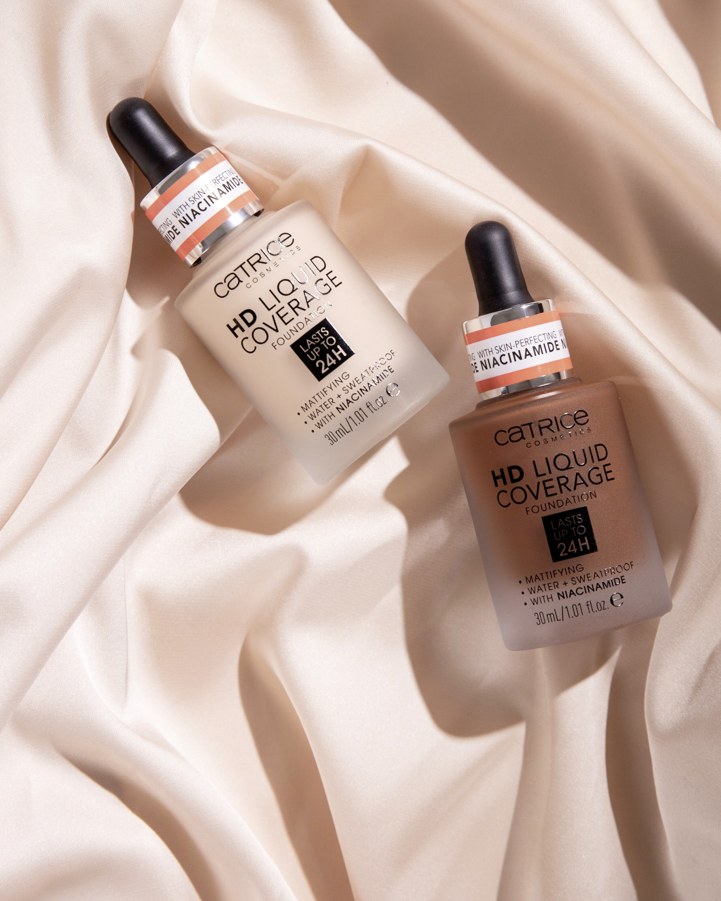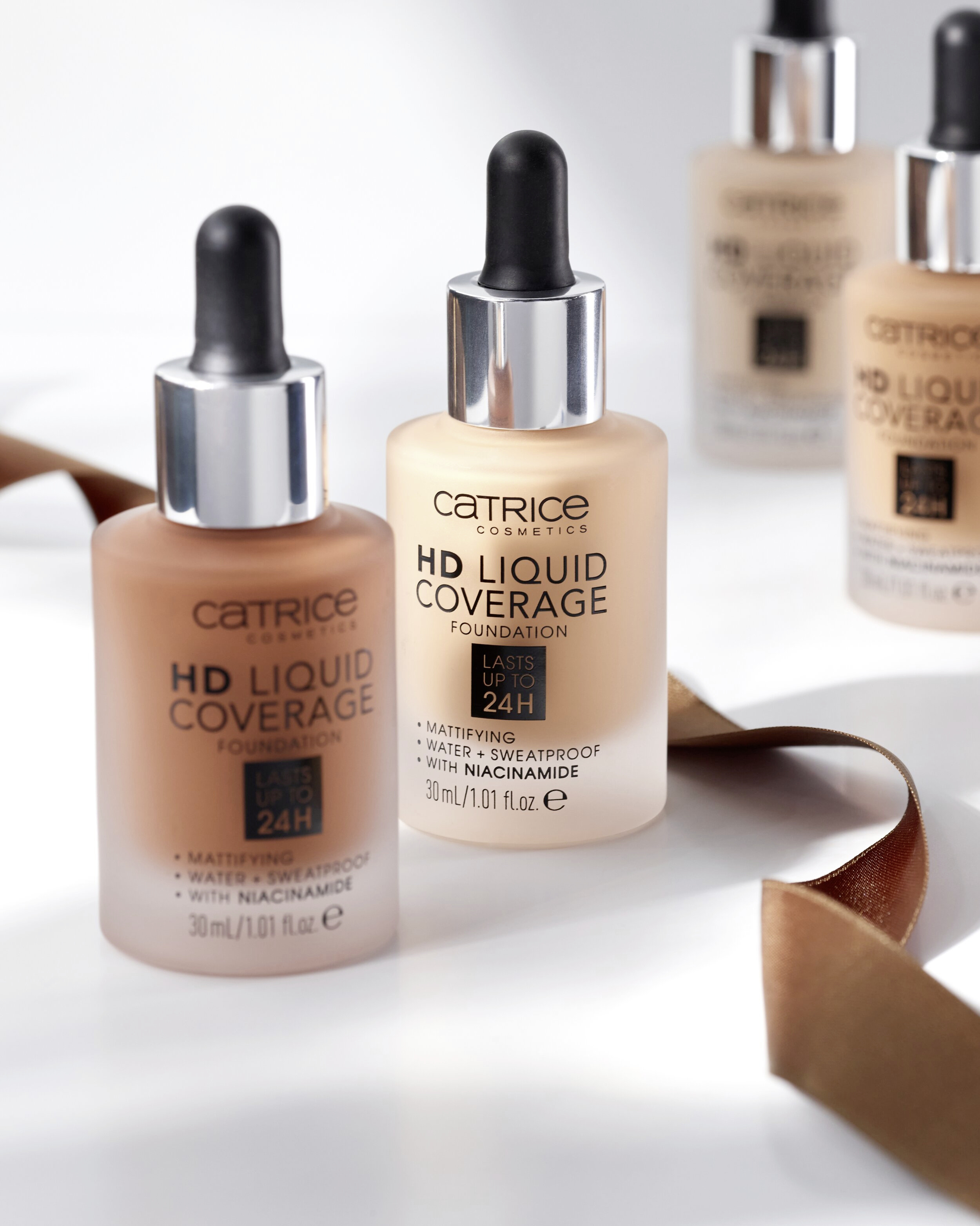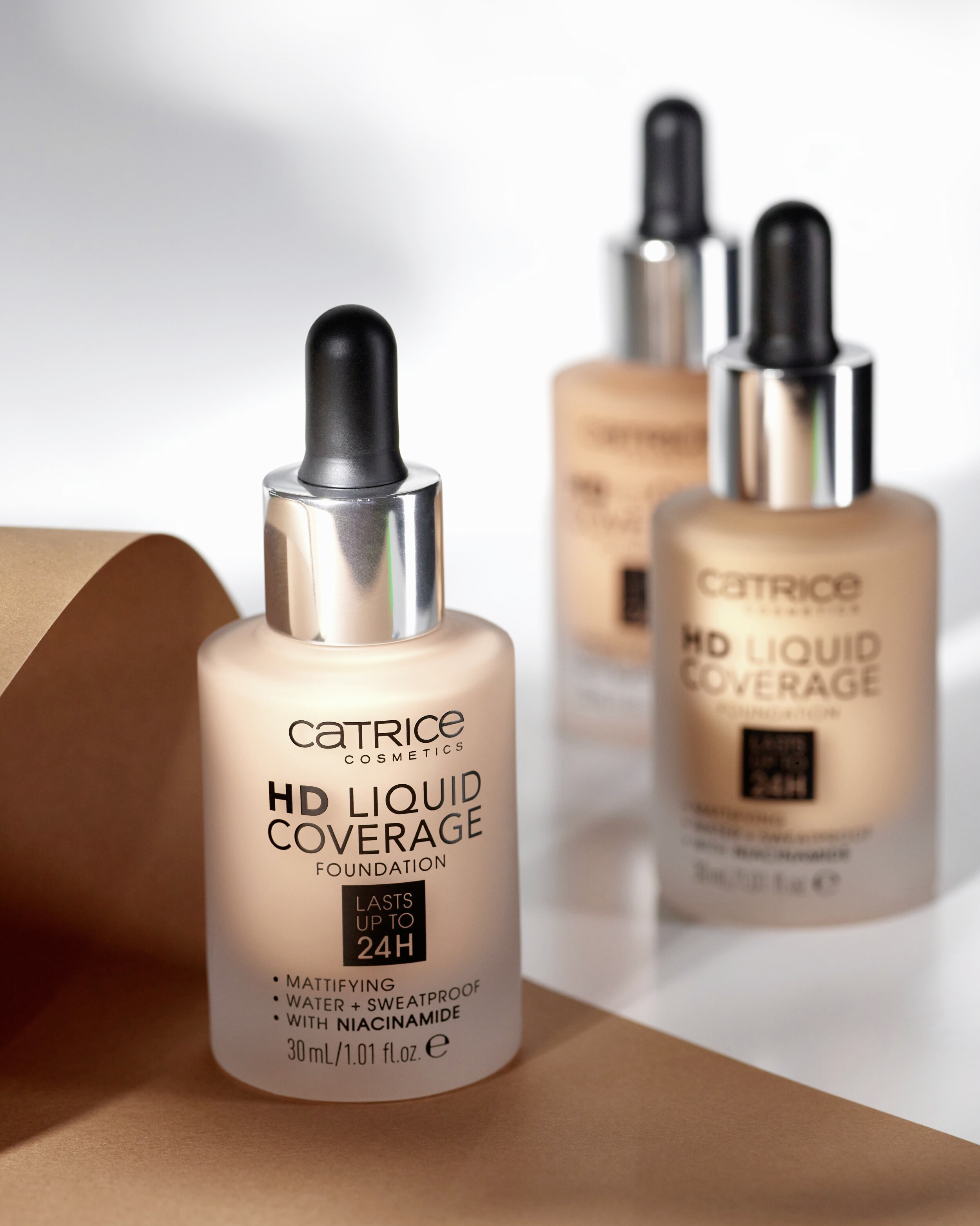 Efekt druhé pleti: Make-up HD Liquid Coverage působí jako druhá pleť, kterou nechává sametově matnou a sjednocenou – až na 24 hodin! Ultra lehká tekutá textura s vysokým a zároveň přirozeně působícím krytím zakrývá nedokonalosti, vyživuje pomocí niacinamidu a je odolná vůči vodě a potu a neobtiskává se. Složení neobsahuje parabeny ani mikroplasty.