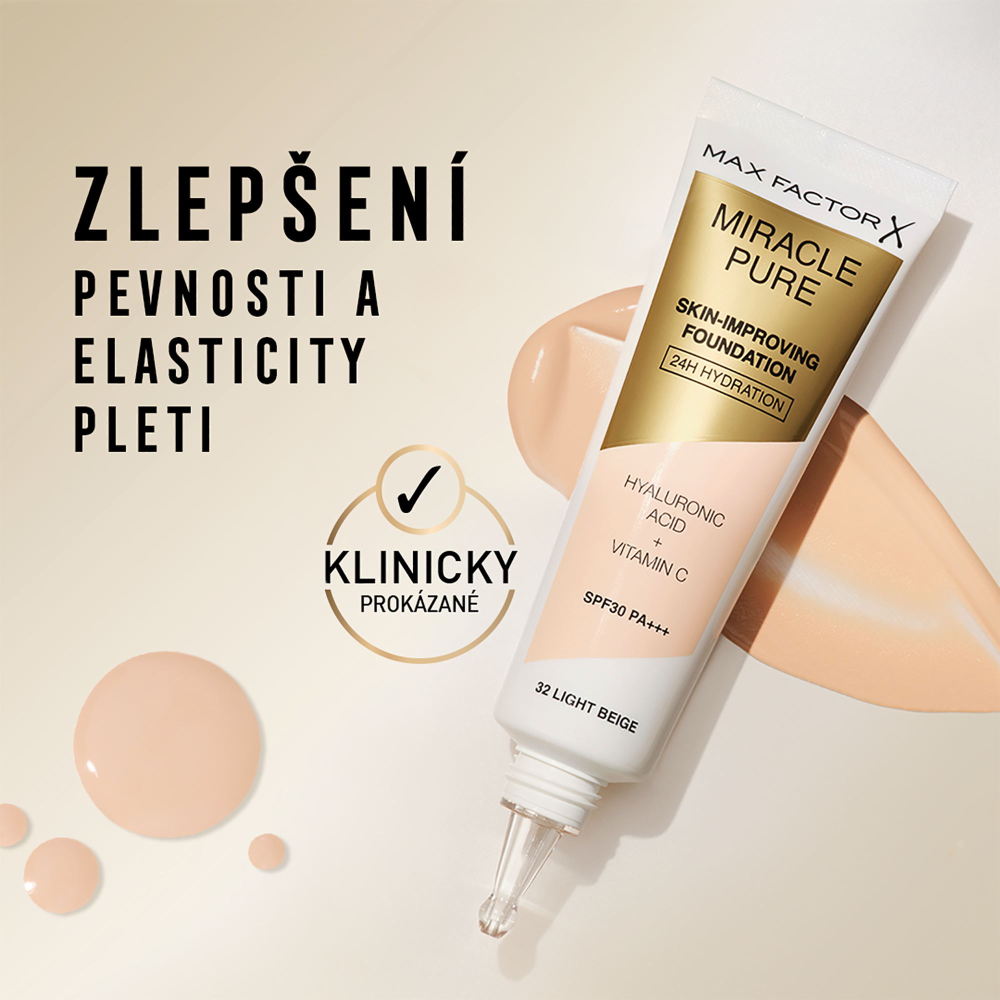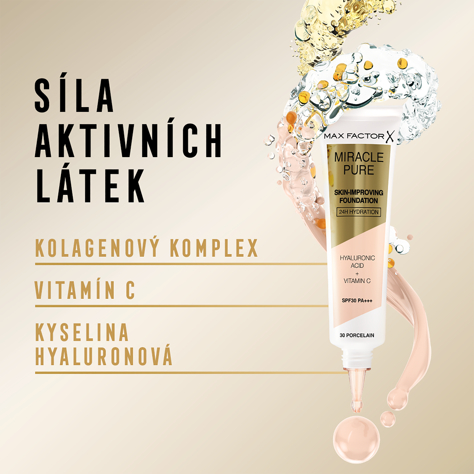 Nový Max Factor Miracle Pure make-up pro zdokonalení kvality vaší pleti. První make-up a péče o pleť v jednom se složením s 89% pečujících a vyživujících látek včetně kolagenového komplexu a kyseliny hyaluronové, vitamínu C a přírodní alternativy k retinolu; alfalfa extraktu. Pouze díky jedné kapce se vaše pleť prokazatelně projasní a zdokonalí.