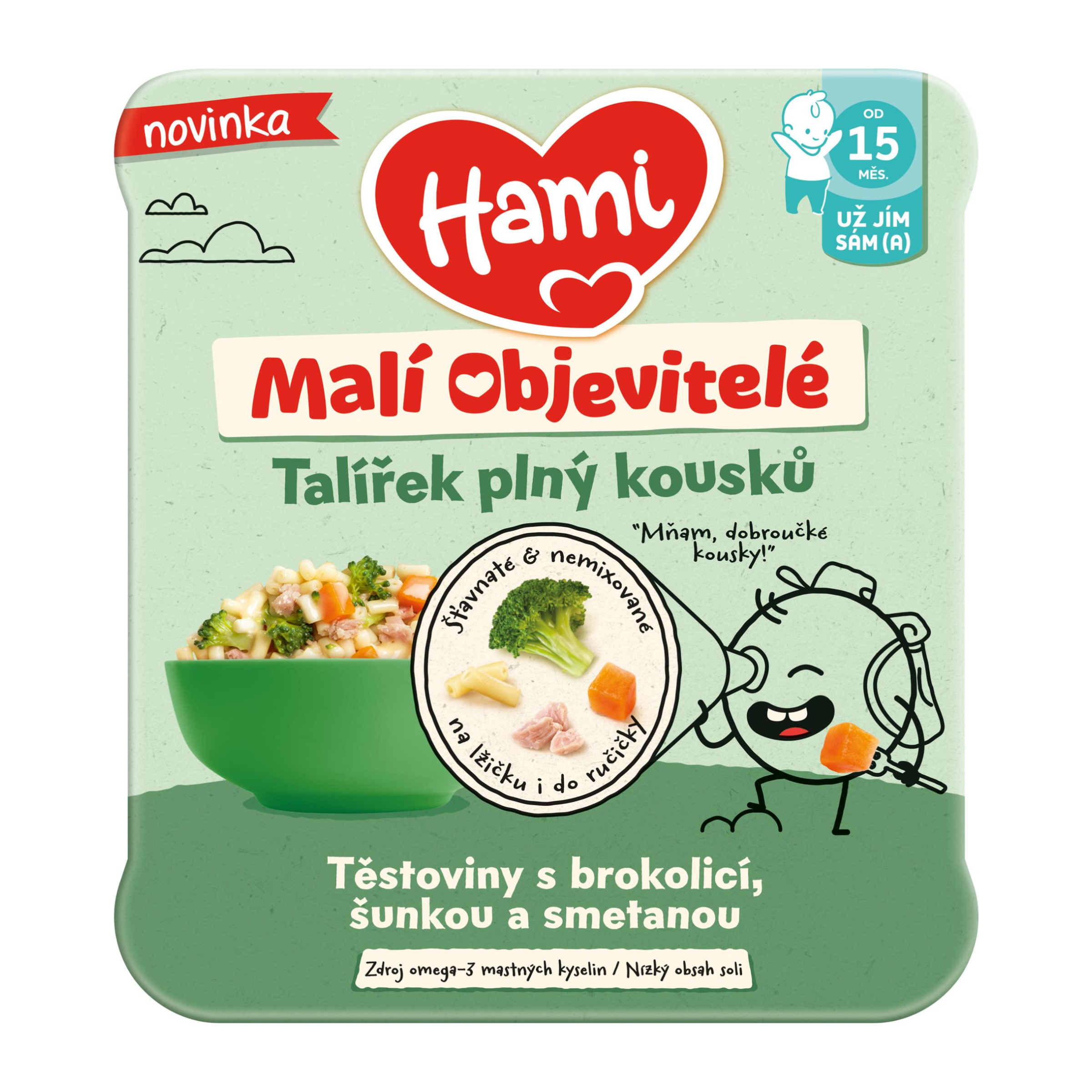 Hami Malí Objevitelé Těstoviny s brokolicí, šunkou a smetanou od 15. měsíců. Hami talířek Malí Objevitelé plný dobroučkých měkkých kousků pro větší děti, které už chtějí jíst samy lžičkou... nebo i rukama! Pro Vaše nejmenší jen to nejlepší: