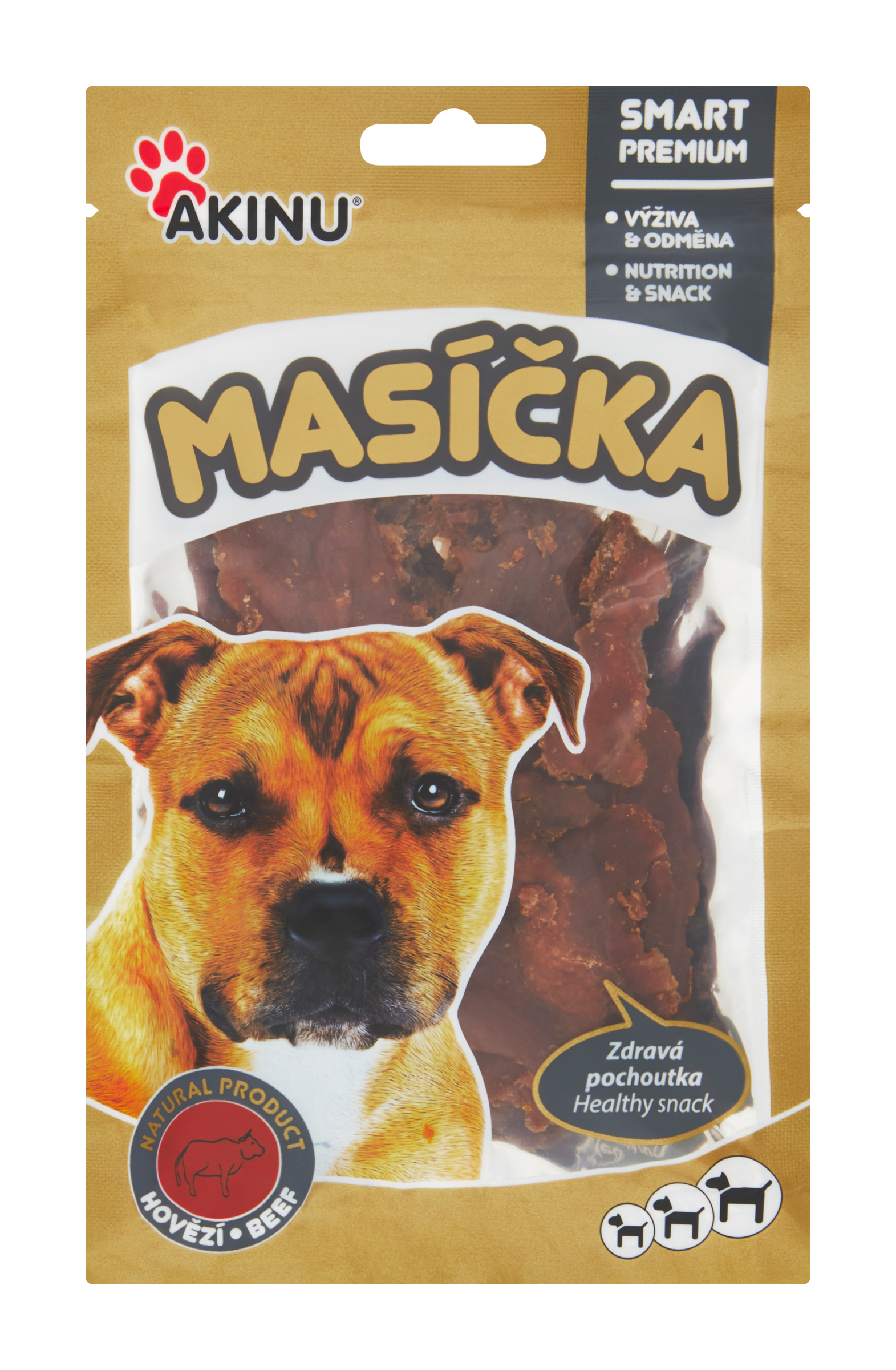 Víte, že maso je přirozenou součástí psí výživy? Jako pamlsek je nejvyšší motivací při tréninku. Extra chutné hovězí stripy masíčka jsou vhodná pro všechna plemena od 4 měsíců věku. Masová pochoutka obsahuje 80 % hovězího masa – kousky z poctivého masa obohatí jídelníček vašeho pejska o kvalitní bílkoviny. Uzavíratelný obal chrání masové kousky před osycháním. Nejlépe chutnají čerstvé. Přírodní doplněk výživy hovězí stripsy je výživově velmi hodnotný, má vysoký obsah železa, esenciálních aminokyselin a vitamínu B12. Šetrná technologie zpracování uchovává přirozené výživové látky.