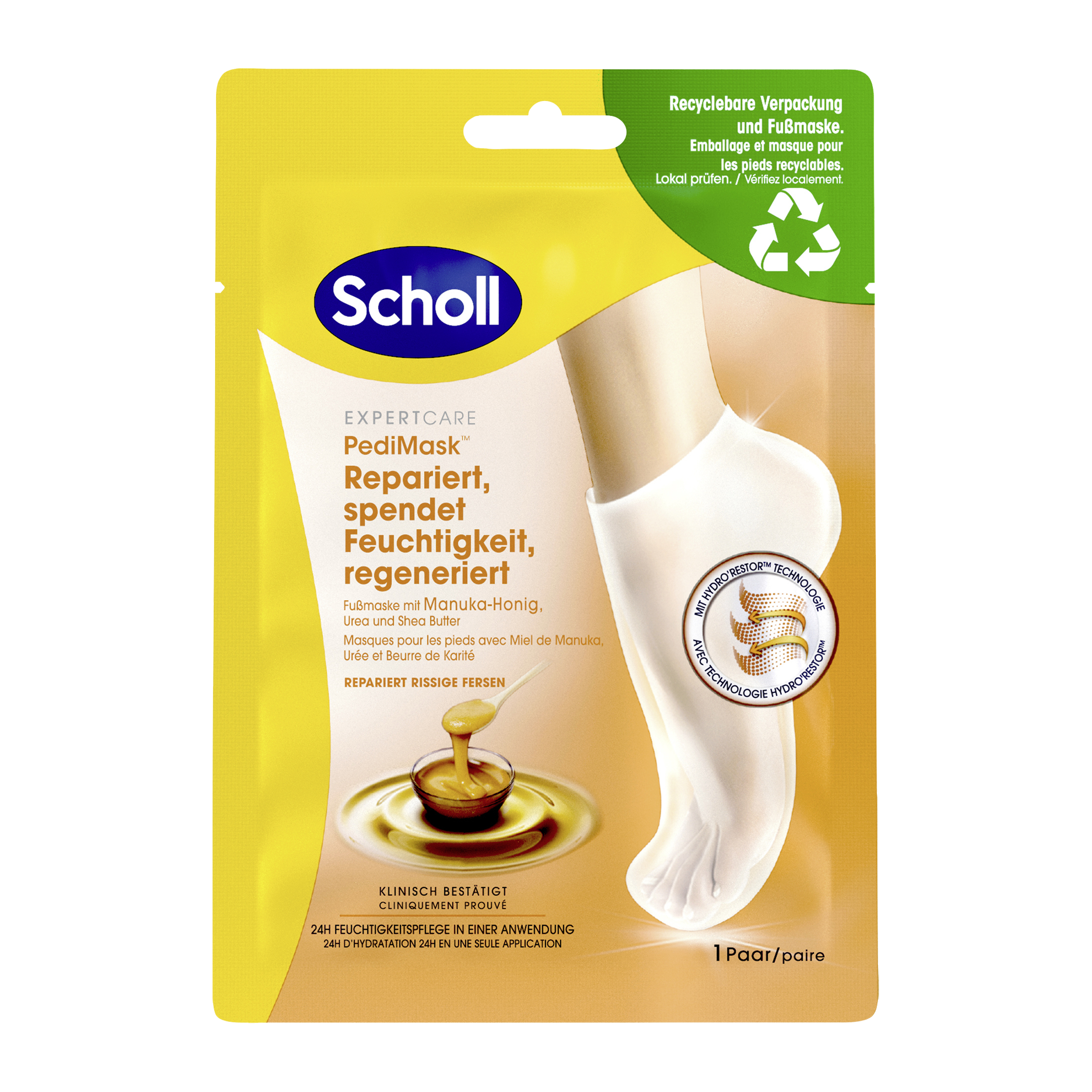 Maska na nohy - opravuje, hydratuje a regeneruje popraskané paty. Měkká a pružná chodidla za pouhých 20 minut. Klinicky potvrzeno: 24hodinová hydratační péče při jedné aplikaci.