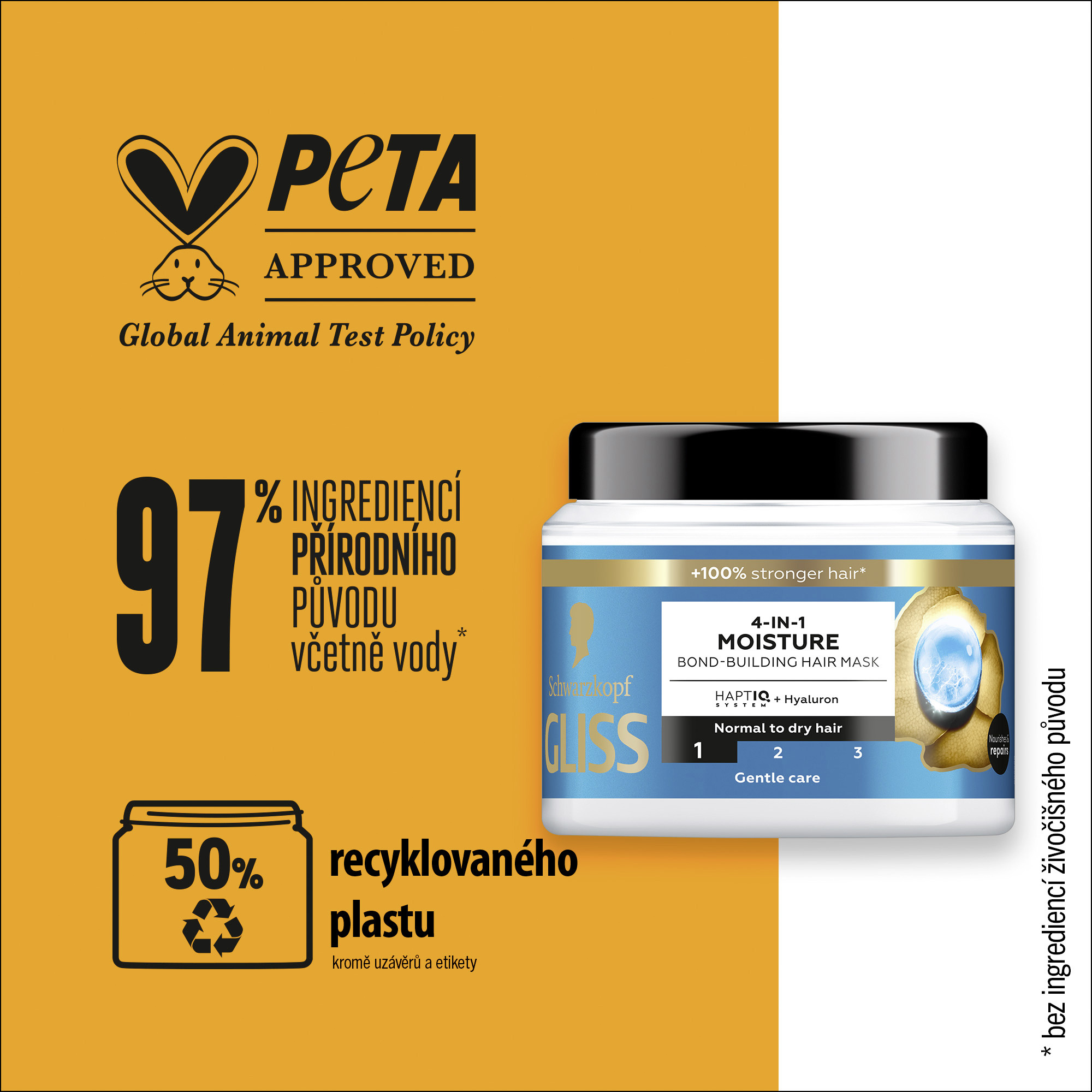 * včetně vody **certifikace netestování na zvířatech *** kromě víčka a štítku **** v porovnání s neošetřenými vlasy. Pocit hydratovaných vlasů až na 48 hodin: Tato maska na vlasy s lehkou krémovou texturou poskytuje intenzivní výživu po dobu až 48 hodin, pomáhá zanechávat vlasy lesklé a zdravě vypadající bez nadměrného zatížení. Hyaluron a HAPTIQ systém: Složení této hydratační masky na vlasy Gliss vytváří mikrovazby, posiluje strukturu vlasů a poskytuje trvalou hloubkovou hydrataci. Výživa a regenerace: Tato intenzivní kúra pro obnovu vlasů nabízí výživu a hydrataci vlasů bez nadměrného zatížení. Vhodné zejména na normální až suché vlasy. Šetrná k planetě: Ingredience této masky jsou z 97 % přírodního původu.** Maska je certifikována organizací PETA.*** Tělo obalu je vyrobeno z 50 % z recyklovaného materiálu****. Obsah balení: Schwarzkopf Gliss 4v1 hydratační maska na vlasy Aqua Revive 400 ml s úrovní jemné péče pro normální až suché vlasy.