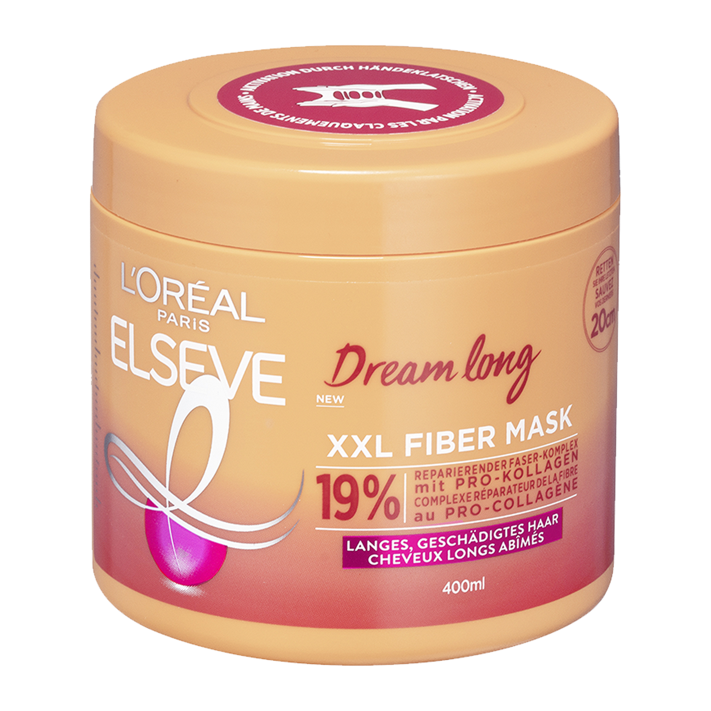 Maska na vlasy Dream long XXL Fiber značky L'Oréal Paris Elseve vám pomůže obnovit vlasová vlákna a okamžitě získat XXL plnější a zdravěji vypadající dlouhé vlasy snů. Maska s 19% komplexem pro obnovu vlasových vláken s pro-kolagenem se zaměří na nejvíce poškozené části vlasů a pomůže je obnovit až do délky 20 cm. Vlasy vypadají plnější a snáze se upravují. Zachraňte délky svých vlasů, vyzkoušejte masku na vlasy L'Oréal Paris Elseve XXL Fiber z řady Dream long!