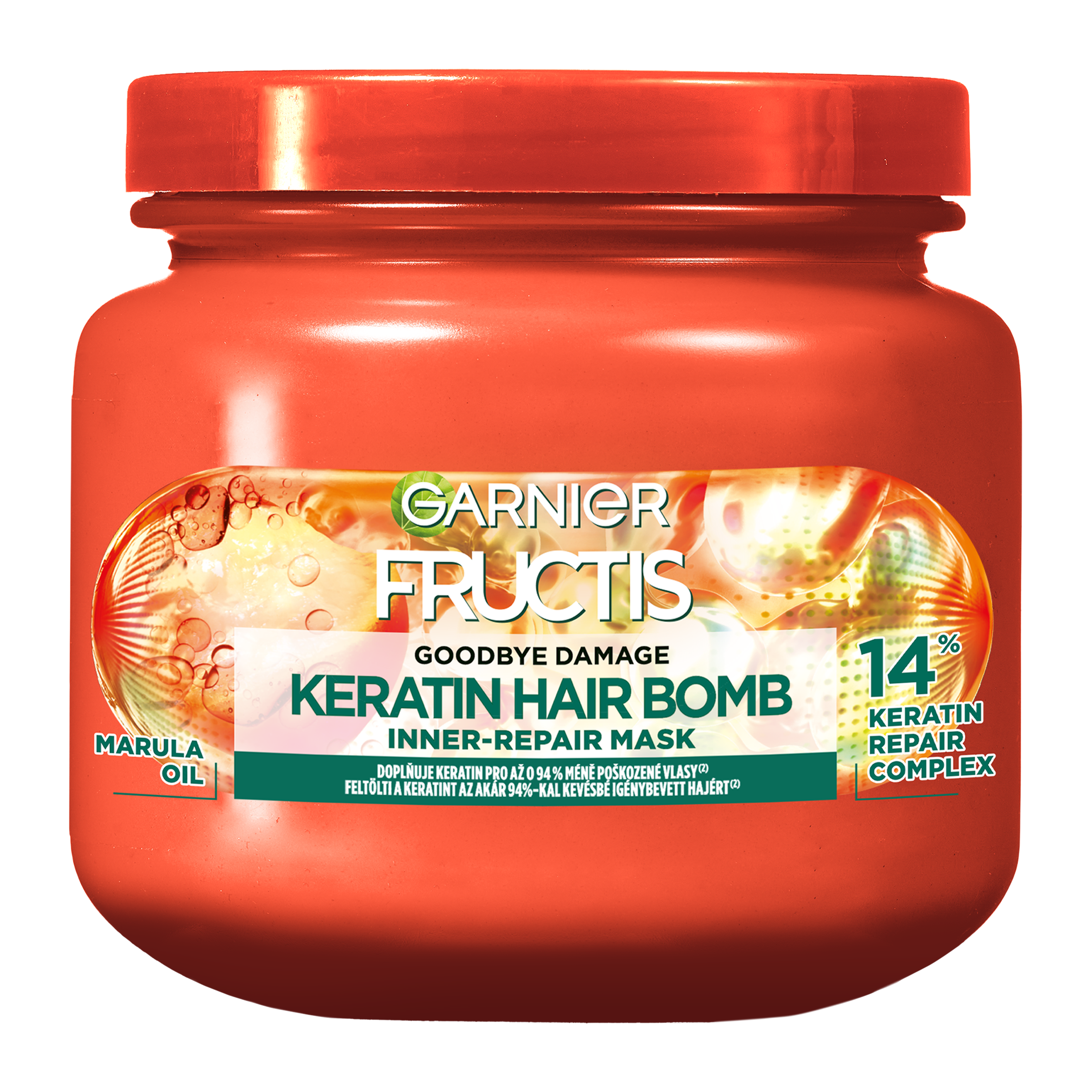 Keratin Hair Bomb maska pro poškozené vlasy (2) s technologií keratinového komplexu. Technologie s 14 % keratinového komplexu a s marulovým olejem doplňuje keratin pro až 94 % méně poškozených vlasů (1). Aktivní látka proniká až do hloubky 10 vrstev (3). Intenzivně vyplňuje a posiluje vlasové vlákno. Vlasy jsou viditelně silnější a odolnější. Přináší až 2x méně roztřepených konečků (3), až 7x hebčí vlasy na dotek (3) a až 10x odolnější vlasy (3).