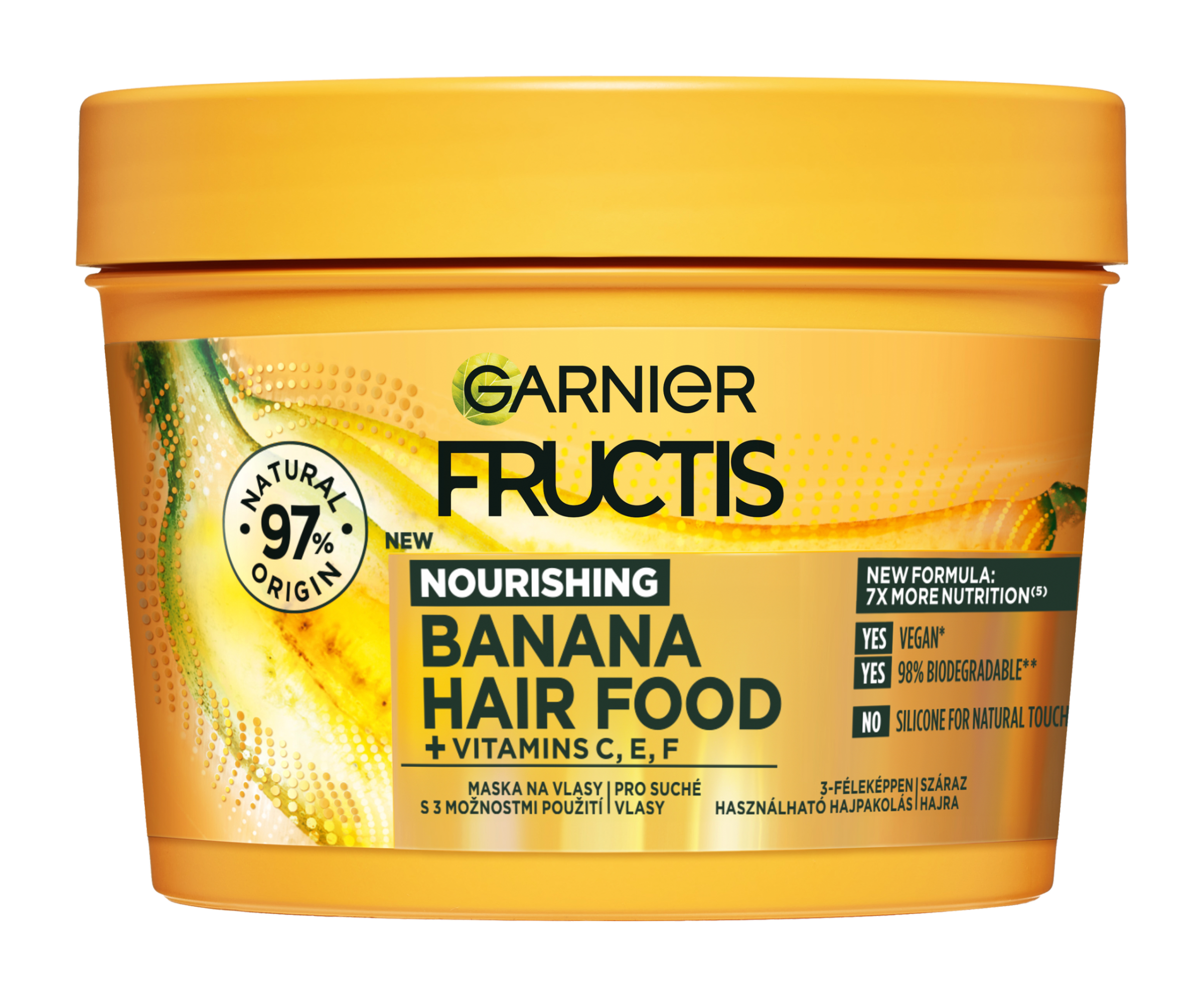 Až 7x vyživenější vlasy (1). Složení je z 97% přírodního původu. Zbývající 3% zaručují senzorické vlastnosti a stabilitu produktu. (1) Instrumentální test po aplikaci masky a následném opláchnutí.