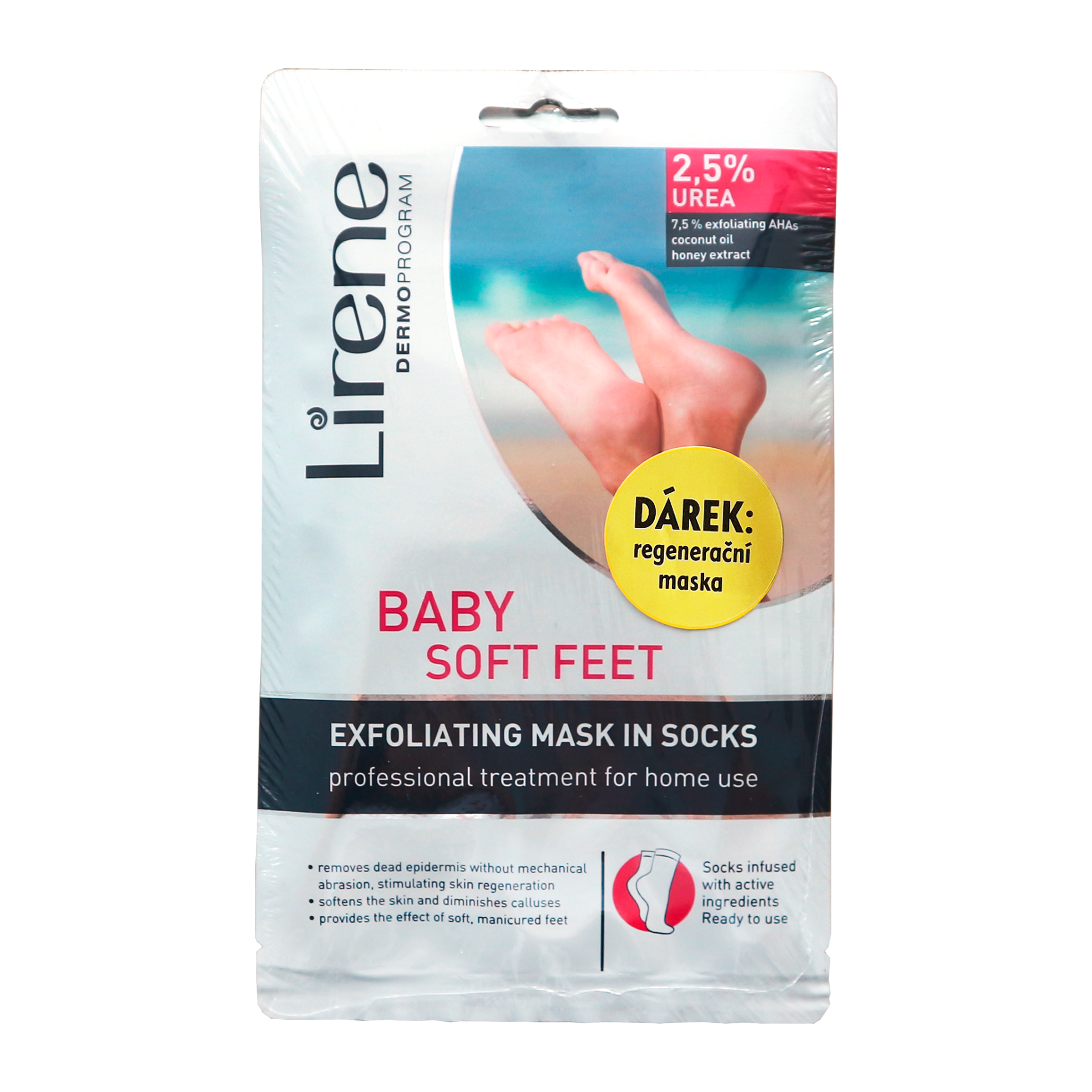 Lirene péče o nohy 2 fázová 3% urea (peeling a maska) Pečující regenerační maska na nohy, která poskytuje dvoufázovou vyhlazující péči. Efektivní kombinace hrubého peelingu a exfoliačních enzymů ve spojení s regenerační maskou obnovuje hebkost a jemnost pokožky díky dvoufázové pečující proceduře. Peeling odstraňuje odumřelé buňky a okamžitě vyhlazuje pokožku. Maska zmírňuje drsnost a popraskání pokožky, vyživuje a zvyšuje pružnost pokožky. Výsledkem jsou nohy jemné jako dětské nožky. Lirene exfoliační maska na nohy 2,5% urea Profesionální péče pro domácí použití pro nohy bez ztvrdlé kůže. Maska obsahuje 2,5 % UREU, 7,5 % kyselinu AHA, kokosový olej a medový extrakt. Lirene exfoliační maska na nohy odstraňuje odumřelé buňky bez mechanického tření, stimuluje regeneraci pokožky, zjemňuje pokožku, minimalizuje ztvrdlou kůži a poskytuje efekt jemných nohou jako po salónním ošetření.