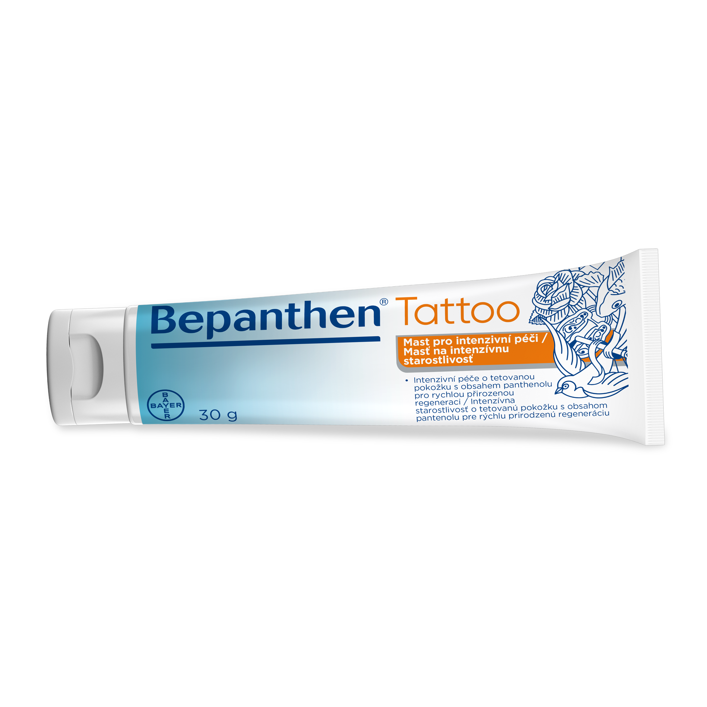 Pro zdravě vypadající tetování nanášejte 4x denně Bepanthen Tattoo mast na omytou tetovanou pokožku v tenké vrstvě po dobu, jakou je třeba. Nepřestávejte ani poté, co se strupy sloupnou. Mast vytvoří ochrannou transparentní vrstvu, nezanechává silný bílý film a nemusí se smývat. Vyvinuto speciálně pro vaše tetování.