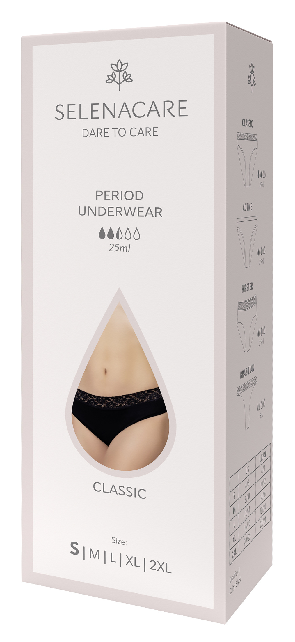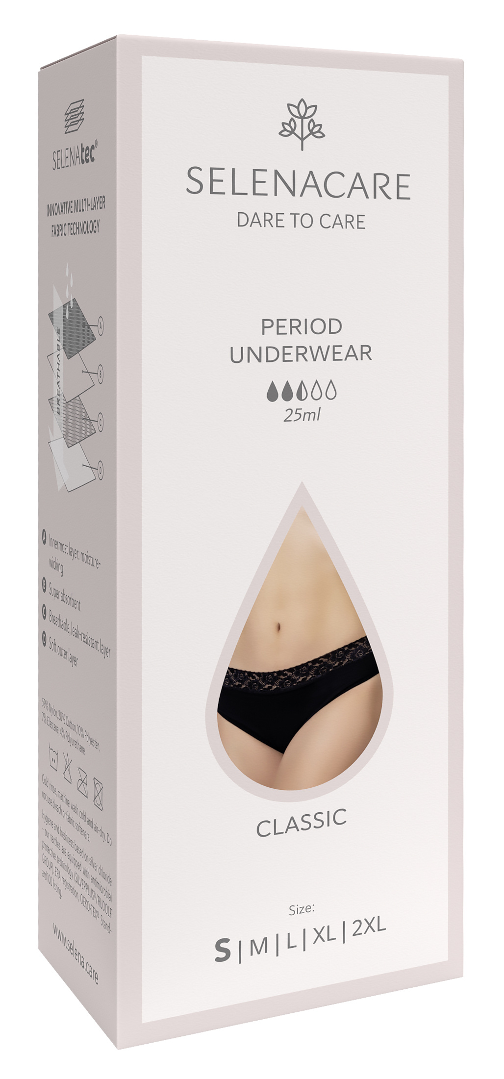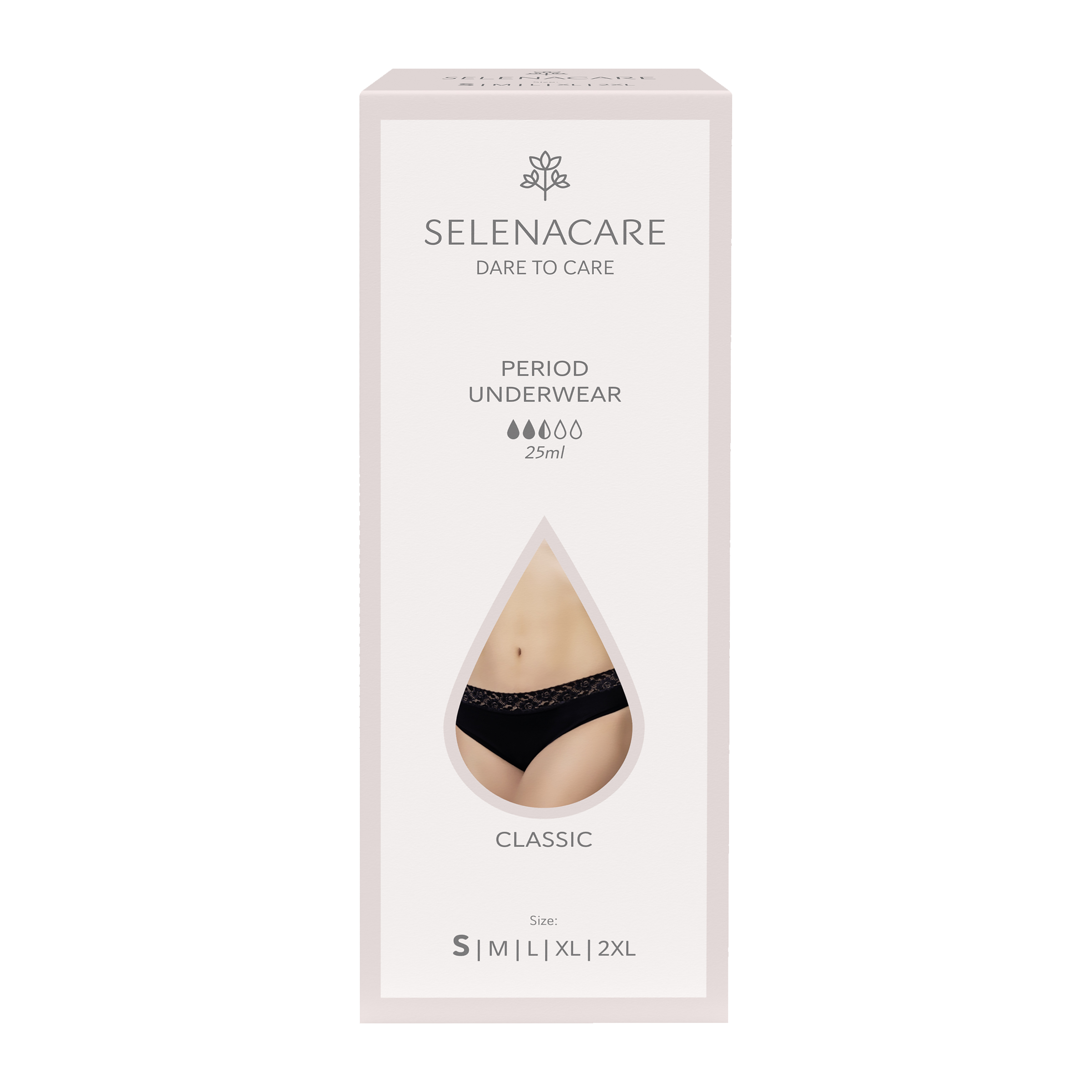 Spodní prádlo SELENACARE Period Underwear vypadá jako běžné kalhotky, ale s integrovanou ochranou. Toto pratelné spodní prádlo je udržitelnou alternativou tamponů, vložek a menstruačních kalíšek. Spolehlivá ochrana pro lehké až střední toky. Pro silnější průtoky je snadno kombinovatelný s menstruačním kalíškem SELENACARE.