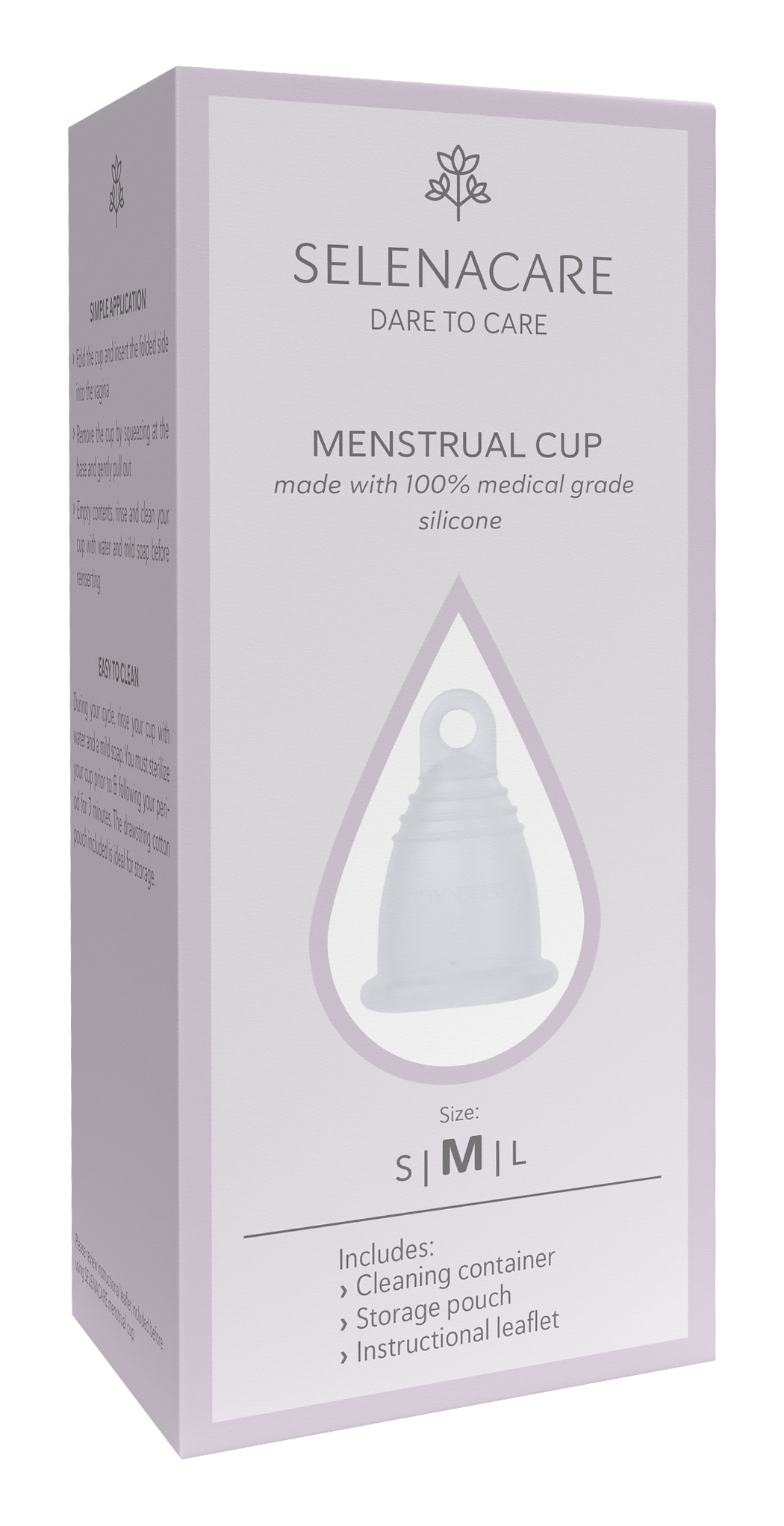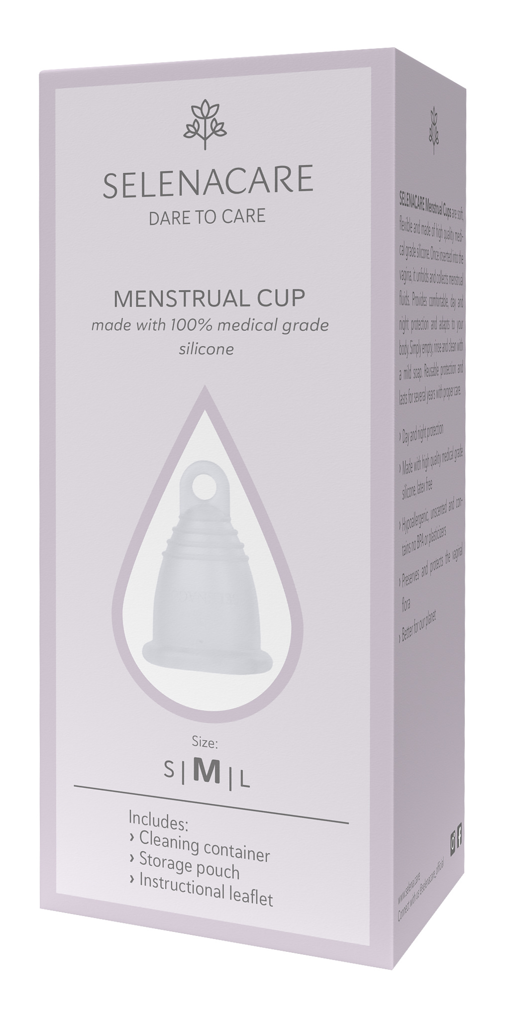 Menstruační kalíšky SELENACARE jsou měkké, flexibilní a vyrobené z vysoce kvalitního lékařského silikonu. Po zavedení do pochvy se rozvine a shromažďuje menstruační tekutiny. Poskytuje pohodlnou ochranu ve dne i v noci a přizpůsobí se vašemu tělu. Jednoduše vyprázdněte, opláchněte a vyčistěte jemným mýdlem. Opakovaně použitelná ochrana a při správné péči vydrží několik let.