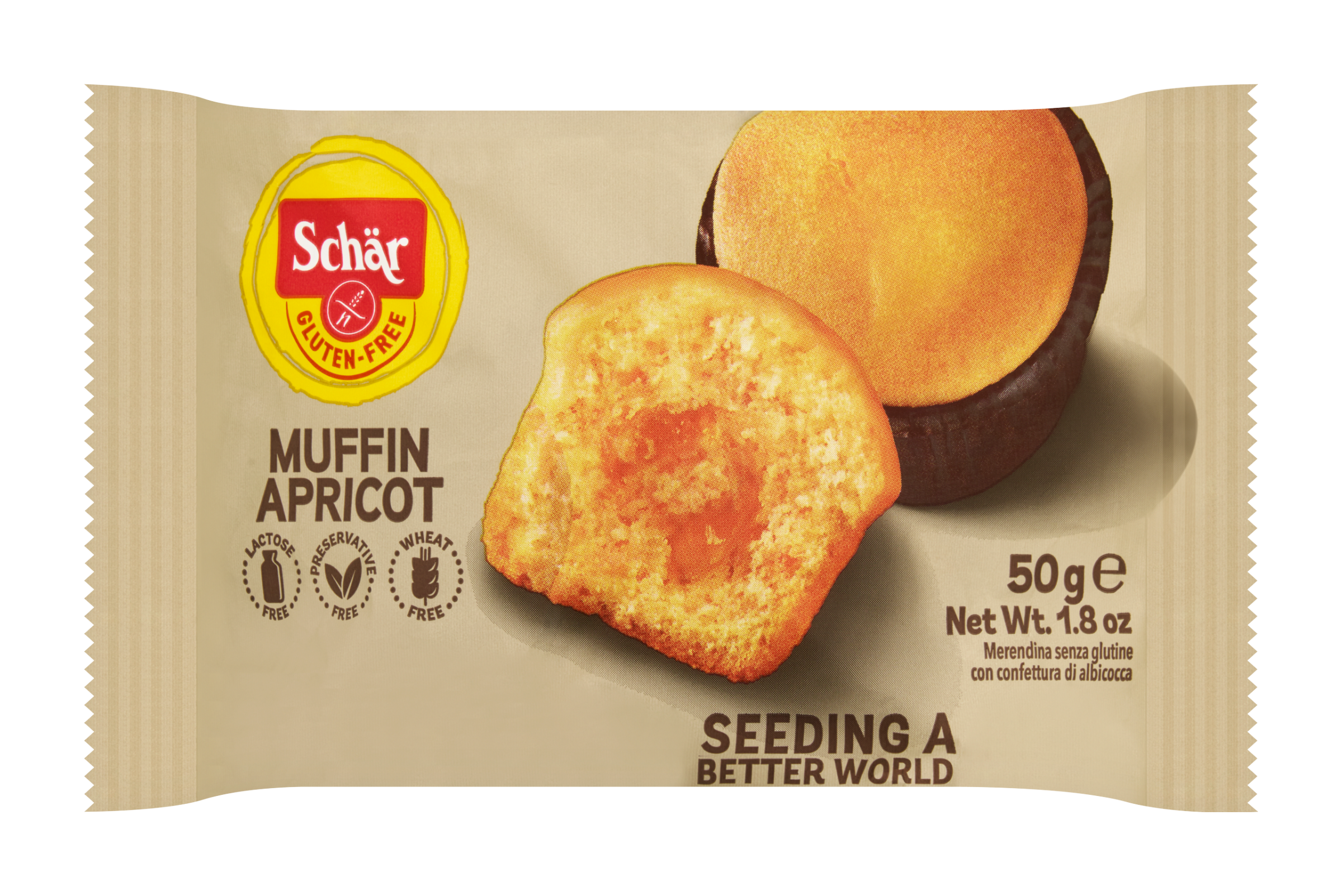 Meruňkový džem 20% (glukózo-fruktózový sirup, meruňkový protlak 35%, sacharóza, zahušťovadlo: pektin; regulátor kyselosti: kyselina citrónová), Vejce*, Slunečnicový olej, Cukr, Kukuřičný škrob, Rýžová mouka, Dextróza, Kukuřičná mouka, Hrachová bílkovina, Rýžový škrob, Ovocný výtažek (karob, jablko), Kypřící látky: vinan monodraselný, Hydrogenuhličitan sodný, Emulgátor: mono a diglyceridy mastných kyselin, Zahušťovadlo: xantanová guma, mouka ze semen rohovníku, Jedlá sůl, Přírodní aroma.