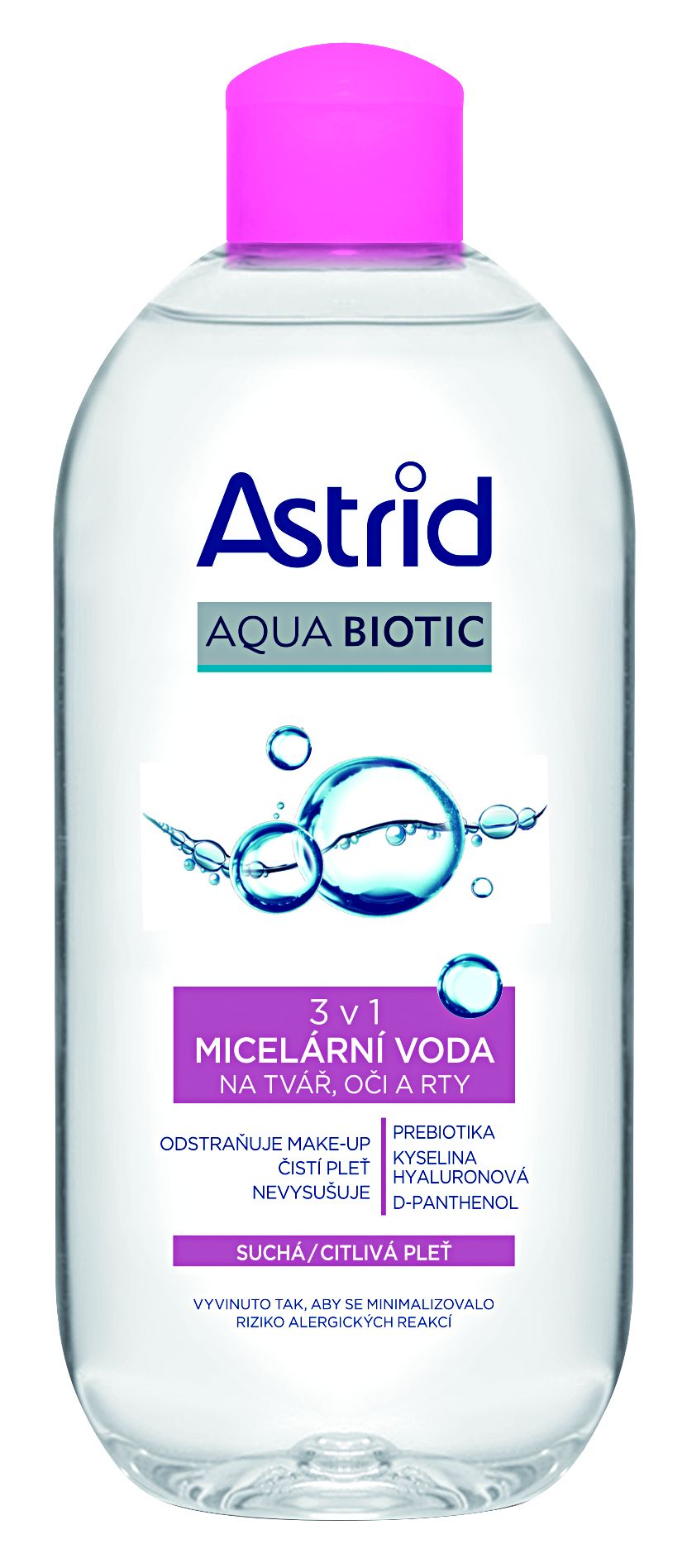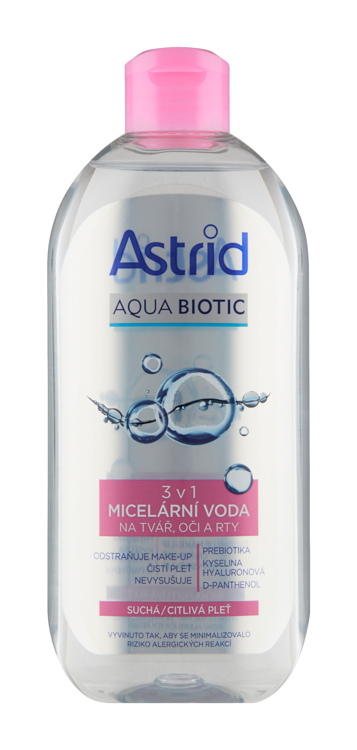 Astrid Aqua Biotic micelární voda 3v1 pro suchou a citlivou pleť účinně odstraňuje nečistoty a make-up (včetně voděodolného). Jemně čistí a odličuje celý obličej (tvář, oči a rty) bez podráždění či dehydratování pleti. Složení obohacené o kyselinu hyaluronovou a D-panthenol efektivně pečuje o citlivou pleť bez jejího vysušování a zanechává ji dokonale čistou, hladkou, tonizovanou a svěží se zdravě prozářeným vzhledem. Obsažená prebiotika pečují o mikroflóru pokožky a podporují její zdravou vyváženost.