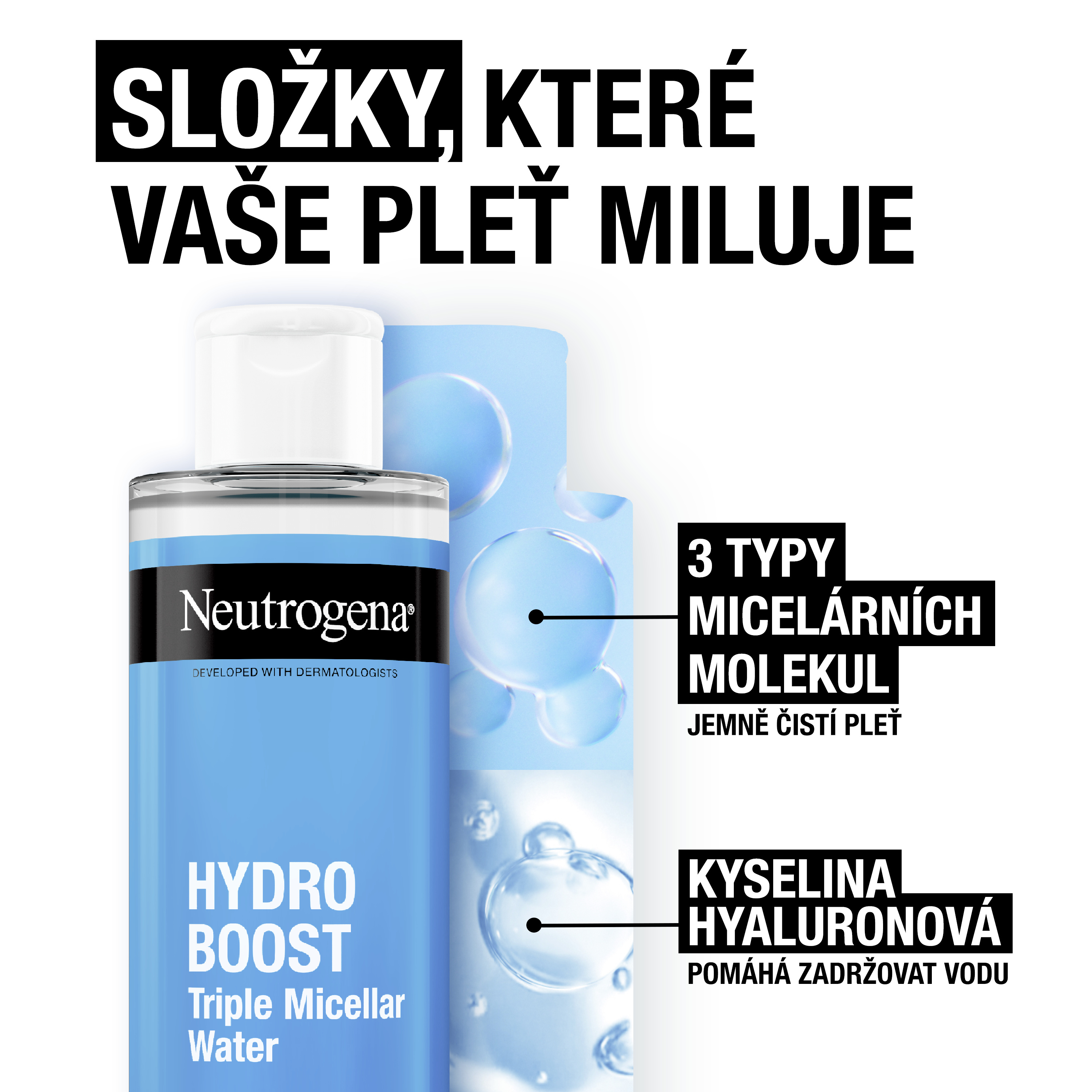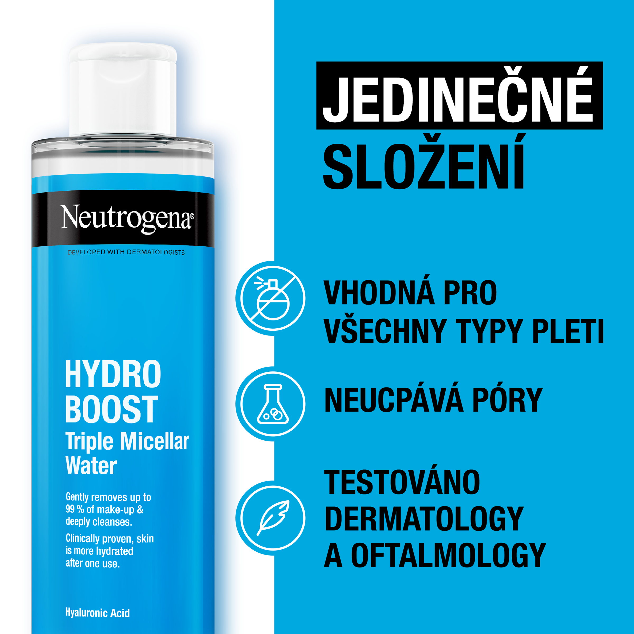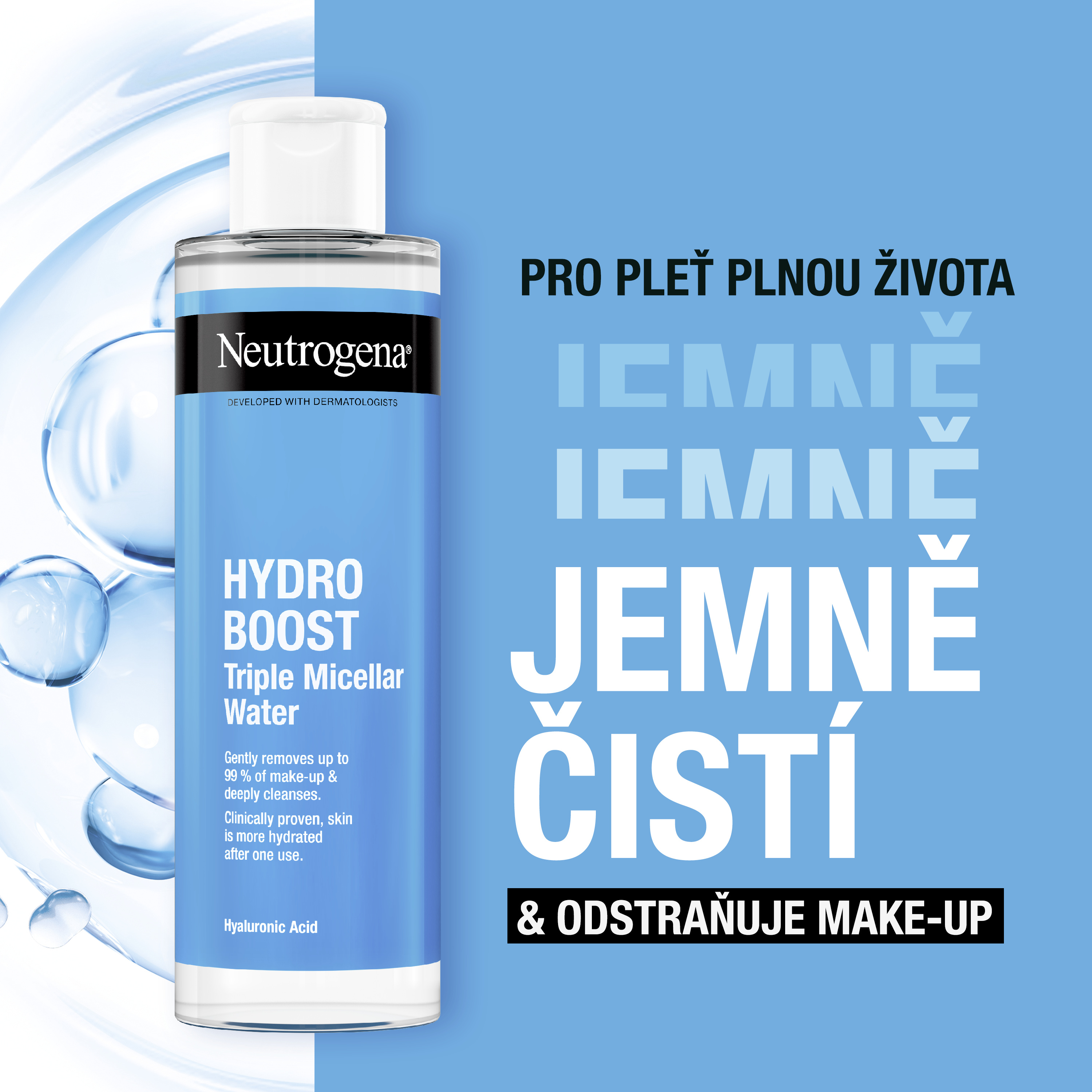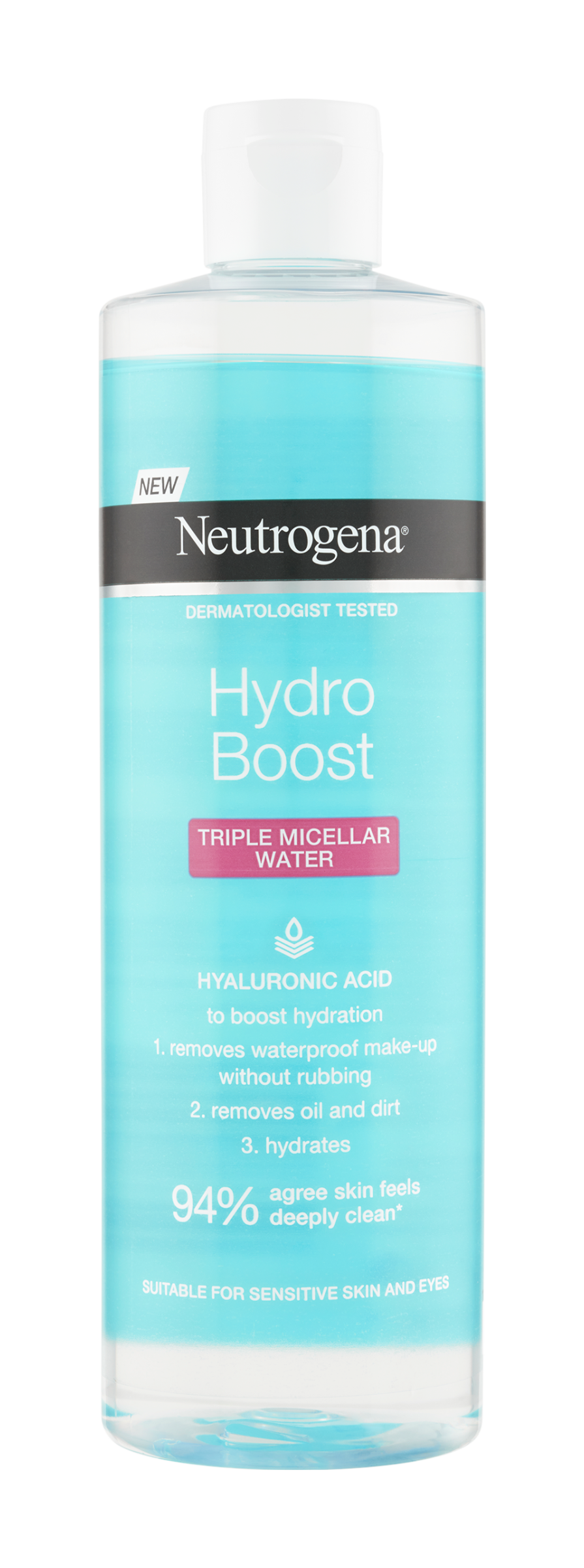 Neutrogena® Hydro Boost® Micelární voda 3v1. Unikátní složení s kyselinou hyaluronovou a třemi typy micelárních molekul pro tři účinky: odstraňuje i voděodolný make-up, čistí pleť od nečistot a mastnoty, intenzivně hydratuje. 94 % uživatelů vnímalo svou pleť jako čistou*.