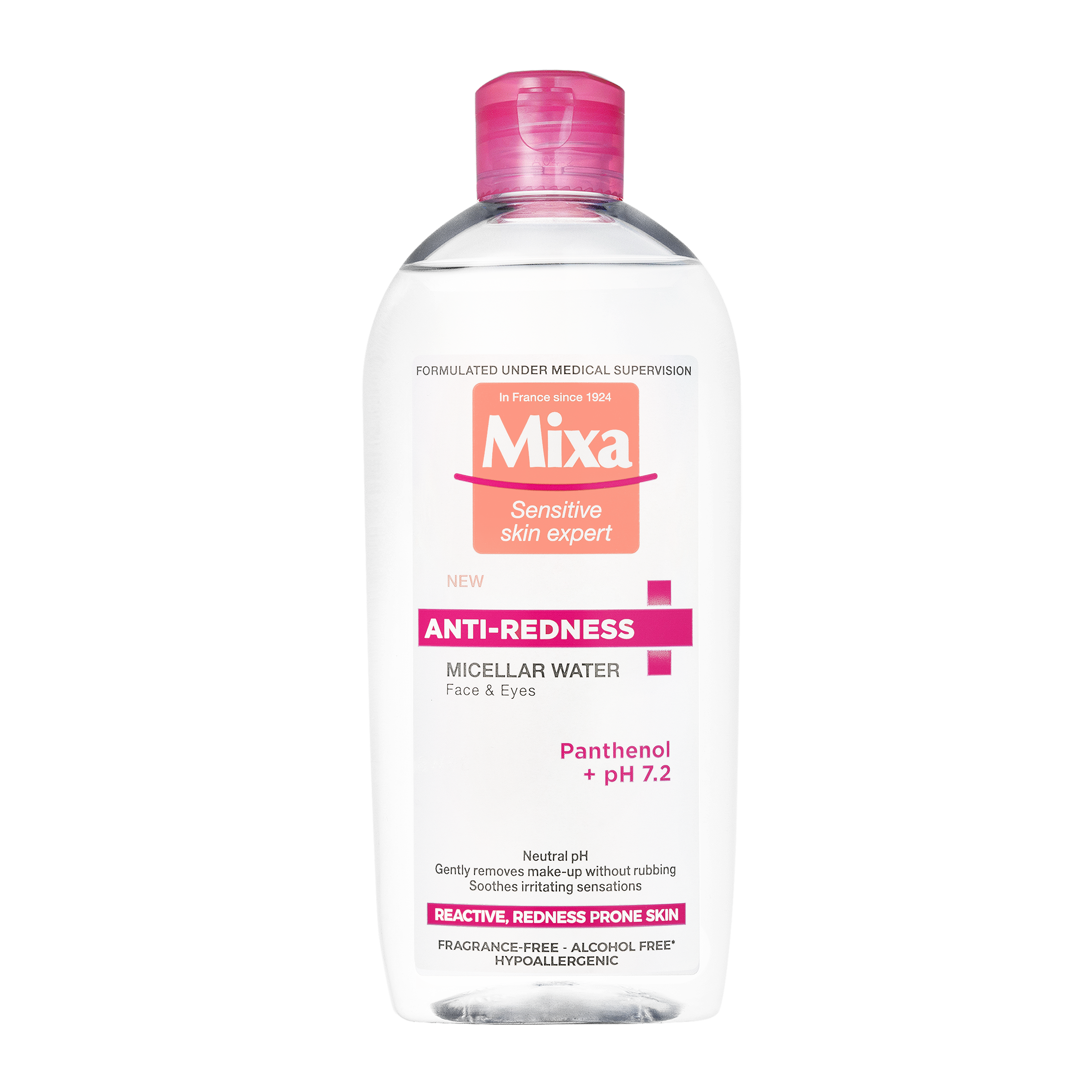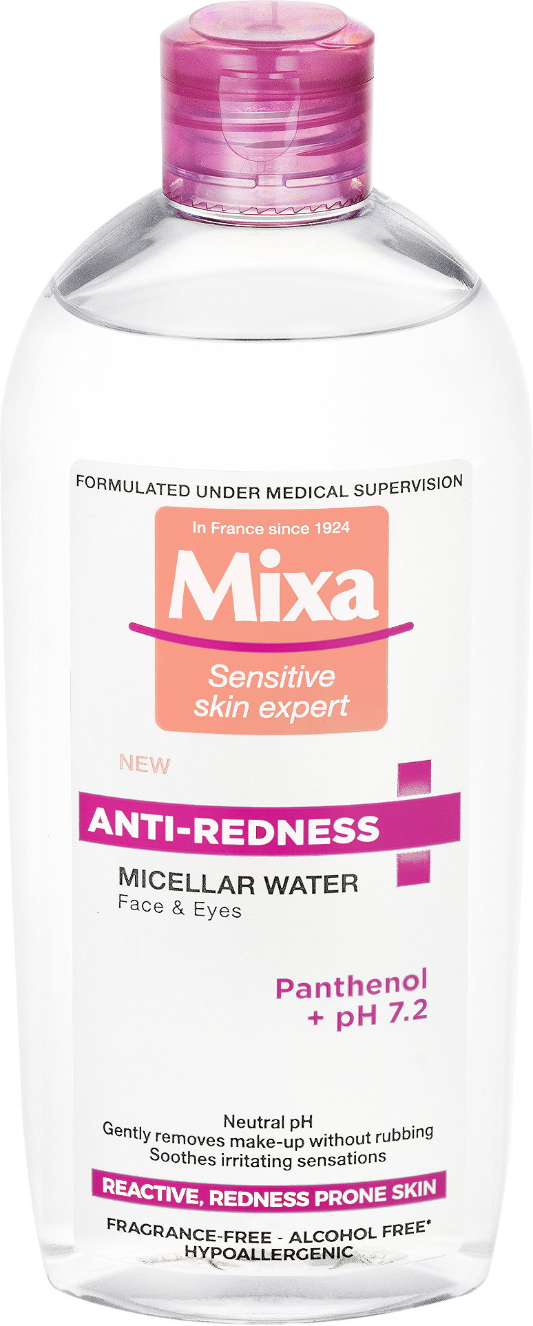 Micelární voda Mixa Anti-Irritations působí proti pocitu podráždění pleti a je ideální na odličování citlivé pleti. Její jedinečné složení obsahuje micely, které z pleti odstraní make-up a nečistoty jedním tahem. S pH 5,5, stejným jako pokožka, respektuje ochrannou kožní bariéru. Je obohacená o alantoin, který je známý pro své zklidňující vlastnosti, a okamžitě citlivé pleti ulevuje od podráždění pleti.