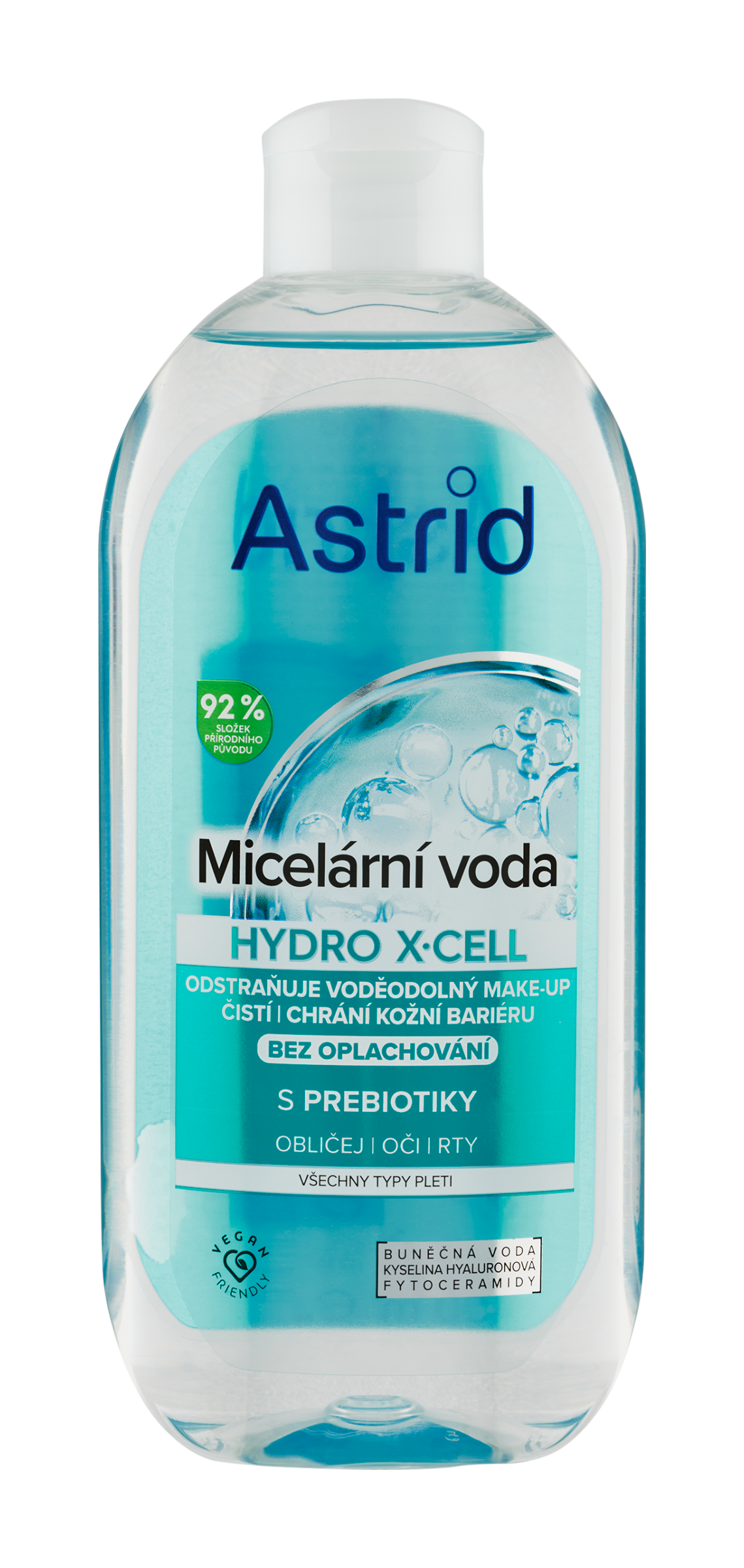 Astrid Hydro X-Cell Micelární voda pro všechny typy pleti s 92 % složek přírodního původu je váš každodenní pomocník pro dokonale čistou pleť. Jedná se o pohodlný, účinný a jemný způsob, jak odstranit make-up a nečistoty jedním tahem. Její pokročilé složení, které obsahuje jemné částečky oleje a vody, zachytí a odstraní i voděodolný make-up a nečistoty, aniž by pleť vysušilo. Obohacená o 100% přírodní buněčnou vodu ze spiruliny, kyselinu hyaluronovou a fytoceramidy pomáhá chránit kožní bariéru. Účinek: Tato jemná čisticí micelární voda účinně odstraňuje i voděodolný make-up z obličeje, očí a rtů. Zanechává pleť jemnější, hladší a osvěženou, protože pomáhá předcházet dehydrataci.