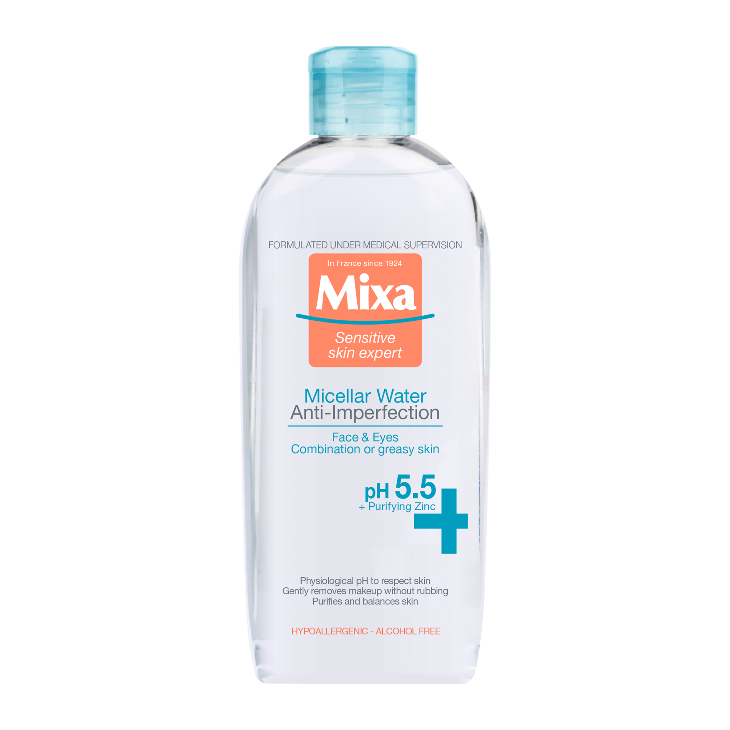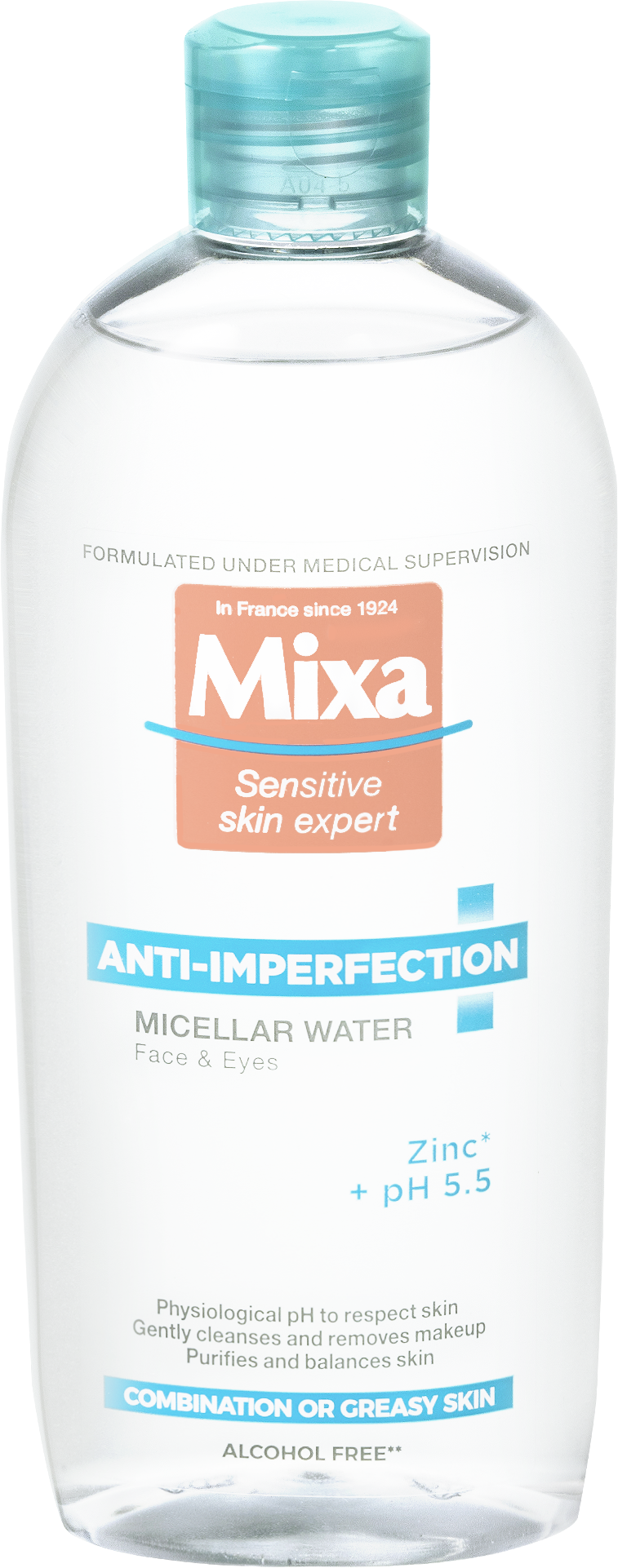 MIXA Anti-Imperfection micelární voda je ideální pro odlíčení smíšené a mastné citlivé pleti. Jemně odstraní make-up z obličeje a očí jedním tahem: složení s micelami, které odstraňují make-up a nečistoty bez tření. S fyziologickým pH 5.5 a složením obohaceným o čistící zinek respektuje přirozenou rovnováhu pleti. *Glukonát zinečnatý