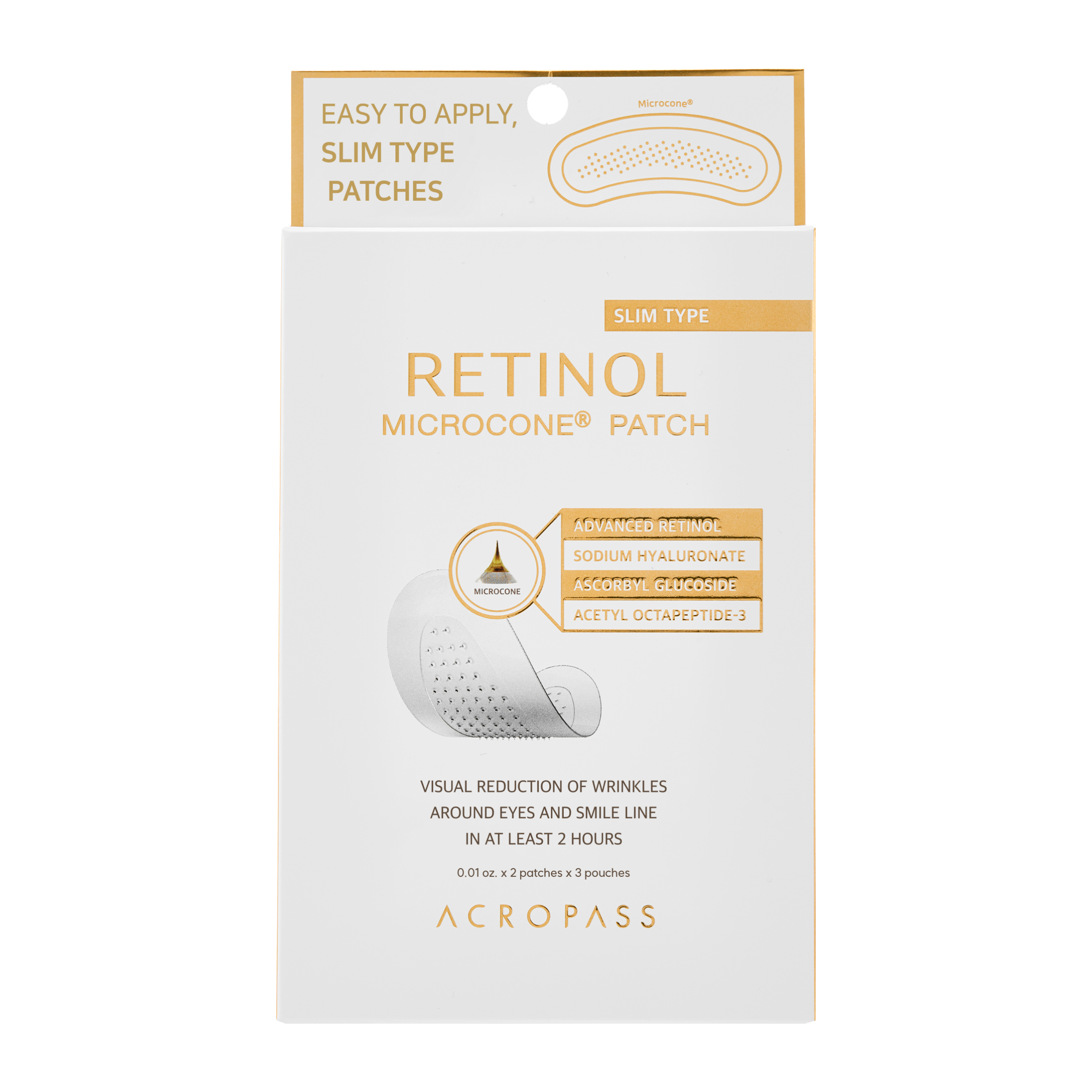 Mikrojehličkové náplasti s retinolem a kyselinou hyaluronovou s účinnou a patentovanou technologií Retinol Microcone®. Pomáhají redukovat jemné vrásky, vyhlazují texturu pleti a zpevňují ošetřovanou oblast. Ideální pro lokální aplikaci na oblast vrásek kolem očí, čela či úst.