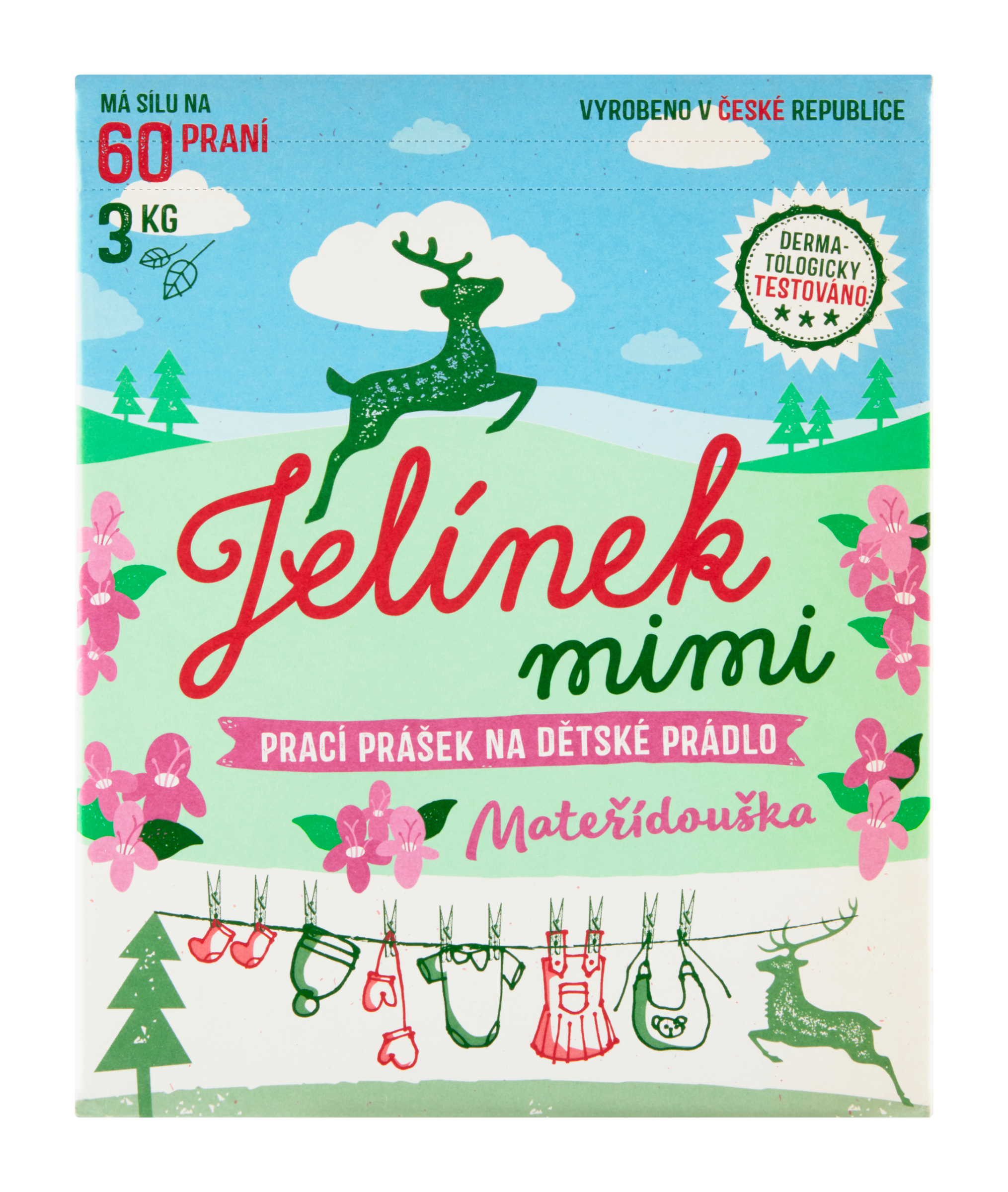 Každá skvrna na dětském prádle má svůj příběh, ať už se jedná o flíček po dobré svačince, nebo o kalhoty zamazané od lezení po kolenou. Jelínek se postará o to, aby prádlo bylo opět krásně čisté - připravené na další dobrodružství. Jelínek pere silou mýdla, které je vyráběno tradičním způsobem, a je tak obzvláště šetrný k dětské pokožce. Prádlo navíc provoní po mateřídoušce. Dle klinického testování je prášek nedráždivý k pokožce, a tedy vhodný i pro praní prádla miminek a dětí do tří let.