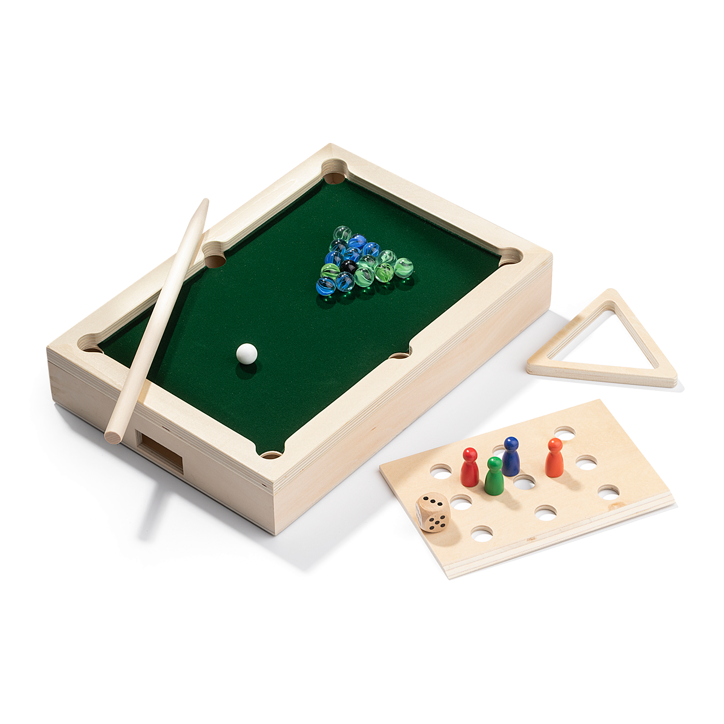 Mini hry 3 v 1 přináší zábavu pro celou rodinu a nabízí tři herní varianty v jednom kompaktním provedení. Kromě klasického billiardu si můžete zahrát také hru hadi a žebříky nebo netradiční piškvorky. Díky dřevěné konstrukci s certifikátem FSC® je hra nejen odolná, ale také šetrná k přírodě. S rozměry 30 × 21,5 cm se snadno vejde na každý stůl a je ideální pro děti od 5 let, které si chtějí procvičit přesnost, strategii i jemnou motoriku.