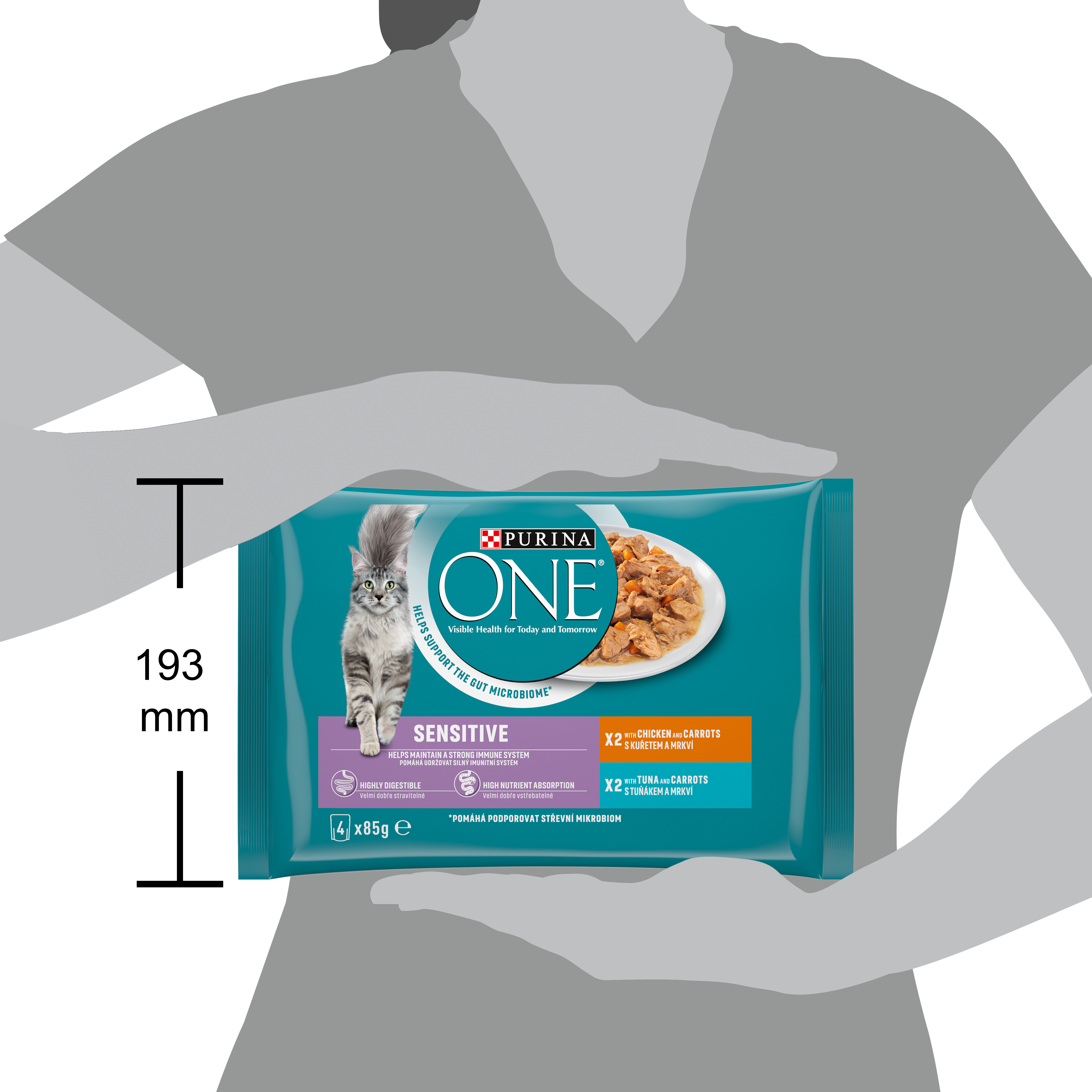 Krmný návod: Dospělou kočku o průměrné hmotnosti (4 kg) krmte 3 kapsičkami denně, nejméně ve 2 samostatných dávkách. Doporučené denní krmné dávky by měly být přizpůsobeny klimatickým podmínkám, úrovni aktivity a fyzické kondici kočky. Podávejte při pokojové teplotě. Čistá čerstvá pitná voda by měla být vždy k dispozici. Případně lze 1 kapsičku nahradit 20 g granulí Purina ONE Sensitive.