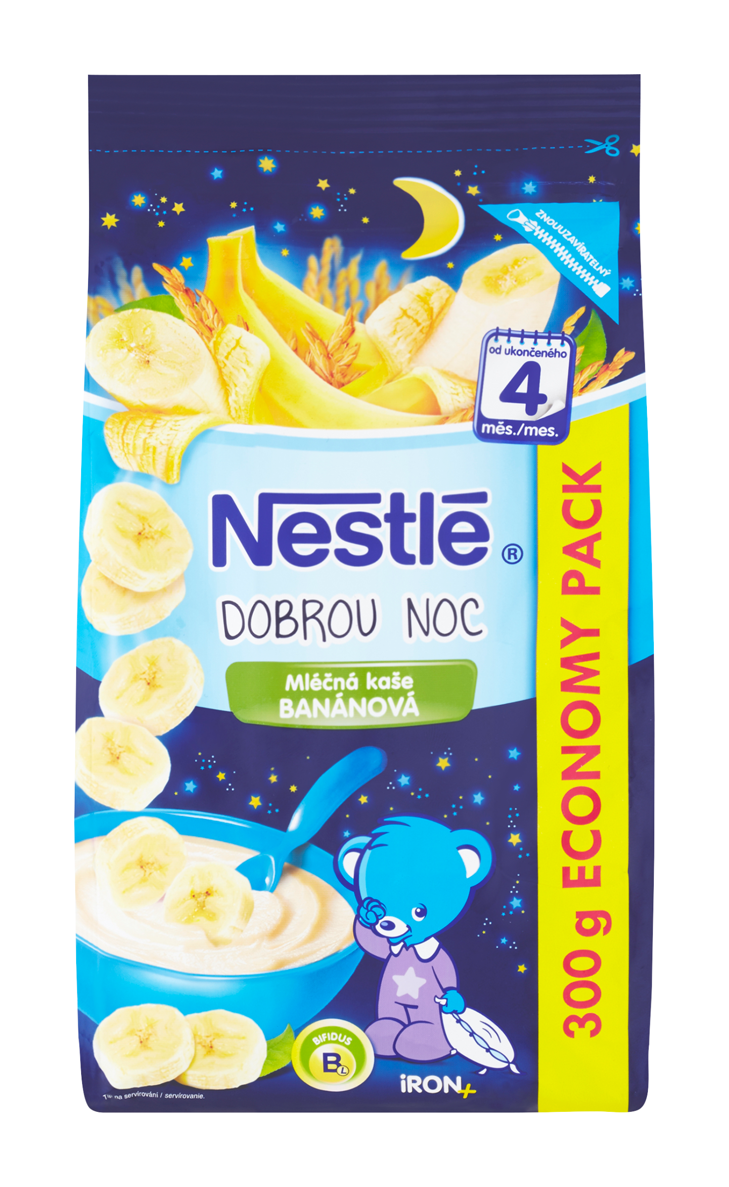NESTLÉ Mléčná kaše Dobrou noc je oblíbený příkrm určený pro kojence od ukončeného 6. měsíce věku. Receptura je obohacena o železo, probiotické bakterie Bifidus BL i další důležité vitamíny a minerální látky.