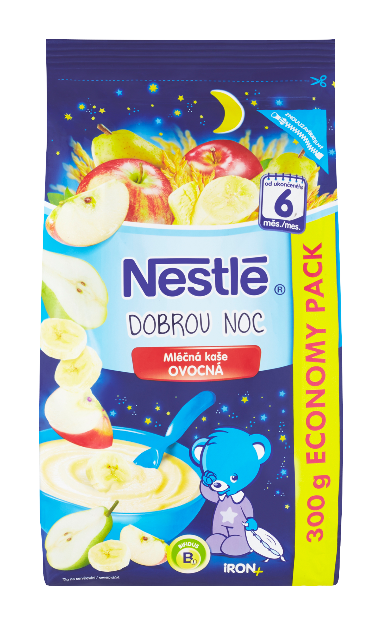 NESTLÉ Mléčná kaše Dobrou noc je oblíbený příkrm určený pro kojence od ukončeného 6. měsíce věku. Receptura je obohacena o železo, probiotické bakterie Bifidus BL i další důležité vitamíny a minerální látky.