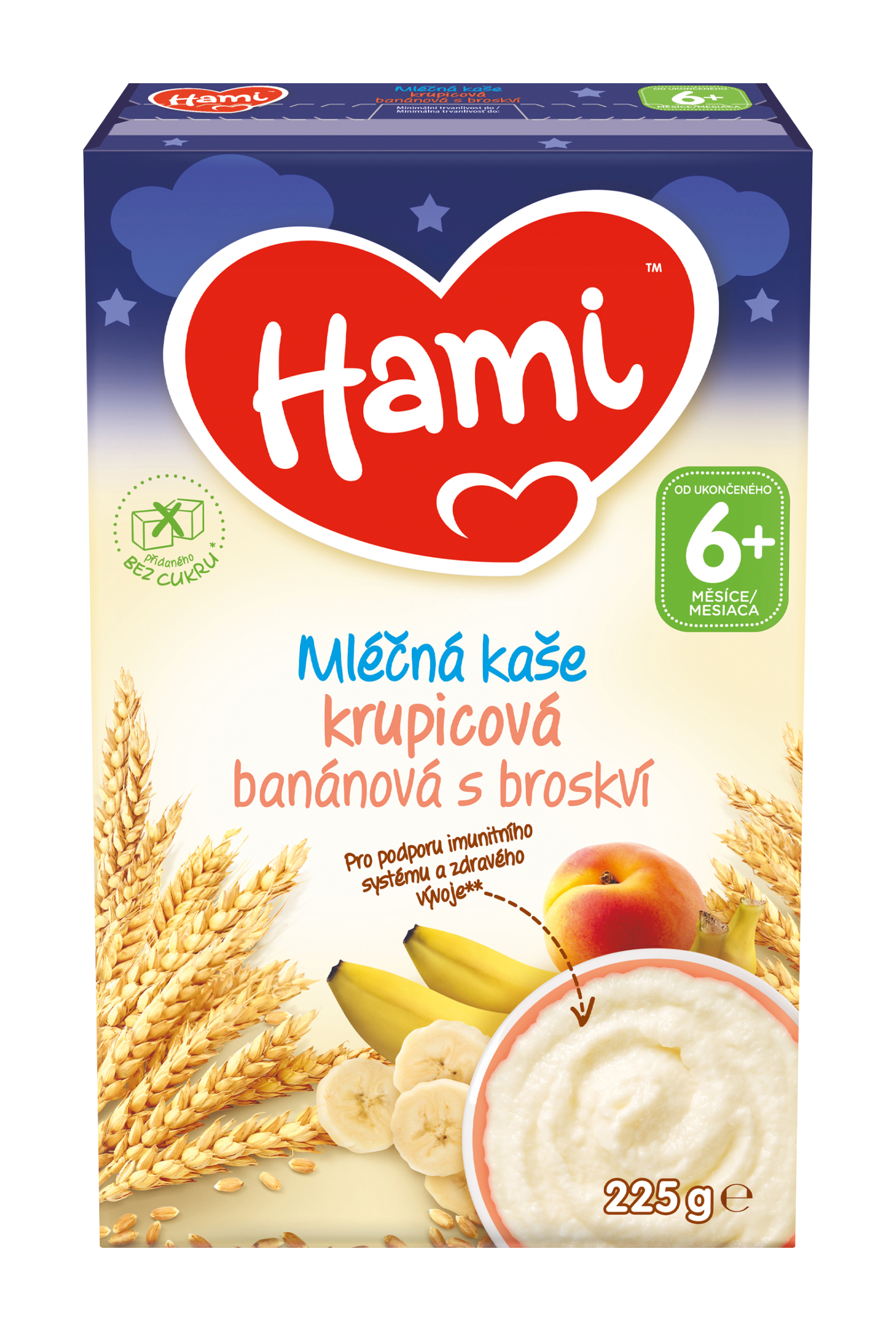 Hami mléčná kaše krupicová banánová s broskví bez přidaného cukru* je vhodná jako chutná večeře nebo snídaně pro malá bříška. Jedna porce kaše denně tak pomáhá postupně zavádět nové chutě obilnin či ovoce do jídelníčku a podporuje imunitní systém a zdravý vývoj** dítěte.