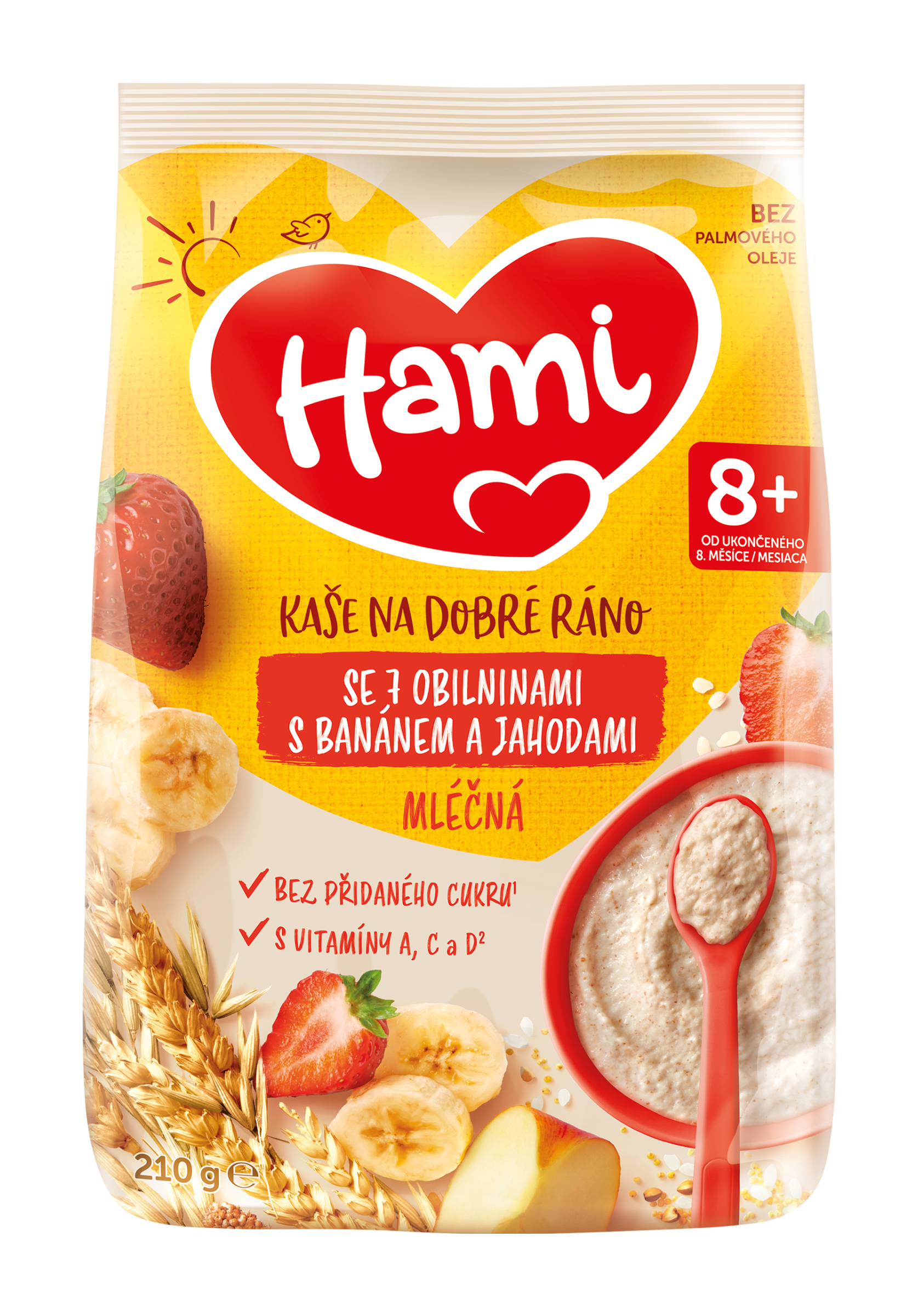Víme, že výživa dítěte v prvních 1000 dnech života hraje klíčovou roli pro jeho zdraví v dospělosti, a proto s Hami můžete mít jistotu, že Vaše děťátko dostává tu správnou výživu. Hami mléčná kaše se 7 obilninami s banánem a jahodami je vhodná volba pro večeři nebo snídani pro malá bříška. Obsahuje pečlivě vybrané obiloviny, které jsou přirozeným zdrojem energie. Díky pestrému výběru obilovin a ovoce doprovází děťátko během jeho přirozeného vývoje. Každá miska kaše obsahuje potřebné vitamíny A, D a B1**.