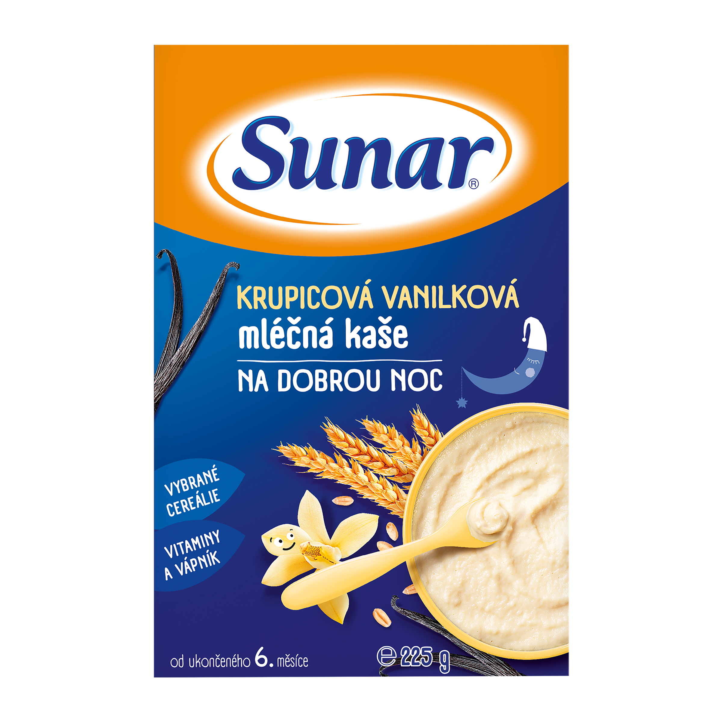 Sunar mléčná kaše na dobrou noc zajistí spokojené bříško před spaním. Vhodná pro děti od 6. uk. měsíce.
