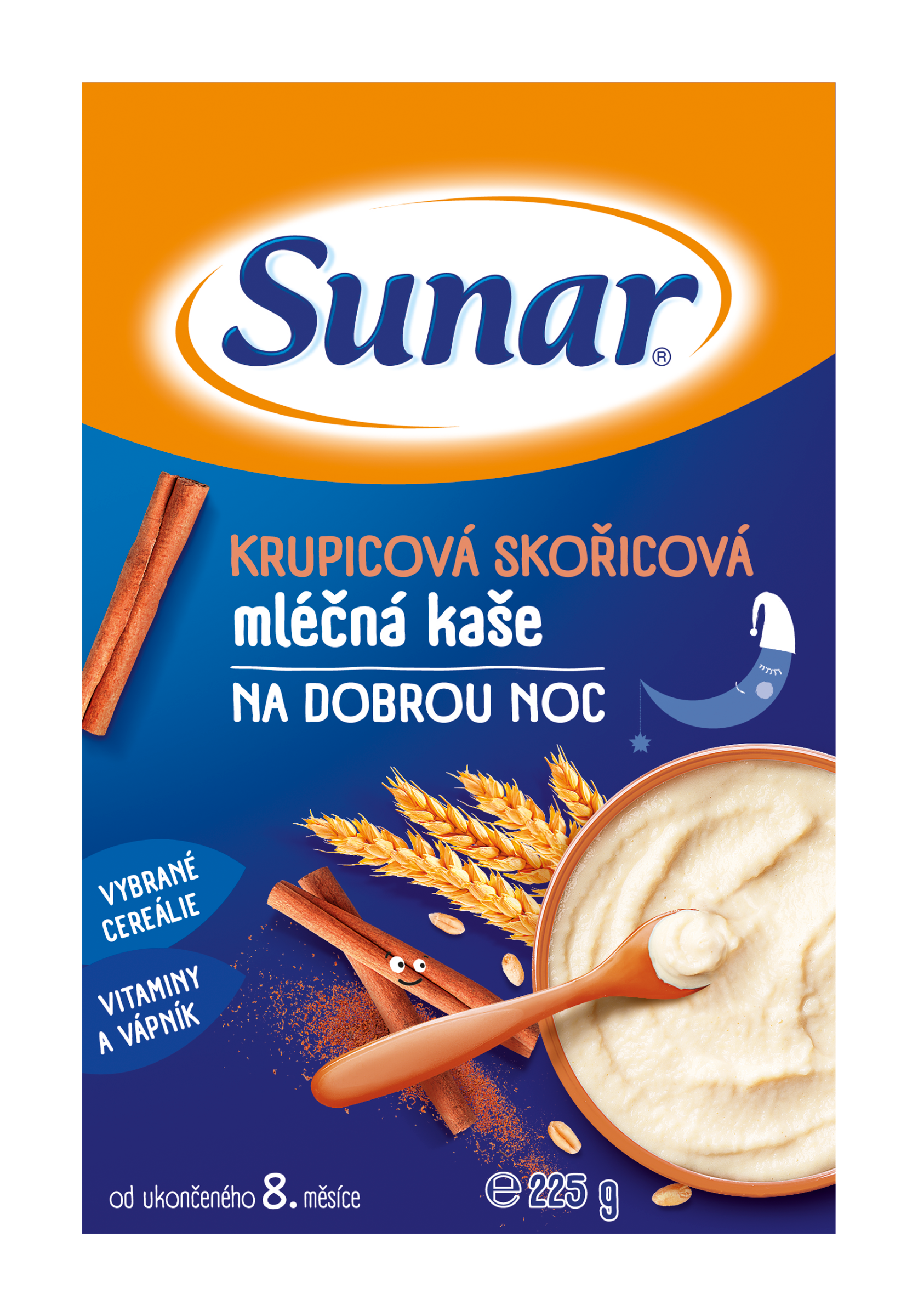 Sunar mléčná kaše na dobrou noc zajistí spokojené bříško před spaním. Vhodná pro děti od 8. uk. měsíce.