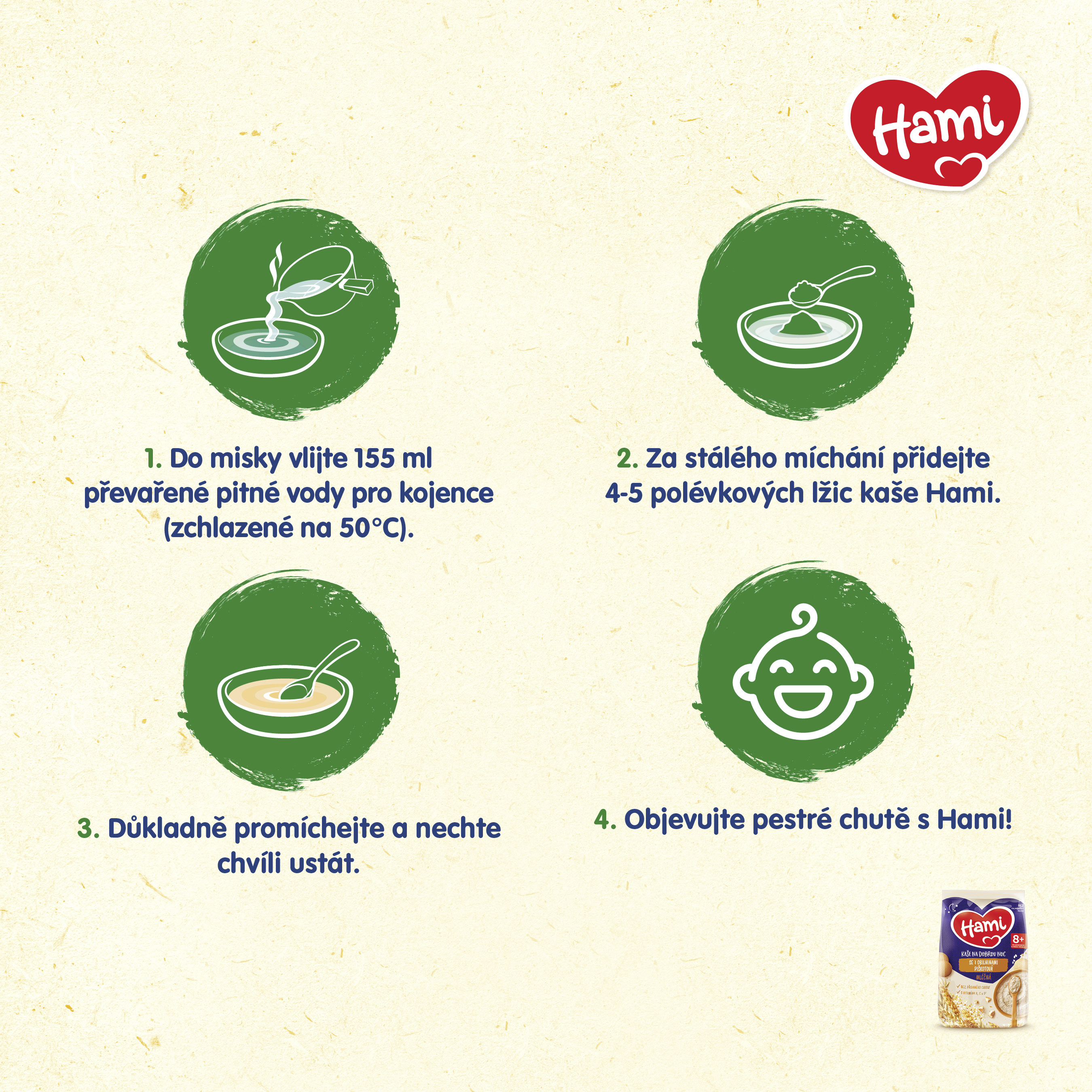 1. Na talíř nebo do misky vlijte 160 ml převařené pitné vody pro kojence zchlazené na 50 °C. 2. Za stálého míchání (šlehání vidličkou) přidejte 4-5 polévkových lžic (celkem 40 g) kaše Hami. Hustotu kaše můžete dle potřeby upravit přidáním vody či prášku. 3. Důkladné promíchejte a nechte chvíli ustát. Na přípravu použijte vždy jen suchou lžíci. Kaši připravujte a podávejte vždy čerstvou. Nedojedenou porci už znovu nepodávejte, zlikvidujte ji. Důležité je důsledné dodržování návodu na přípravu.