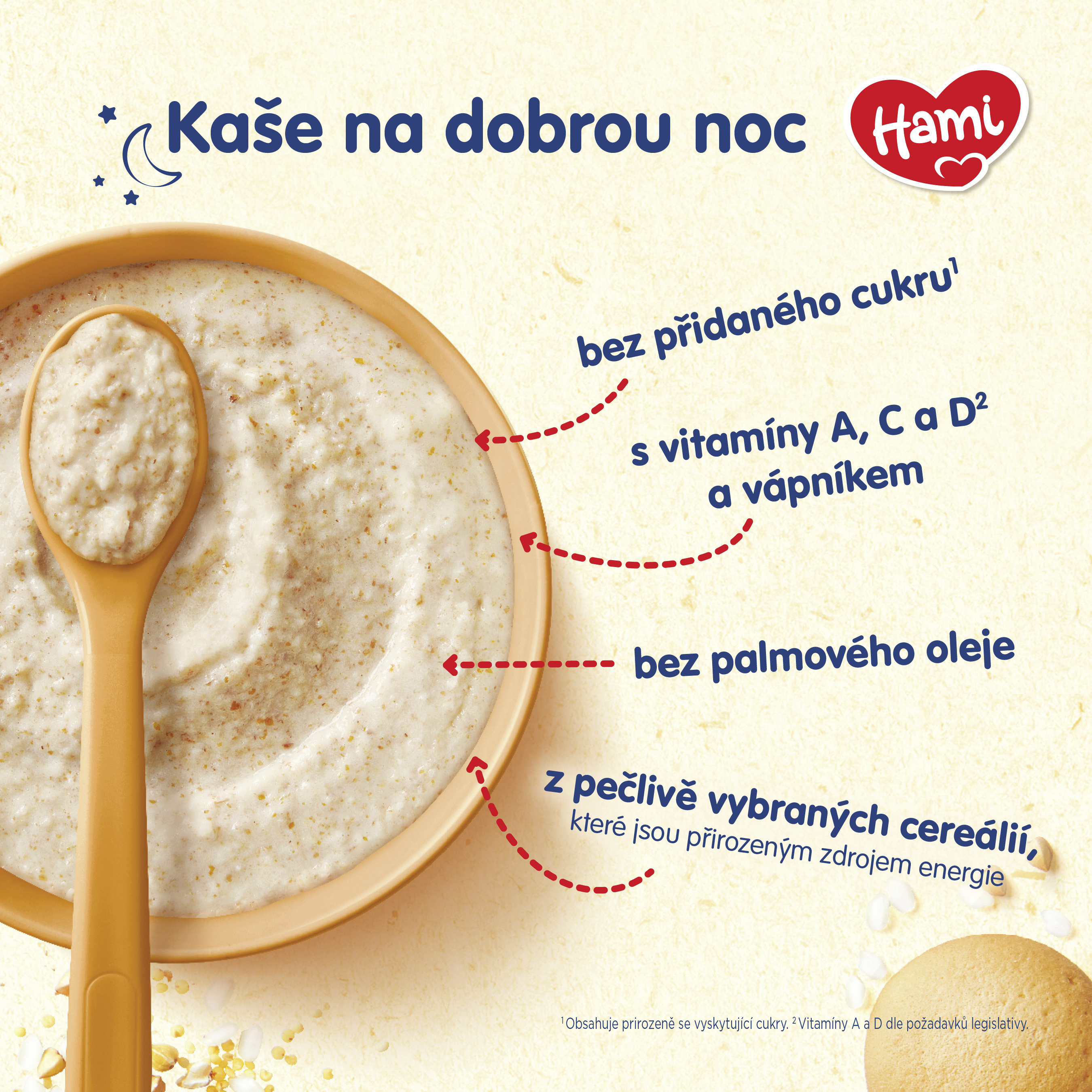 Hami mléčná kaše se 7 obilninami piškotová na dobrou noc je obilný příkrm určený pro kojence a malé děti od ukončeného 8. měsíce. Potravina má být pouze součástí smíšené a vyvážené stravy dítěte, není náhradou mateřského ani kojeneckého mléka. Dohlédněte na hygienu ústní dutiny v období růstu prvních zoubků, především před spaním.