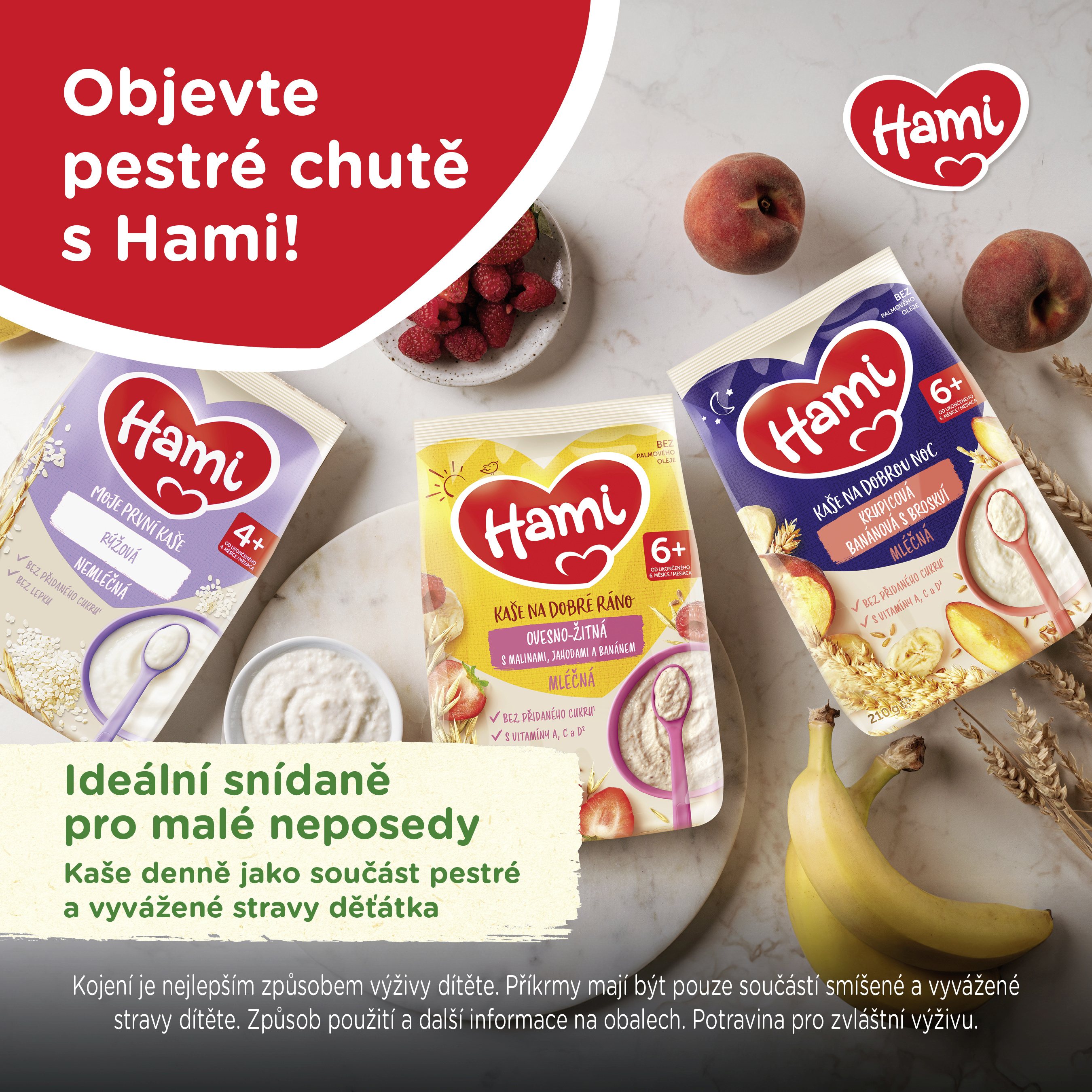 Obilniny tvoří důležitou součást zdravé a pestré stravy děťátka, proto by neměly chybět v každodenním jídelníčku vašeho nezbedy. Při přechodu z mléka na pevnou stravu jsou kaše skvělou volbou například na snídani, která dodá Vašemu děťátku energii do dalšího dne plného nových objevů. Hami kaše jsou vyrobeny z pečlivě kontrolovaných obilovin, které jsou přirozeným zdrojem energie. Také obsahují potřebné vitamíny a minerální látky. Navíc Hami kaše skvěle chutnají a dobře se rozpouští! Hami mléčné kaše se dále skládají z pečlivě vybraného mléka a třeba i ovoce, které se sbírá v optimální době zralosti, usuší a zpracuje do vloček nebo ovocného prášku, který se následně smíchá s kašičkou, aby byla plná pestrých chutí a vůní. Víme, že výživa dítěte v prvních 1000 dnech života hraje klíčovou roli pro jeho zdraví v dospělosti, a proto s Hami můžete mít jistotu, že Vaše děťátko dostává tu správnou výživu.