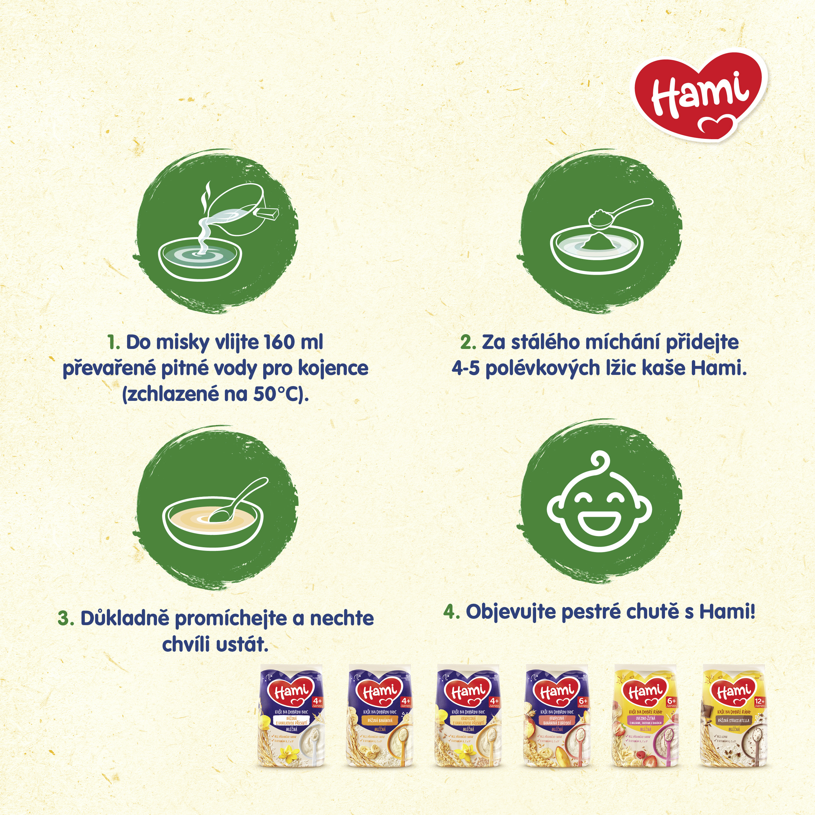 1. Na talíř nebo do misky vlijte 160 ml převařené pitné vody pro kojence zchlazené na 50 °C. 2. Za stálého míchání (šlehání vidličkou) přidejte 4-5 polévkových lžic (celkem 40 g) kaše Hami. Hustotu kaše můžete dle potřeby upravit přidáním vody či prášku. 3. Důkladné promíchejte a nechte chvíli ustát. Na přípravu použijte vždy jen suchou lžíci. Kaši připravujte a podávejte vždy čerstvou. Nedojedenou porci už znovu nepodávejte, zlikvidujte ji. Důležité je důsledné dodržování návodu na přípravu.