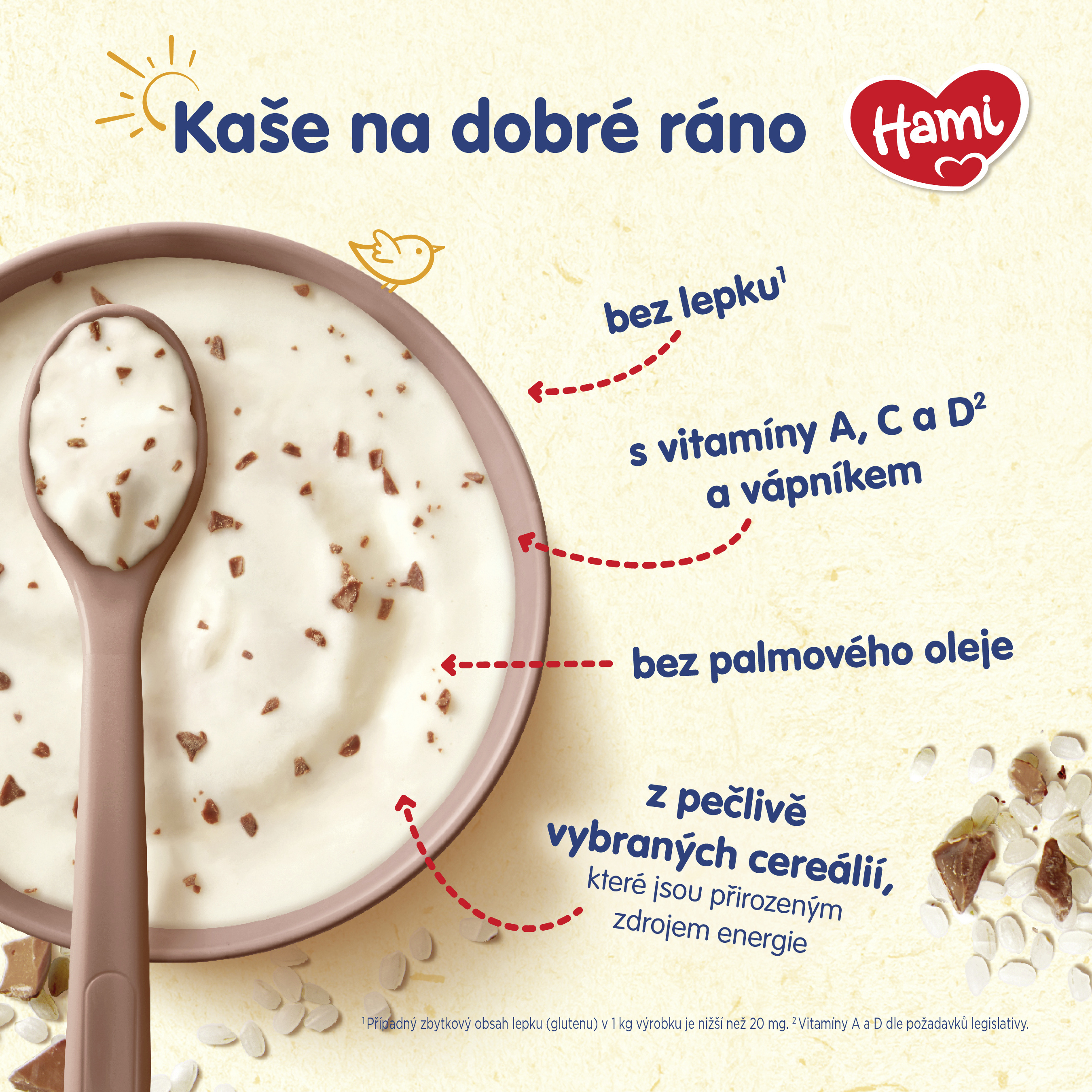 Obilniny tvoří důležitou součást zdravé a pestré stravy děťátka, proto by neměly chybět v každodenním jídelníčku vašeho nezbedy. Při přechodu z mléka na pevnou stravu jsou kaše skvělou volbou například na snídani, která dodá Vašemu děťátku energii do dalšího dne plného nových objevů. Hami kaše jsou vyrobeny z pečlivě kontrolovaných obilovin, které jsou přirozeným zdrojem energie. Také obsahují potřebné vitamíny a minerální látky. Navíc Hami kaše skvěle chutnají a dobře se rozpouští! Hami mléčné kaše se dále skládají z pečlivě vybraného mléka a třeba i ovoce, které se sbírá v optimální době zralosti, usuší a zpracuje do vloček nebo ovocného prášku, který se následně smíchá s kašičkou, aby byla plná pestrých chutí a vůní. Víme, že výživa dítěte v prvních 1000 dnech života hraje klíčovou roli pro jeho zdraví v dospělosti, a proto s Hami můžete mít jistotu, že Vaše děťátko dostává tu správnou výživu.