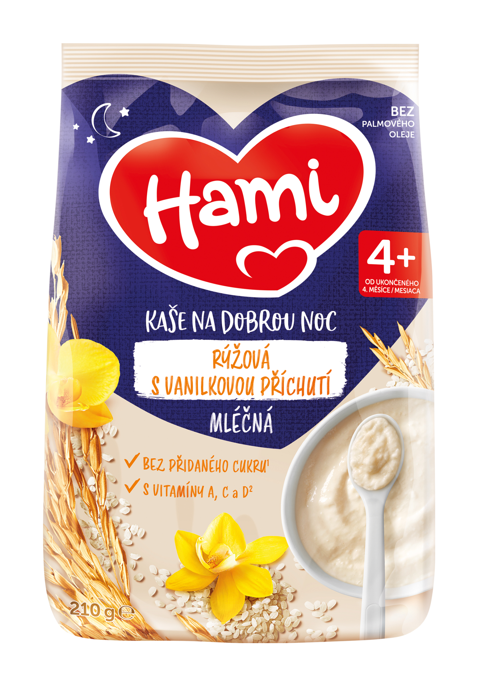 Víme, že výživa dítěte v prvních 1000 dnech života hraje klíčovou roli pro jeho zdraví v dospělosti, a proto s Hami můžete mít jistotu, že Vaše děťátko dostává tu správnou výživu. Hami mléčná kaše rýžová s vanilkovou příchutí je vhodná jako chutná večeře nebo snídaně pro malá bříška. Obsahuje obilniny (rýži), které jsou přirozeným zdrojem energie pro každý den plný zážitků. Jedna porce kaše denně tak pomáhá postupně zavádět nové chutě obilnin či ovoce do jídelníčku děťátka.