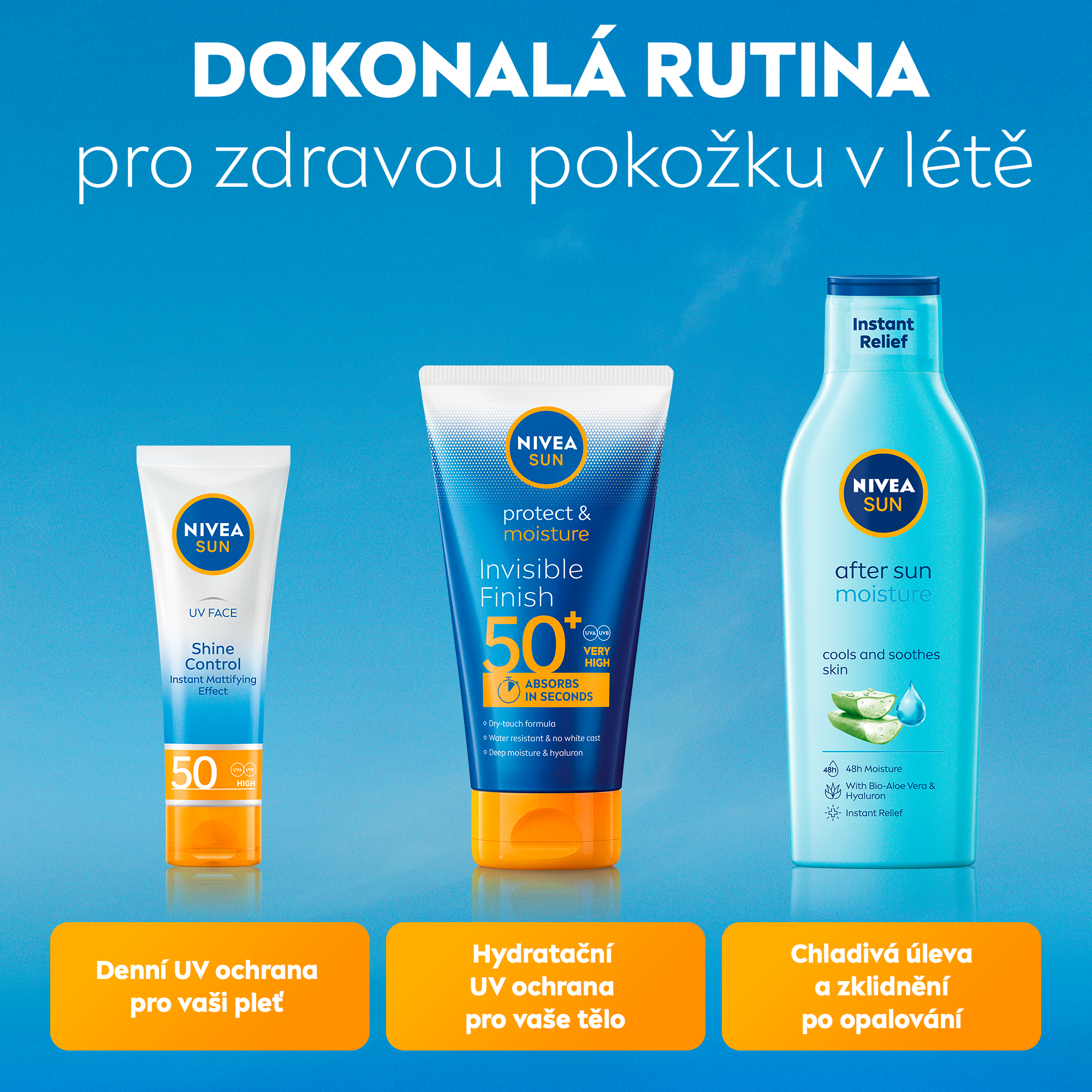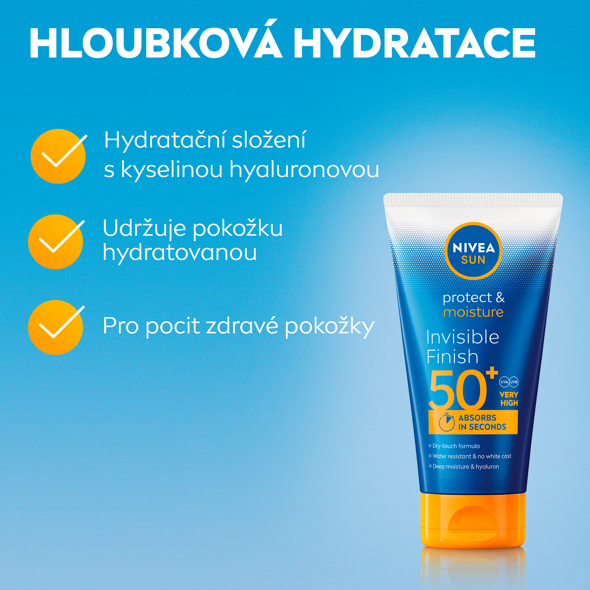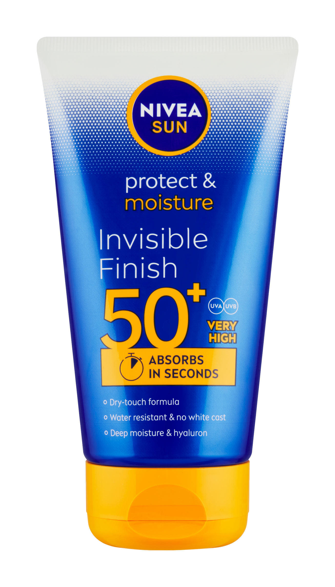Tělové mléko Nivea Sun Protect & Moisture Invisible Finish na opalování s vysokým SPF 50+ se rychle vstřebává do pokožky během několika sekund a nezanechává bílé stopy. Voděodolné složení obsahuje kyselinu hyaluronovou, která hloubkově hydratuje pokožku a zanechává ji hebkou na dotek. UVA/UVB filtry poskytují okamžitou a spolehlivou UV ochranu, zatímco složení účinně bojuje proti oxidačnímu stresu na buněčné úrovni.* Dermatologicky testováno a vhodné pro všechny typy pokožky. Dopřejte své pokožce účinnou ochranu před sluncem a škodlivým UVA/UVB zářením, které způsobuje předčasné stárnutí a nevratné poškození kůže.