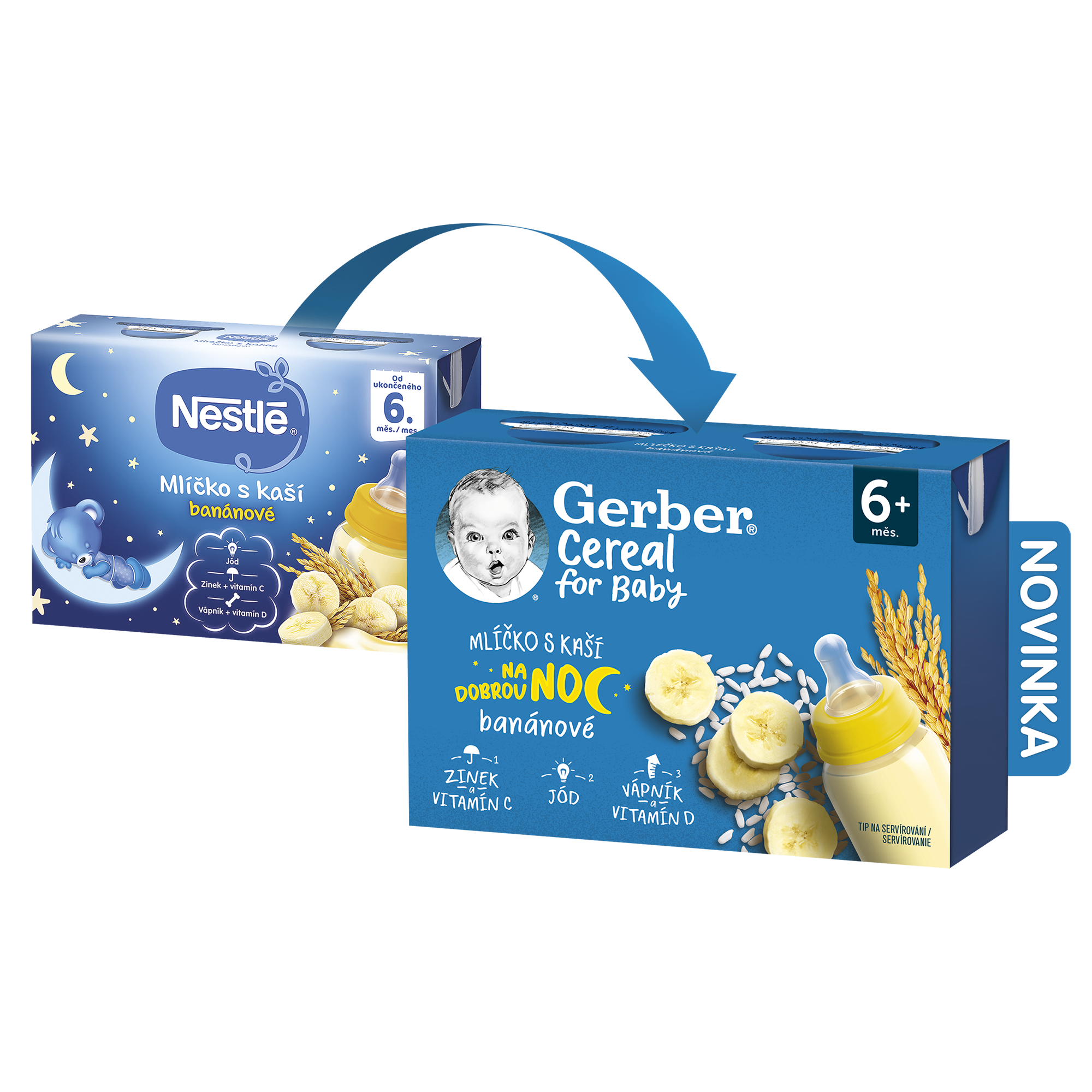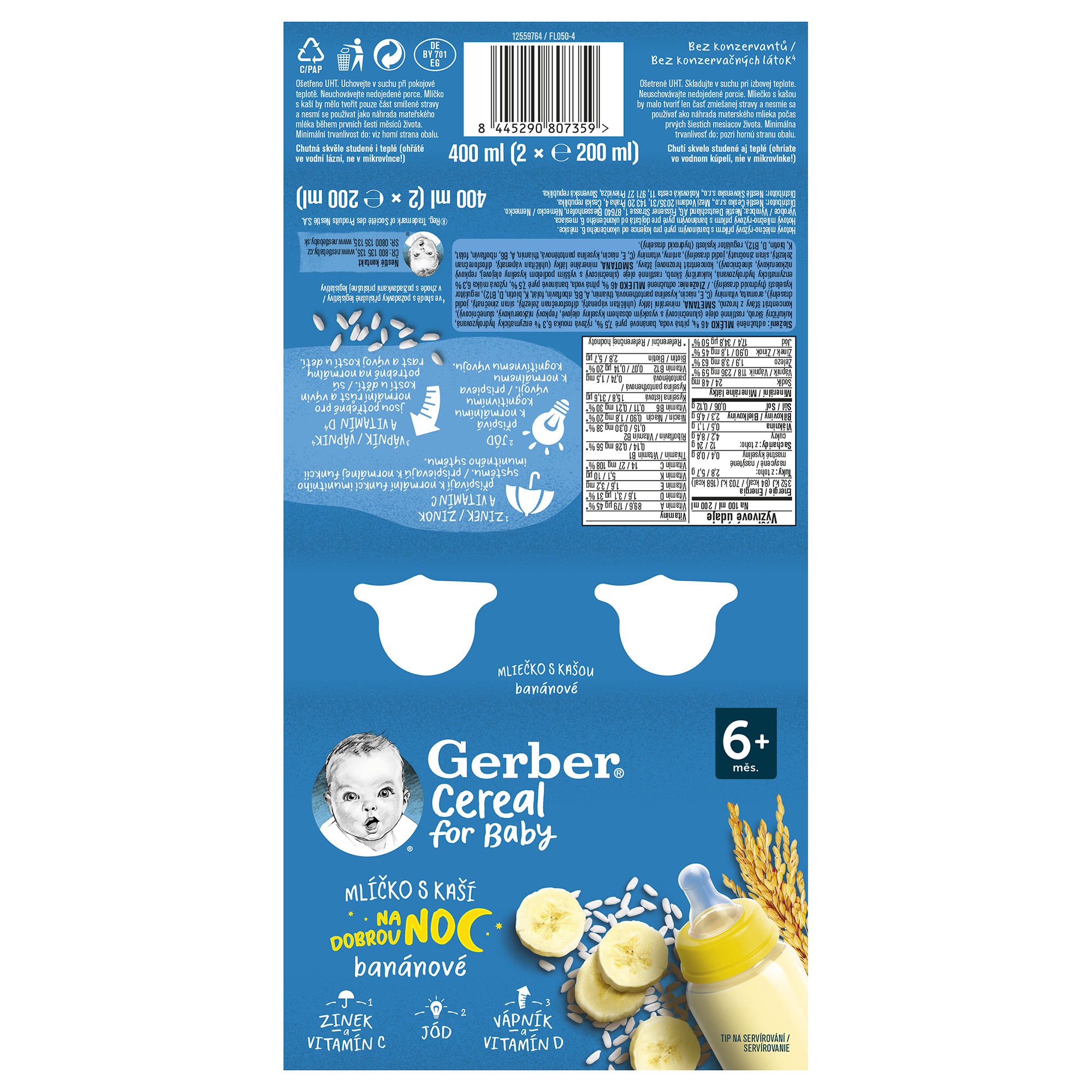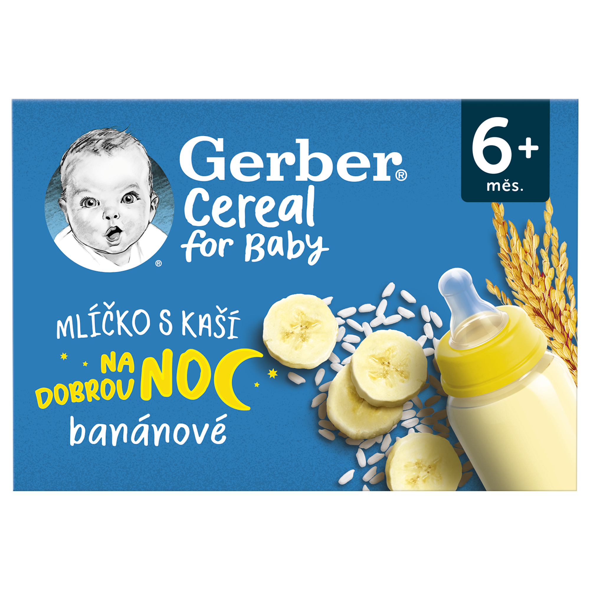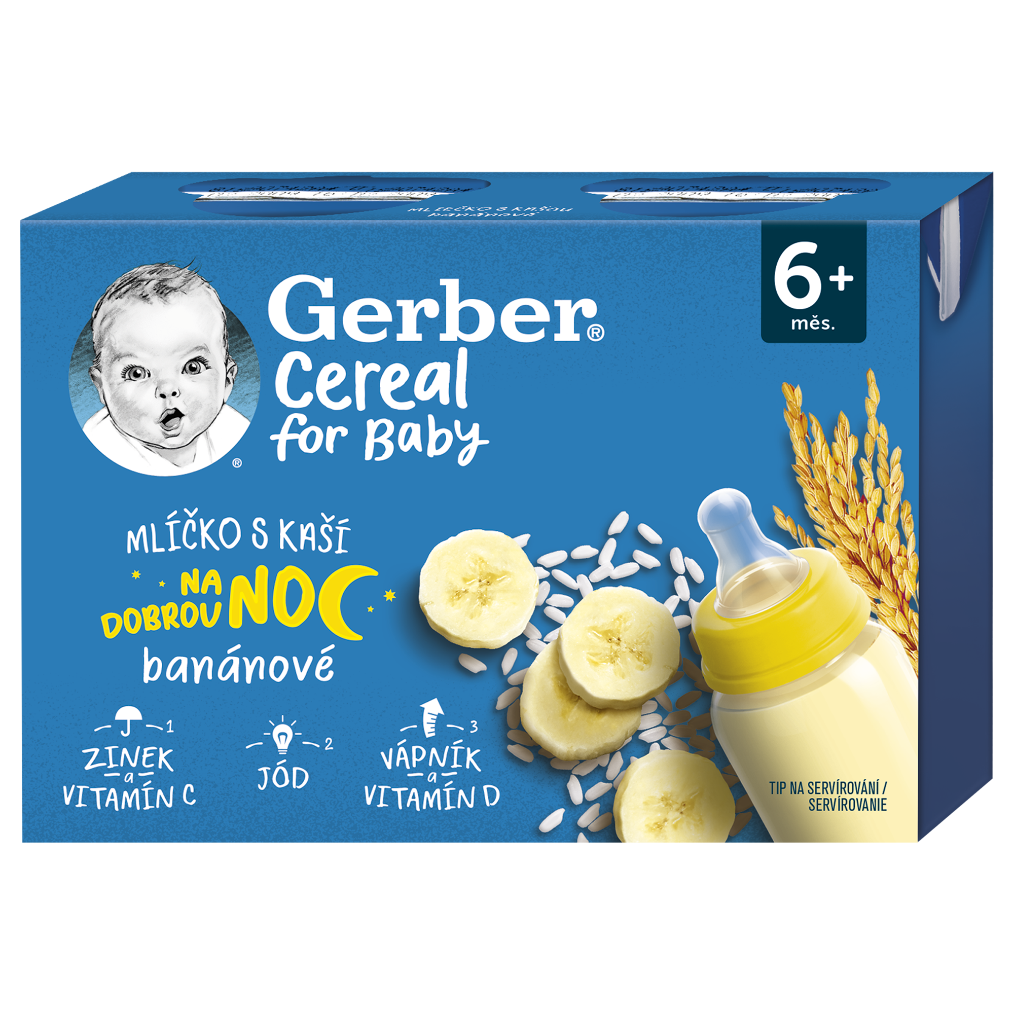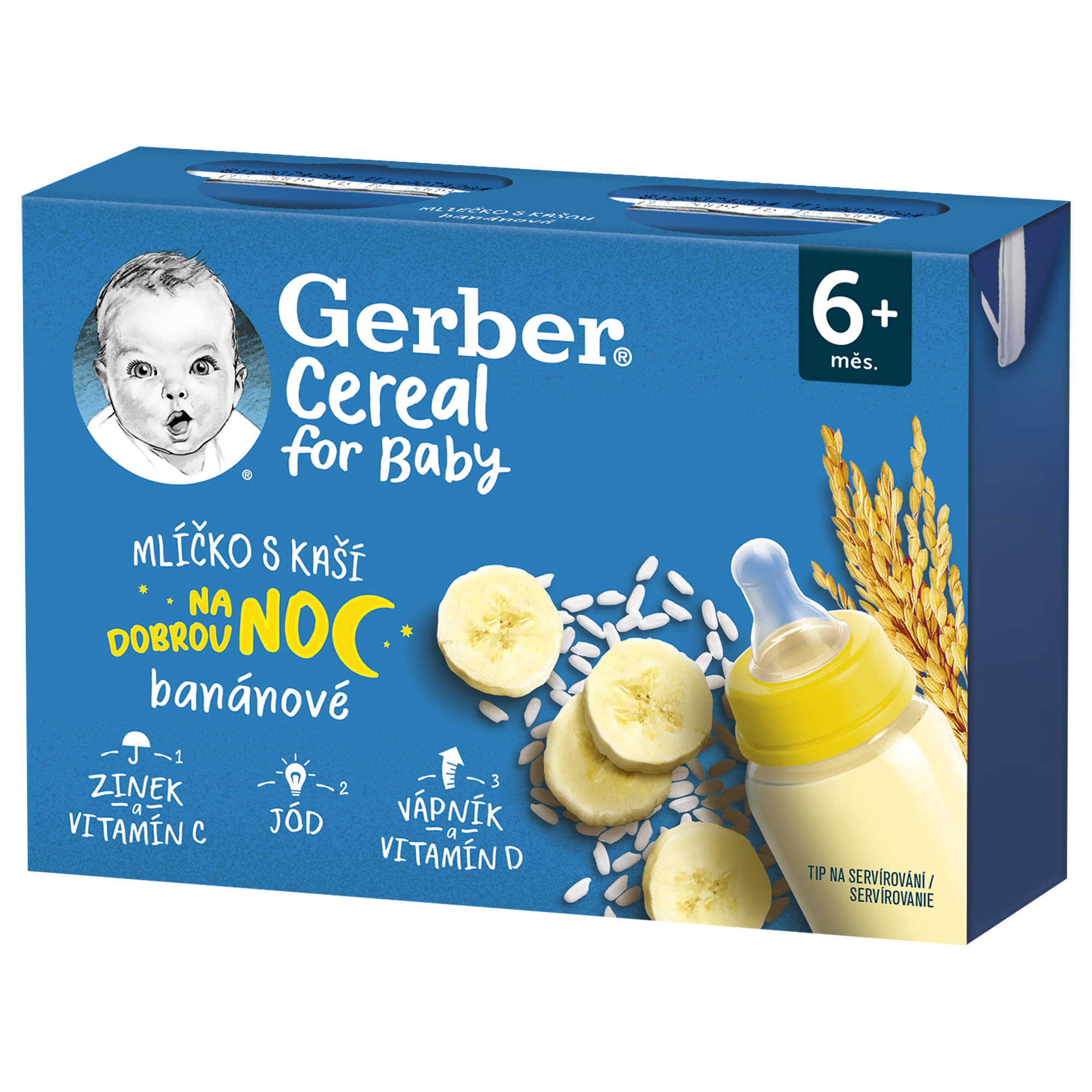 GERBER Cereal mlíčko s kaší banánové 2x200 ml. Hotový mléčno-rýžový příkrm s banánovým pyré pro kojence od ukončeného 6. měsíce. GERBER Cereal mlíčko s kaší banánové je hotový příkrm, který uspokojí i ta nejnáročnější bříška našich nejmenších. Lahodná mléčno-rýžová dobrota je vyrobena z kvalitního mléka a zahuštěna kaší s chutí sladkého banánu. Mlíčko je vhodné pro kojence od ukončeného 6. měsíce. Mlíčko s kaší obsahuje řadu minerálních látek a také 13 vitamínů, které napomáhají zdravému růstu a vývoji dítěte.