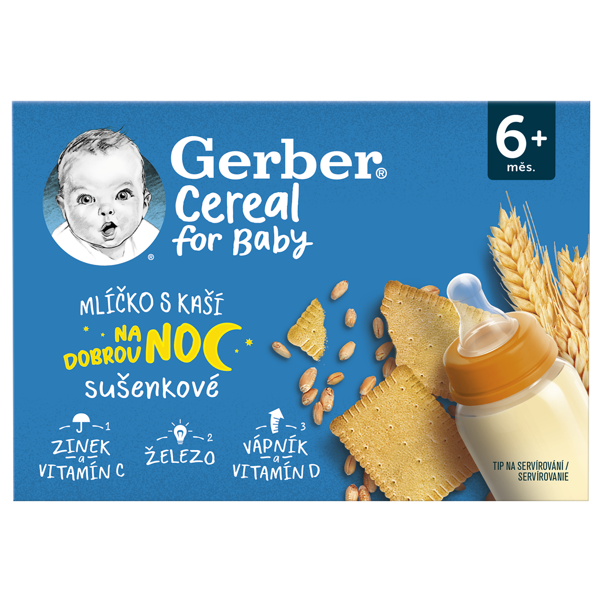 Hotový mléčno-obilný příkrm s drcenými sušenkami pro kojence od ukončeného 6. měsíce. GERBER Cereal mlíčko s kaší sušenkové je hotový příkrm, který uspokojí i ta nejnáročnější bříška našich nejmenších. Lahodná mléčno-obilná dobrota je vyrobena z kvalitního mléka a zahuštěna kaší s drcenými sušenkami. Mlíčko je vhodné pro kojence od ukončeného 6. měsíce. Mlíčko s kaší obsahuje řadu minerálních látek a také 13 vitamínů, které napomáhají zdravému růstu a vývoji dítěte. Vápník* a vitamín D* jsou potřebné pro normální růst a vývin kostí u dětí, železo přispívá k rozvoji poznávacích funkcí dětí a zinek s vitamínem C přispívají k normální funkci imunitního systému dítěte. Mlíčko s kaší navíc neobsahuje konzervanty* a palmový olej. Mlíčko s kaší chutná skvěle studené i teplé, což z něj činí praktickou volbu na každý den. Je ihned připraveno k použití - stačí odstřihnout roh a nalít do lahvičky, případně jej můžete ohřát ve vodní lázni (ne v mikrovlnce), a můžete podávat. Jedno balení mléčno-obilných příkrmů GERBER Cereal obsahuje dvě porce po 200 ml, které vystačí na dvě denní jídla malého mlsouna. *Ve shodě s požadavky příslušné legislativy.