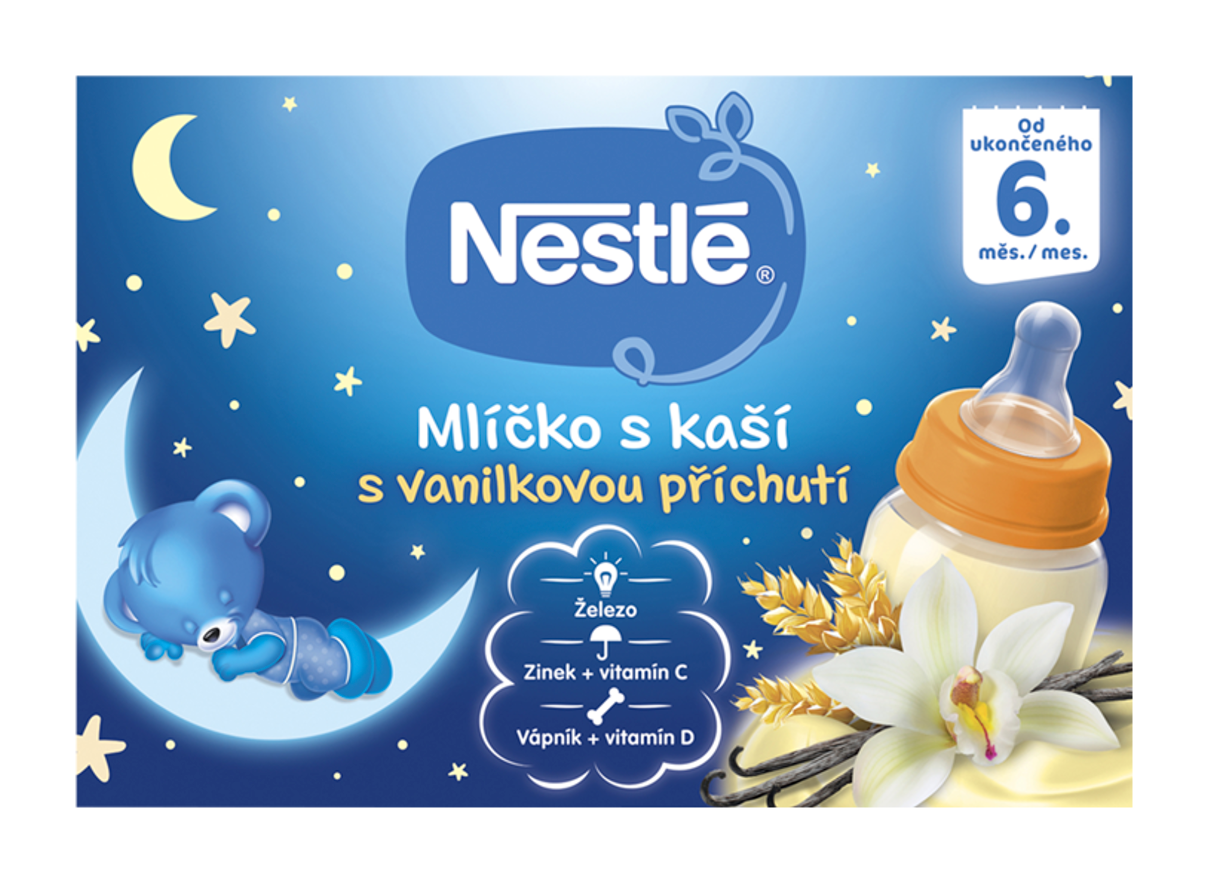 NESTLÉ Mlíčko s kaší s vanilkovou příchutí je hotový příkrm pro kojence od ukončeného 6. měsíce, který uspokojí i ta nejnáročnější bříška našich nejmenších. Je připraveno z kvalitního mléka a zahuštěné oblíbenou kaší. Mlíčko s kaší je takto připravené k okamžitému krmení, stačí odstřihnout roh a nalít do lahvičky, případně ohřát a můžete podávat.