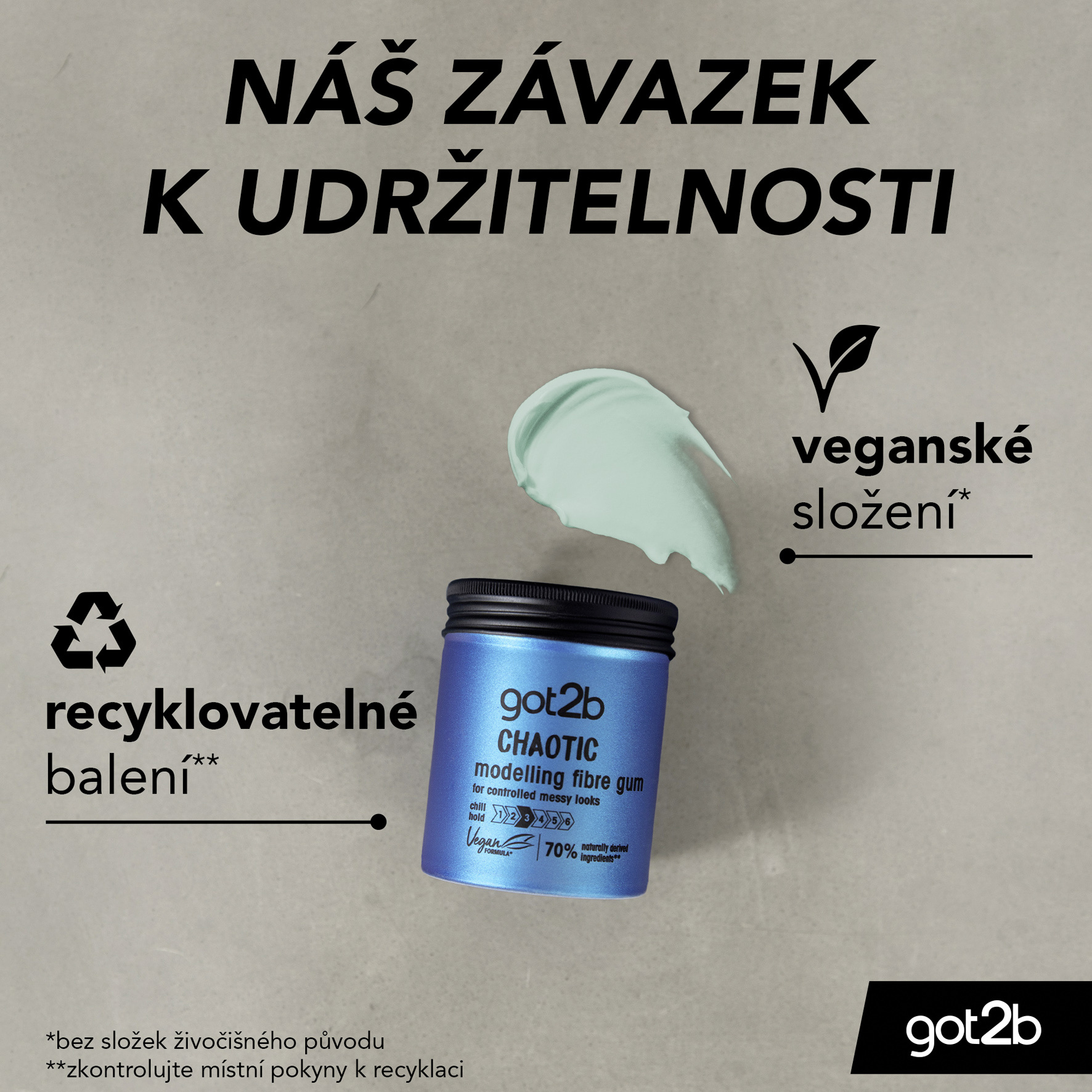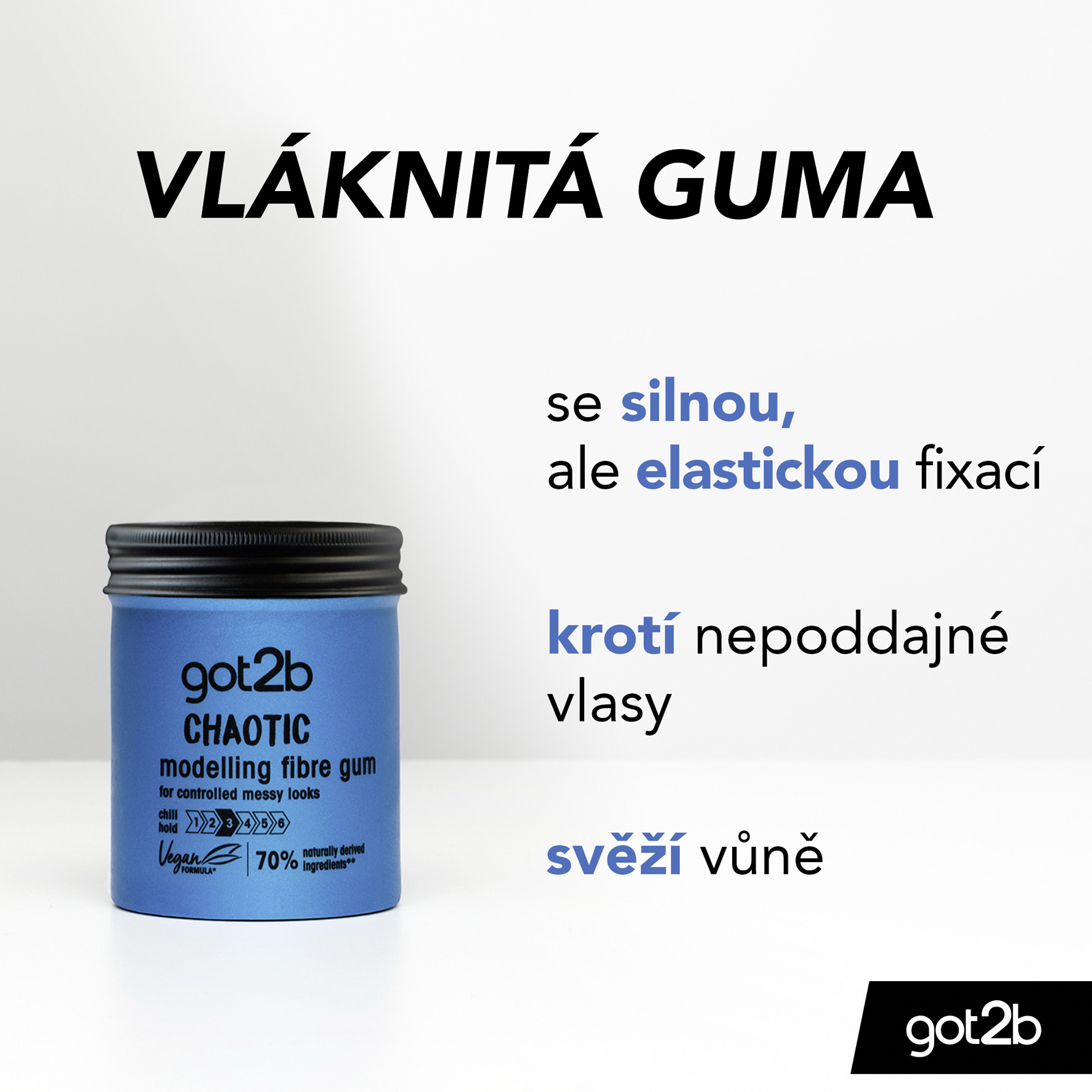 - Vláknitá guma: Zabraňte divokému poletování vlasů! Tato got2b Chaotic modelovací vláknitá guma je ideální pro tvarování, styling a zkrocení i těch nejdivočejších vlasů.