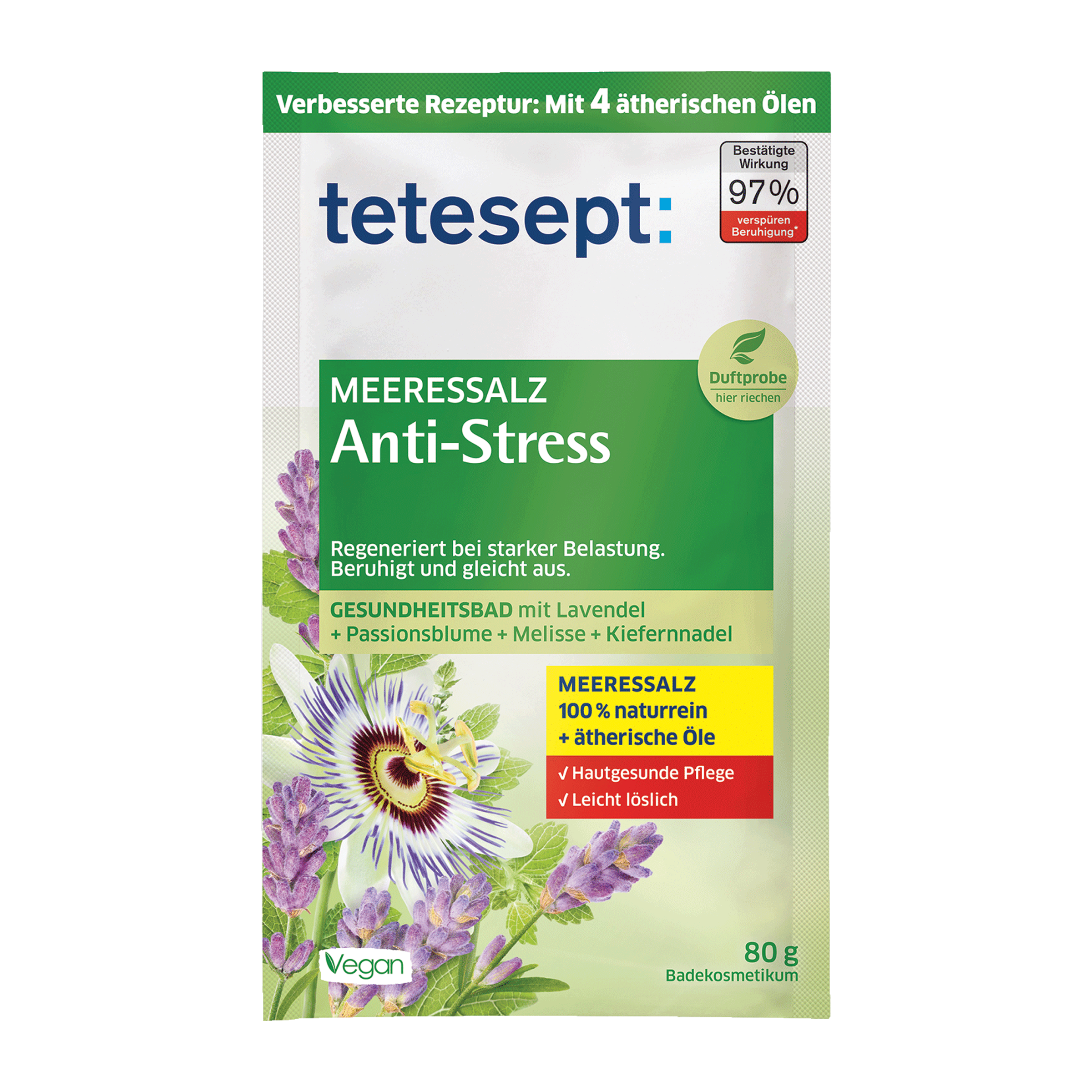 Koupelová sůl tetesept Proti stresu je speciální přísada koupele obsahující mořskou sůl a navracející rovnováhu při stresu, zátěži a napětí. Unikátní složení kombinuje levandulový olej, meduňkový olej, borovicový olej a mučenku. Tato kombinace byla vybrána na základě konkrétní potřeby zklidnění při stresu a napětí. Éterické oleje se ve spojení s teplou vodou rozpínají což umocňuje jejich uklidňující účinek. Pomáhají vám se zastavit a najít vnitřní klid. Zažijte jak regeneraci těla, tak i mysli. Kromě toho mořská sůl tetesept udržuje pokožku zdravou přirozeným způsobem díku obsahu minerálů.