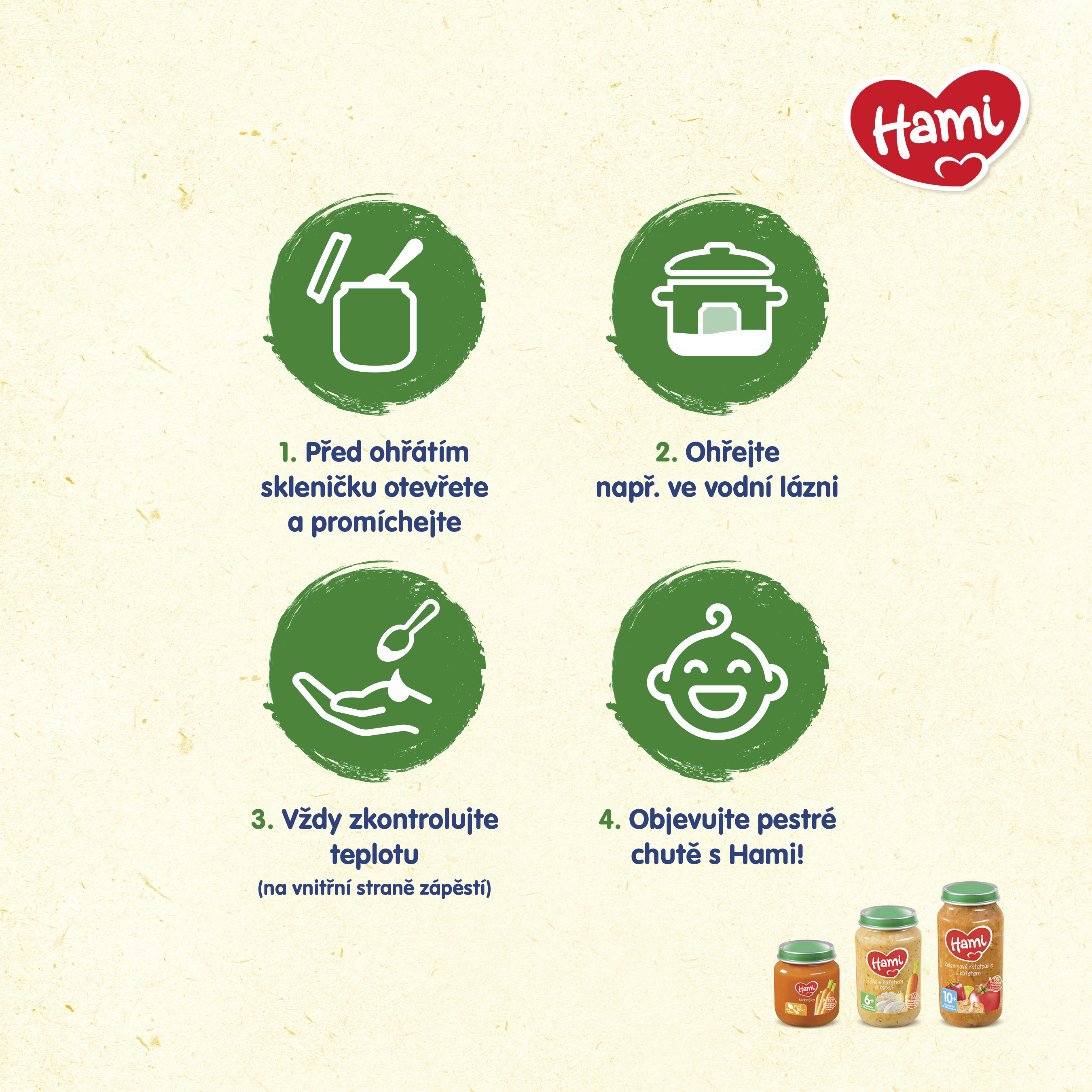 Při otevření musí víčko klapnout. Před ohřátím skleničku otevřete, promíchejte a ohřejte (nevařit) např. ve vodní lázni. Před podáváním zkontrolujte teplotu! Jednou ohřátou část již neuchovávejte. Nespotřebované množství uchovávejte v uzavřené skleničce v chladničce a spotřebujte do 48 hodin. Nepoužívejte kovovou lžičku, sklenička by se mohla poškodit. Potravina je součástí smíšené stravy dítěte.