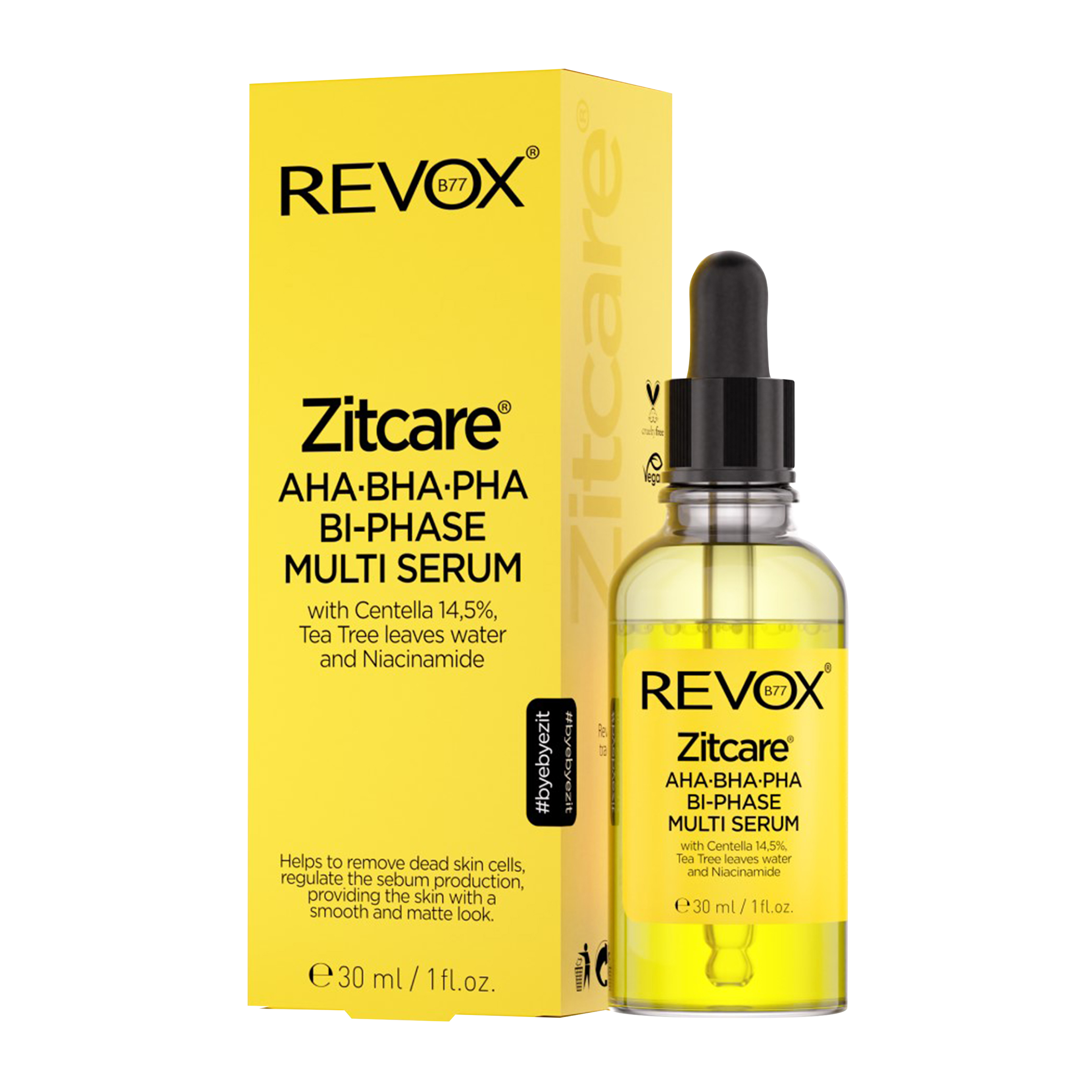 Díky obsahu extraktu z čajovníku má přípravek zklidňující vlastnosti a zlepšuje vzhled velkých pórů. Pupečník asijský pomáhá posilovat ochrannou bariéru, zabraňuje nadměrné ztrátě vlhkosti a udržuje pokožku hydratovanou. Niacinamid napomáhá při vyhlazování pokožky a celkově zlepšuje její texturu. Pro dosažení maximálních výsledků kombinujte s dalšími produkty řady REVOX B77 ZITCARE®.
